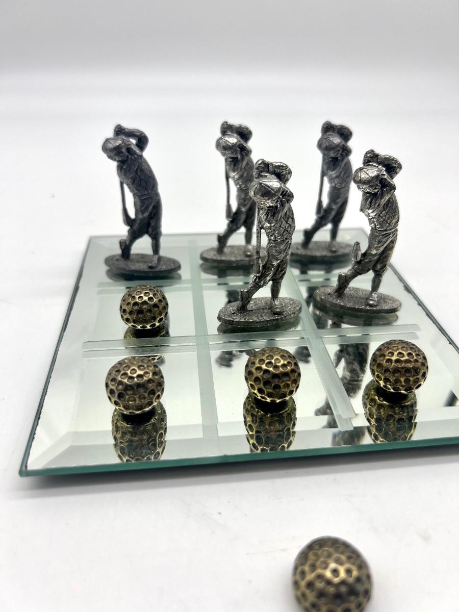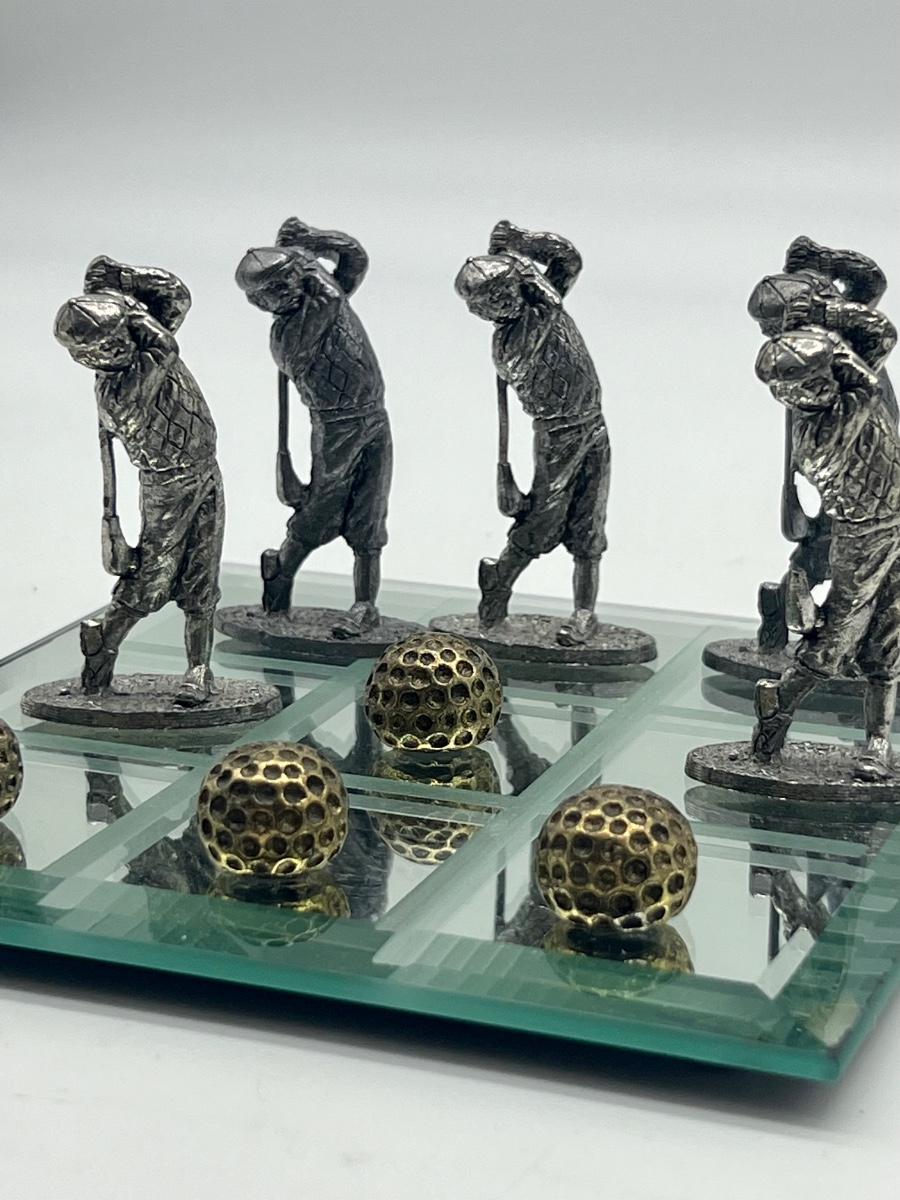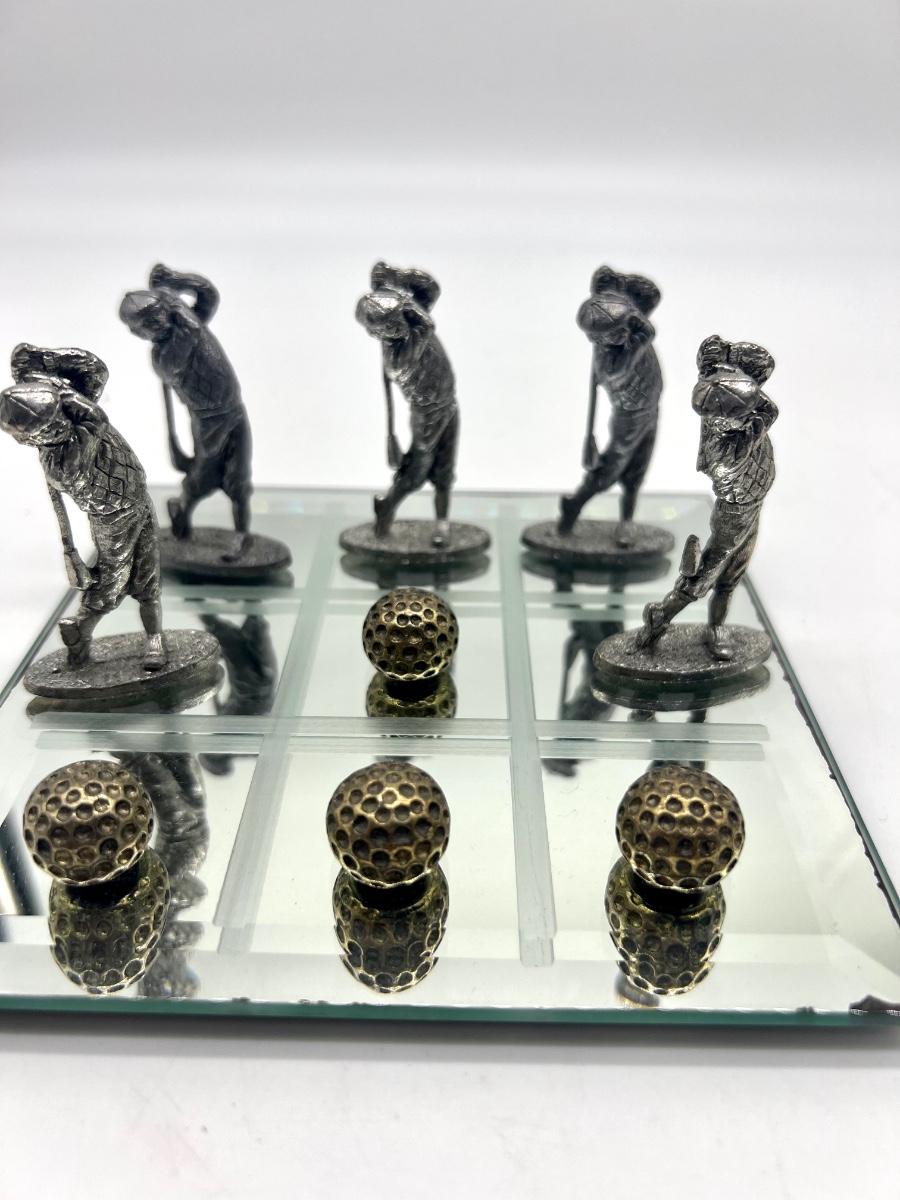 Pewter Golf Tic Tac Toe Game Comes with 5 golf swinging men and 5 golf balls. One golf men is missing part of golf club, see picture. Men measure approximately 2 1/2 inches inches tall