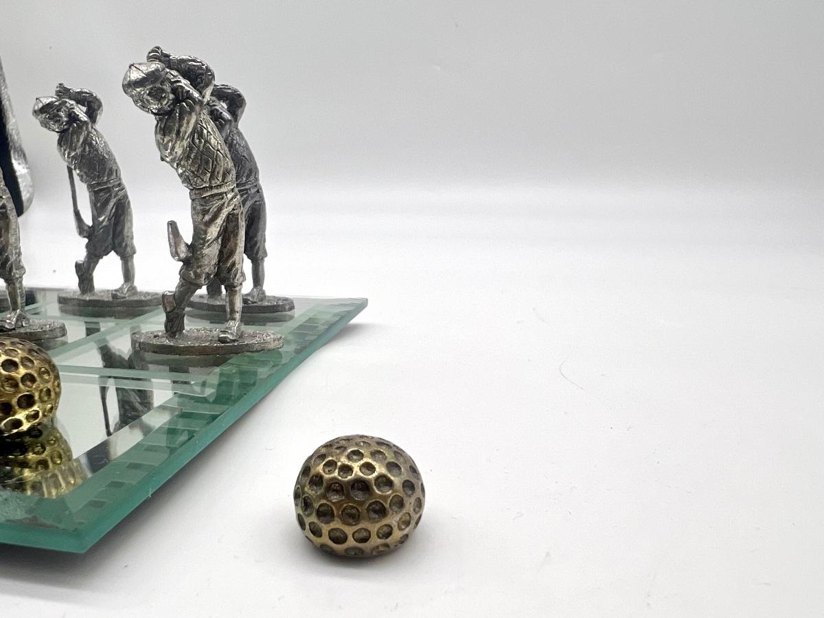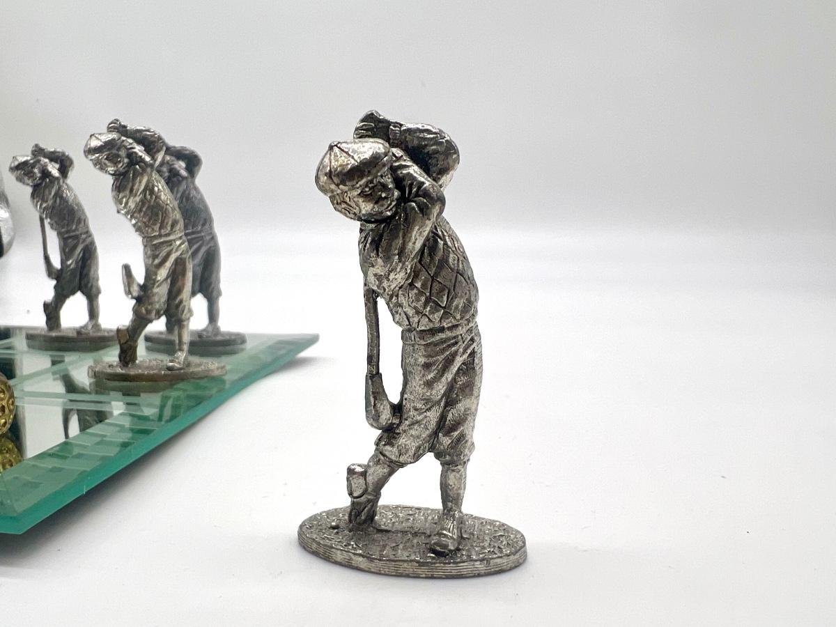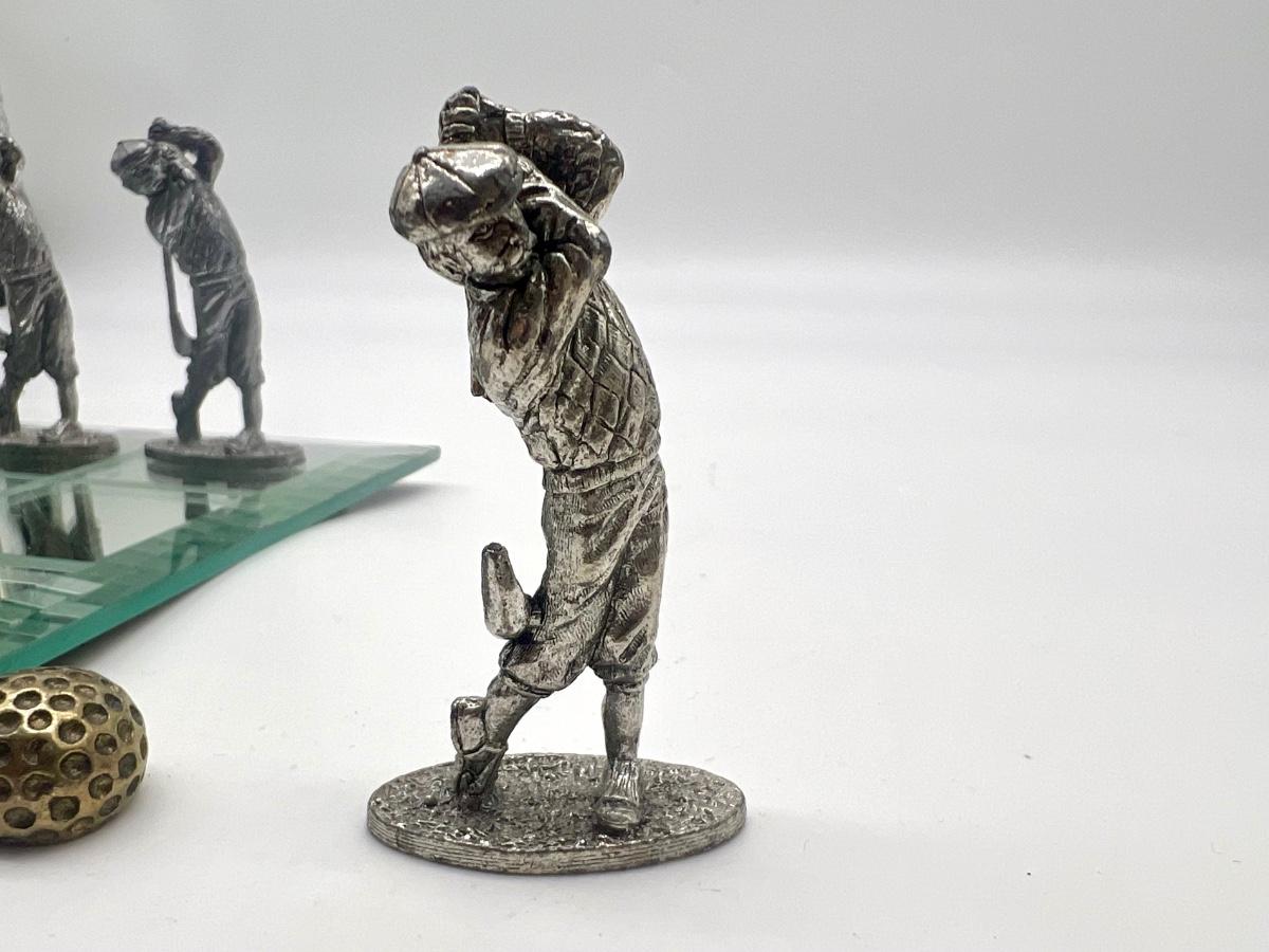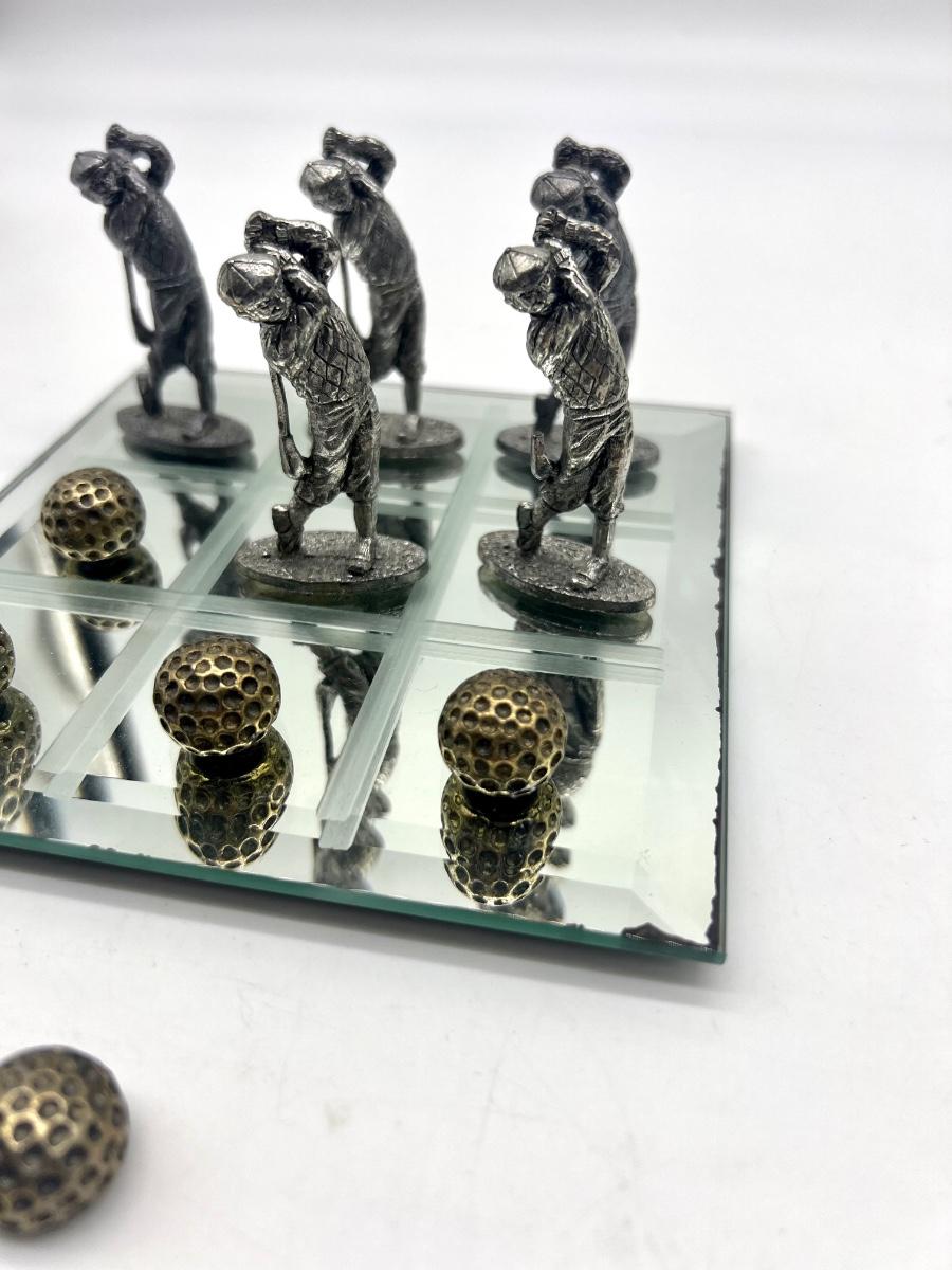 Pewter Golf Tic Tac Toe Game Comes with 5 golf swinging men and 5 golf balls. One golf men is missing part of golf club, see picture. Men measure approximately 2 1/2 inches inches tall