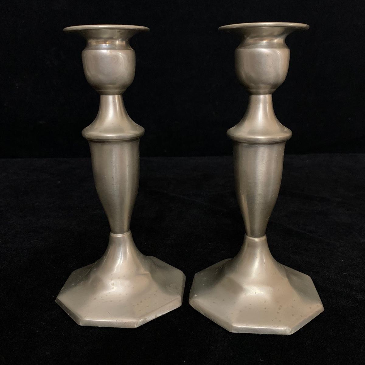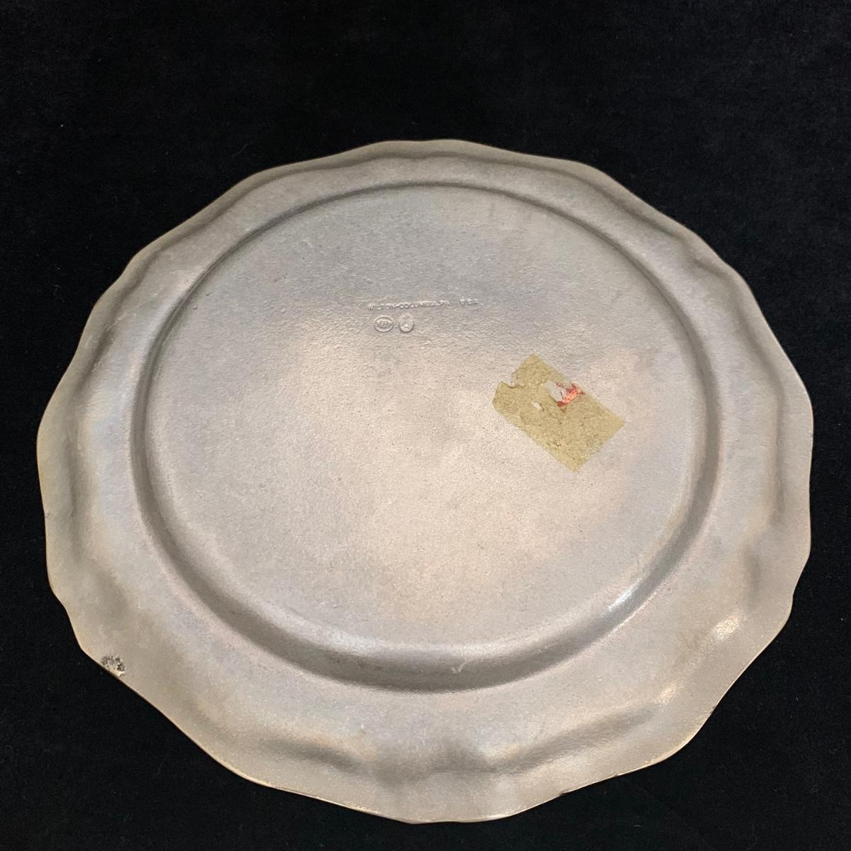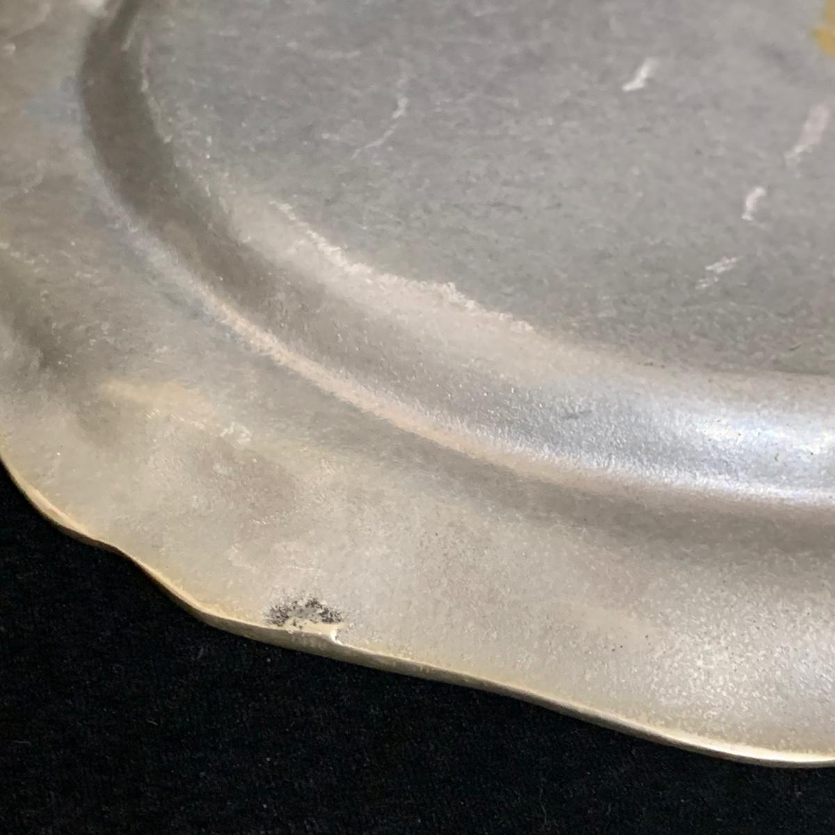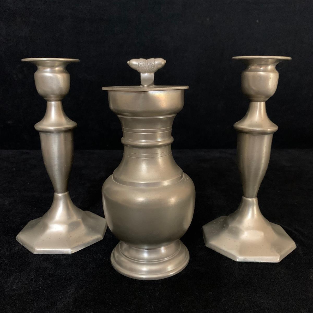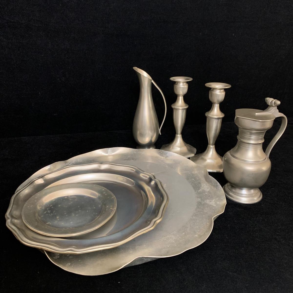 Seven total items in this collection. Some items are pewter and some are pewter-like. Pewter-marked items include: a Royal Holland Daalderop Pewter pitcher, a 6”d Wilton Columbia pewter plate, and a 10.5” Wilton Columbia pewter plate. Also included are two metal candlesticks with protective felt bottoms, a lidded pitcher with acorn finial, and a 15”d floral tray with scalloped edges. The lidded pitcher is marked “95%”. It is in good condition with minimal signs of wear. All other items have signs of wear and/or small blemishes.