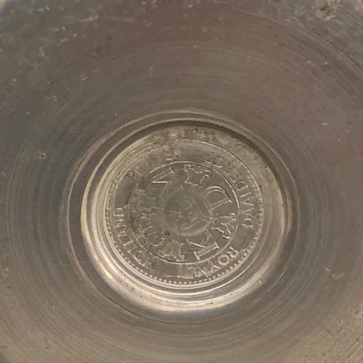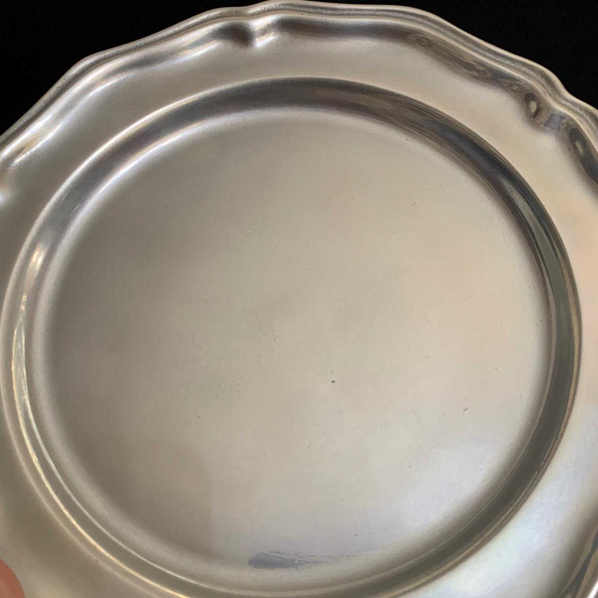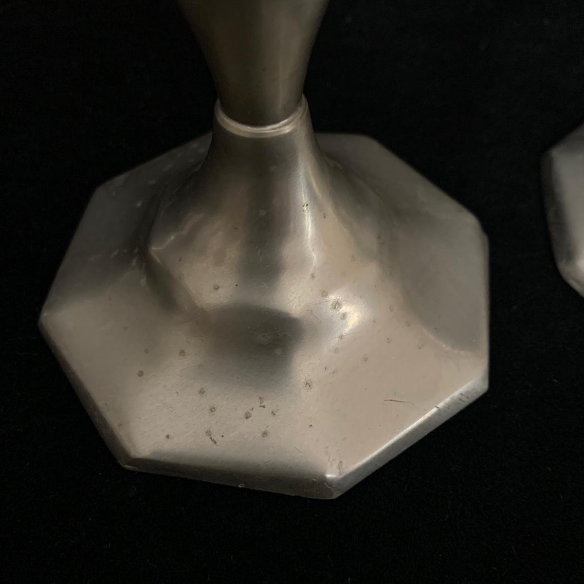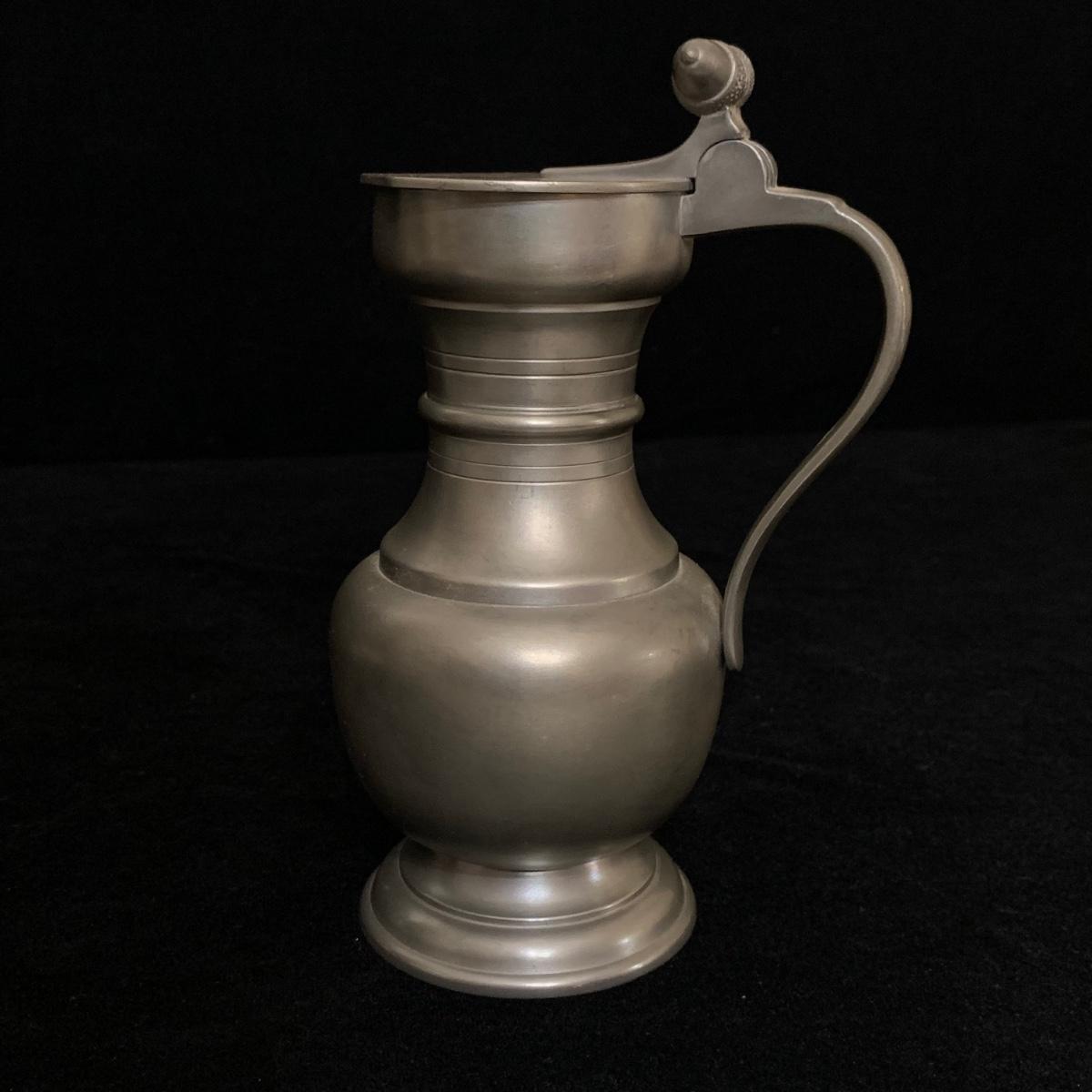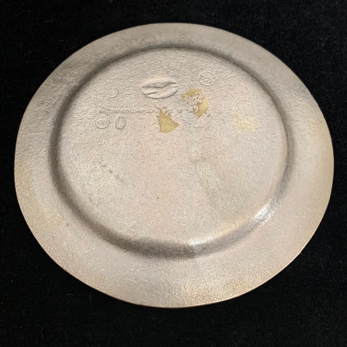 Seven total items in this collection. Some items are pewter and some are pewter-like. Pewter-marked items include: a Royal Holland Daalderop Pewter pitcher, a 6”d Wilton Columbia pewter plate, and a 10.5” Wilton Columbia pewter plate. Also included are two metal candlesticks with protective felt bottoms, a lidded pitcher with acorn finial, and a 15”d floral tray with scalloped edges. The lidded pitcher is marked “95%”. It is in good condition with minimal signs of wear. All other items have signs of wear and/or small blemishes.