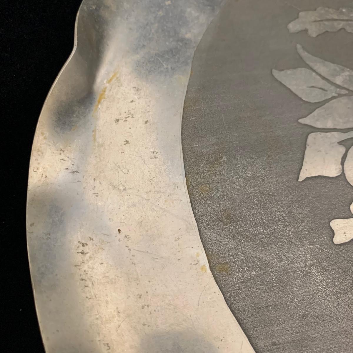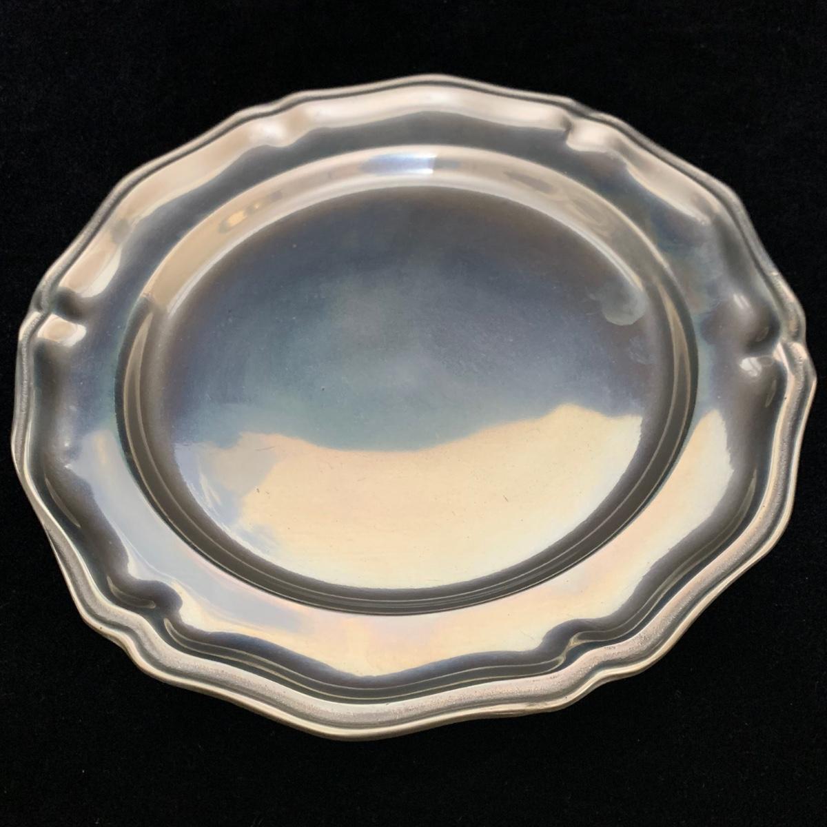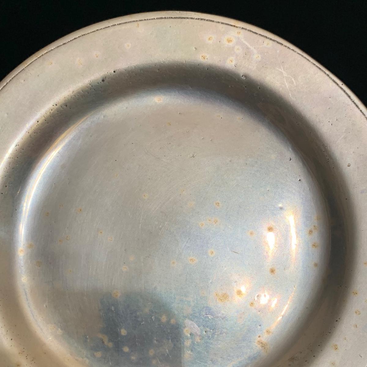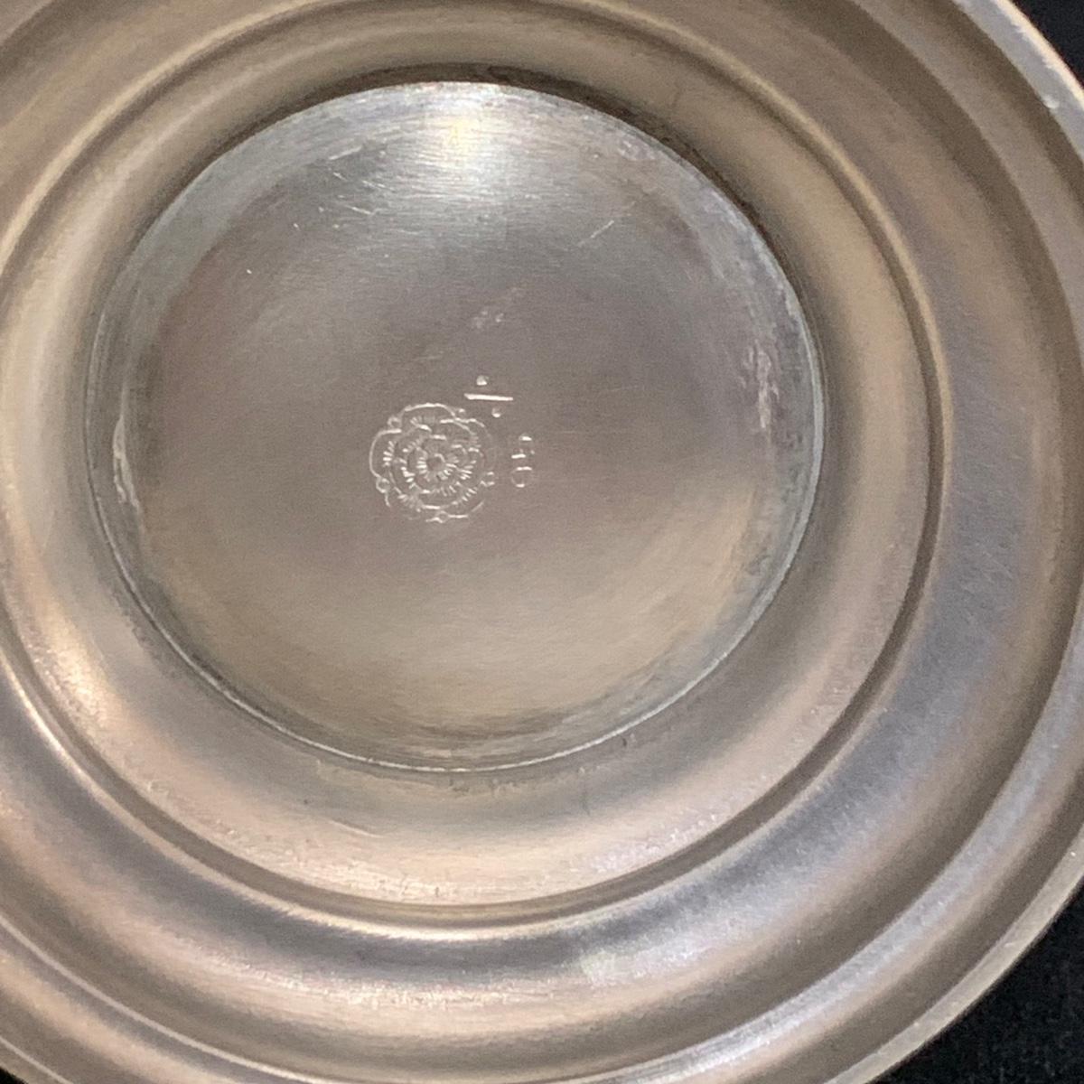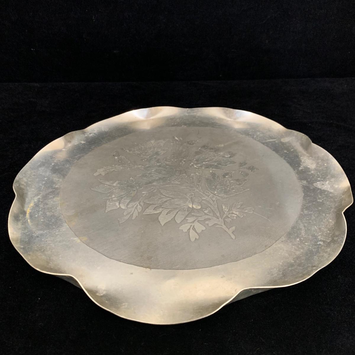 Seven total items in this collection. Some items are pewter and some are pewter-like. Pewter-marked items include: a Royal Holland Daalderop Pewter pitcher, a 6”d Wilton Columbia pewter plate, and a 10.5” Wilton Columbia pewter plate. Also included are two metal candlesticks with protective felt bottoms, a lidded pitcher with acorn finial, and a 15”d floral tray with scalloped edges. The lidded pitcher is marked “95%”. It is in good condition with minimal signs of wear. All other items have signs of wear and/or small blemishes.
