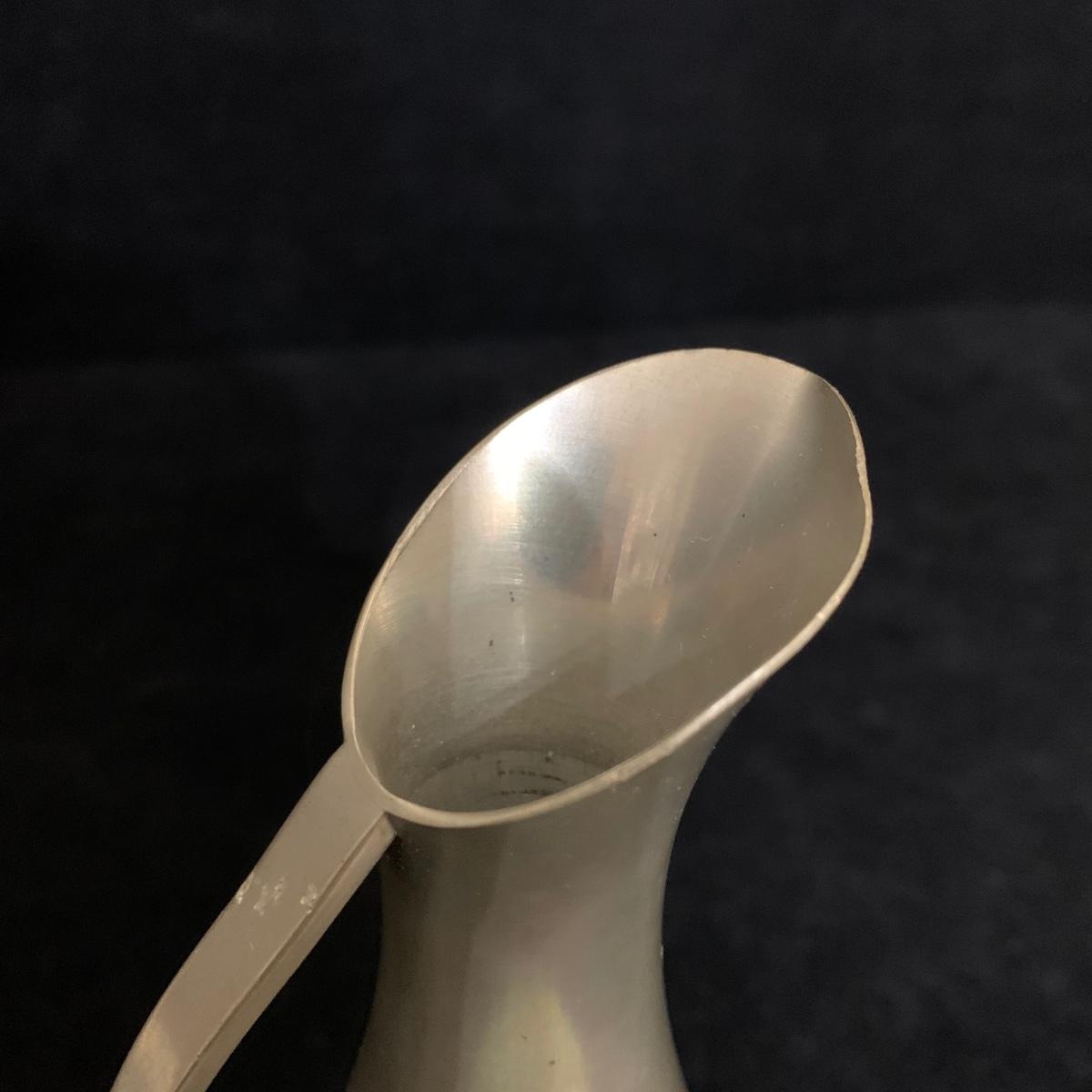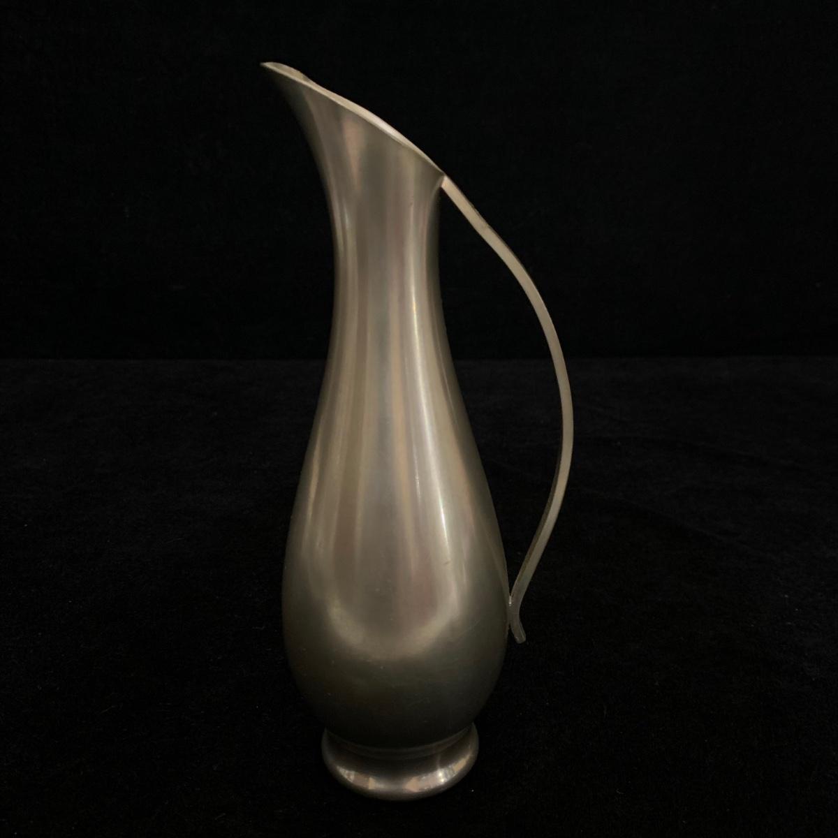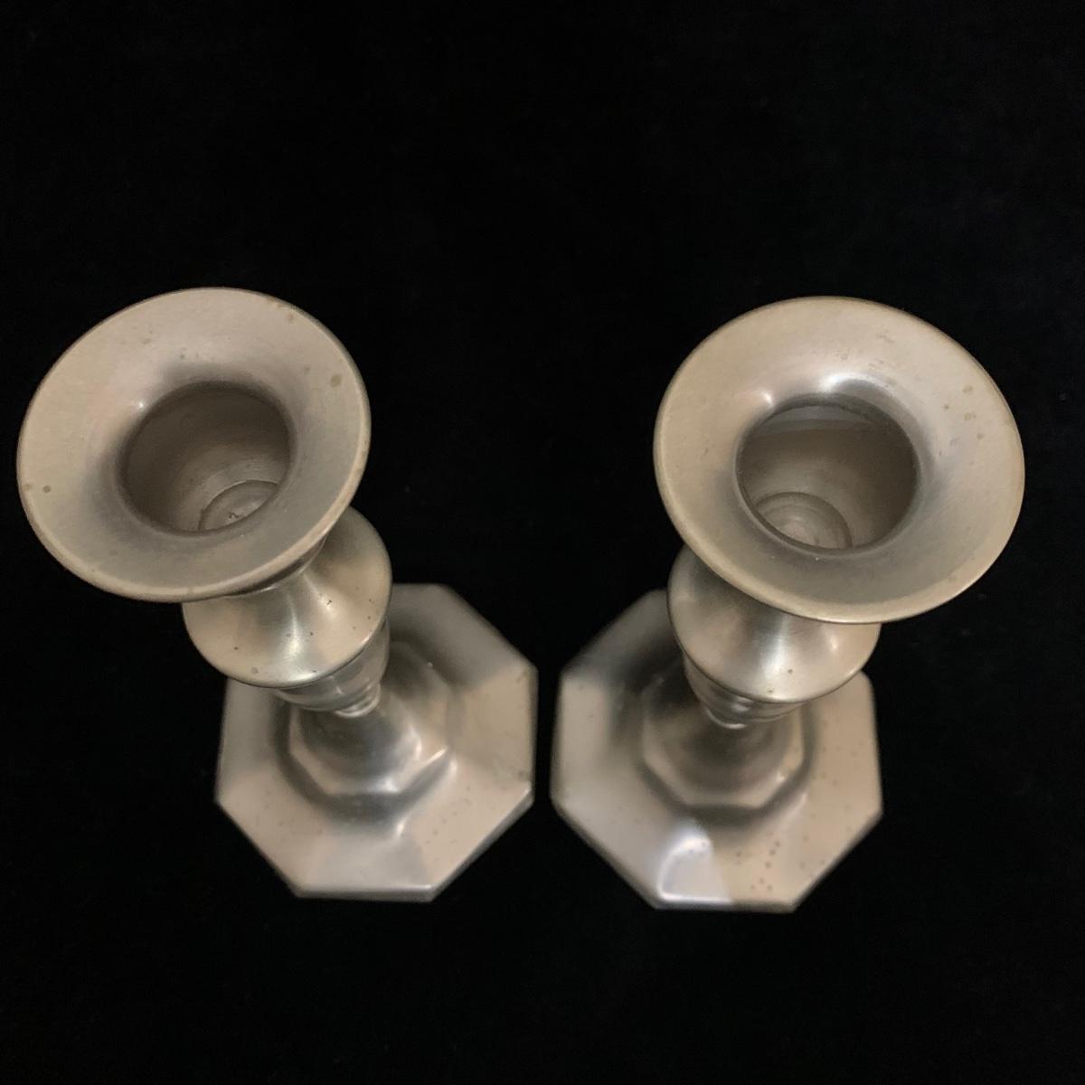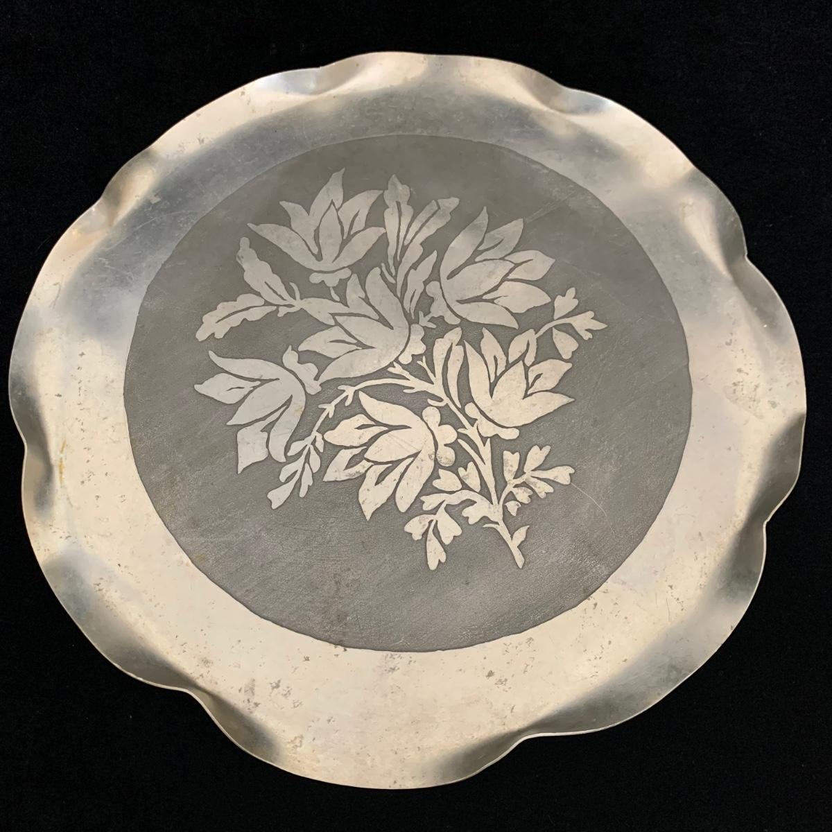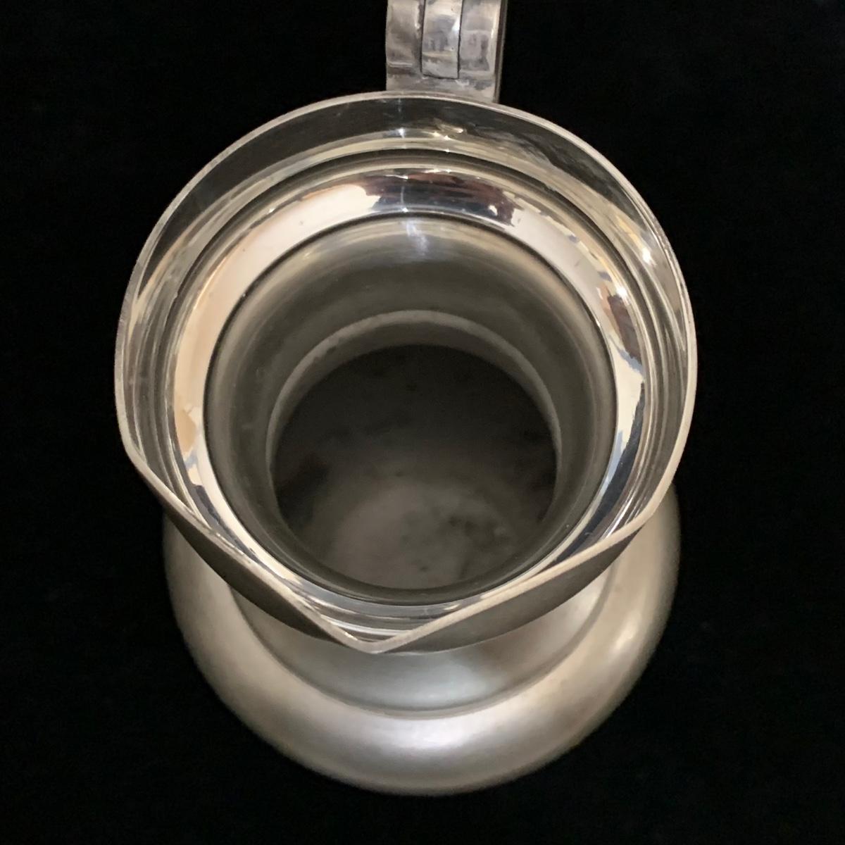 Seven total items in this collection. Some items are pewter and some are pewter-like. Pewter-marked items include: a Royal Holland Daalderop Pewter pitcher, a 6”d Wilton Columbia pewter plate, and a 10.5” Wilton Columbia pewter plate. Also included are two metal candlesticks with protective felt bottoms, a lidded pitcher with acorn finial, and a 15”d floral tray with scalloped edges. The lidded pitcher is marked “95%”. It is in good condition with minimal signs of wear. All other items have signs of wear and/or small blemishes.