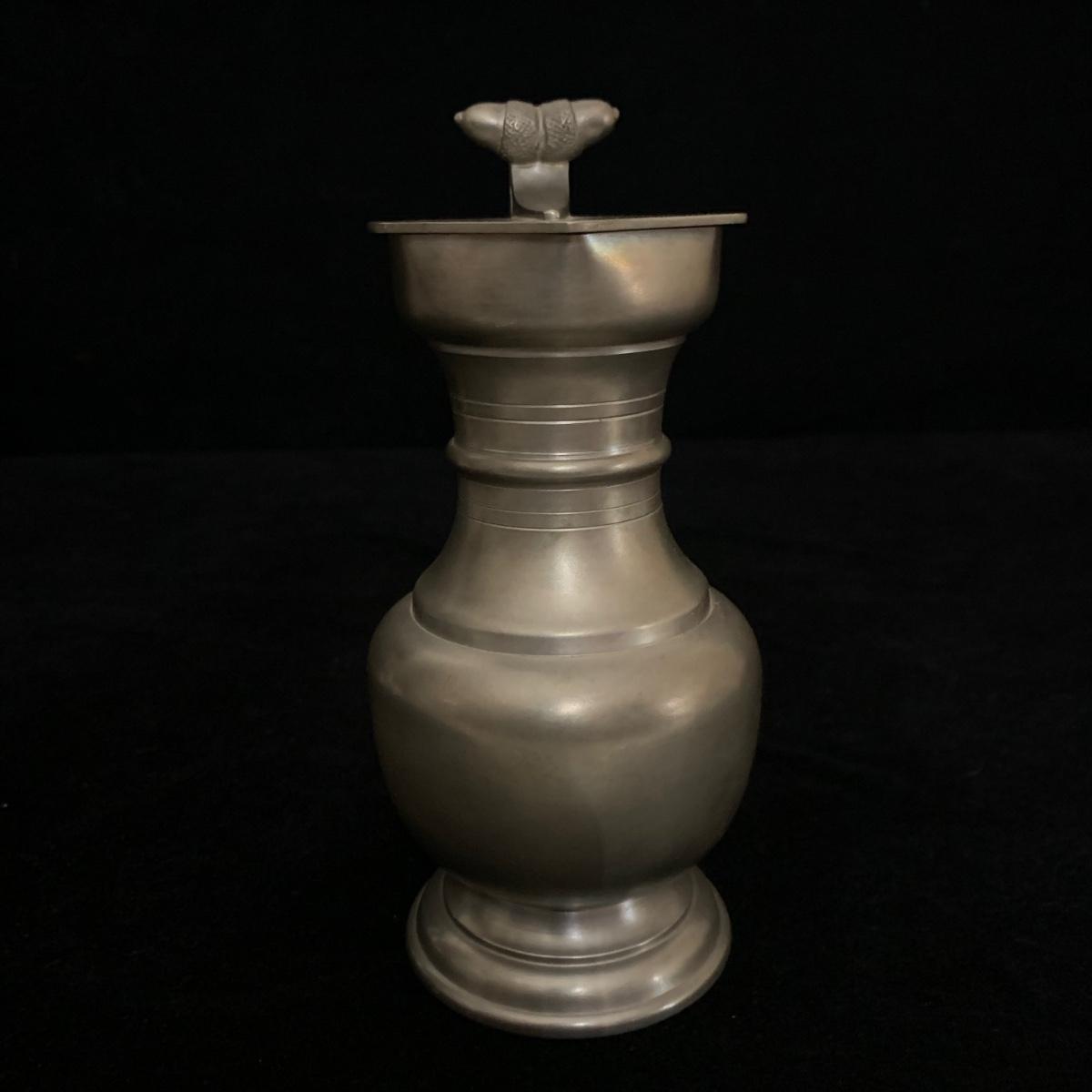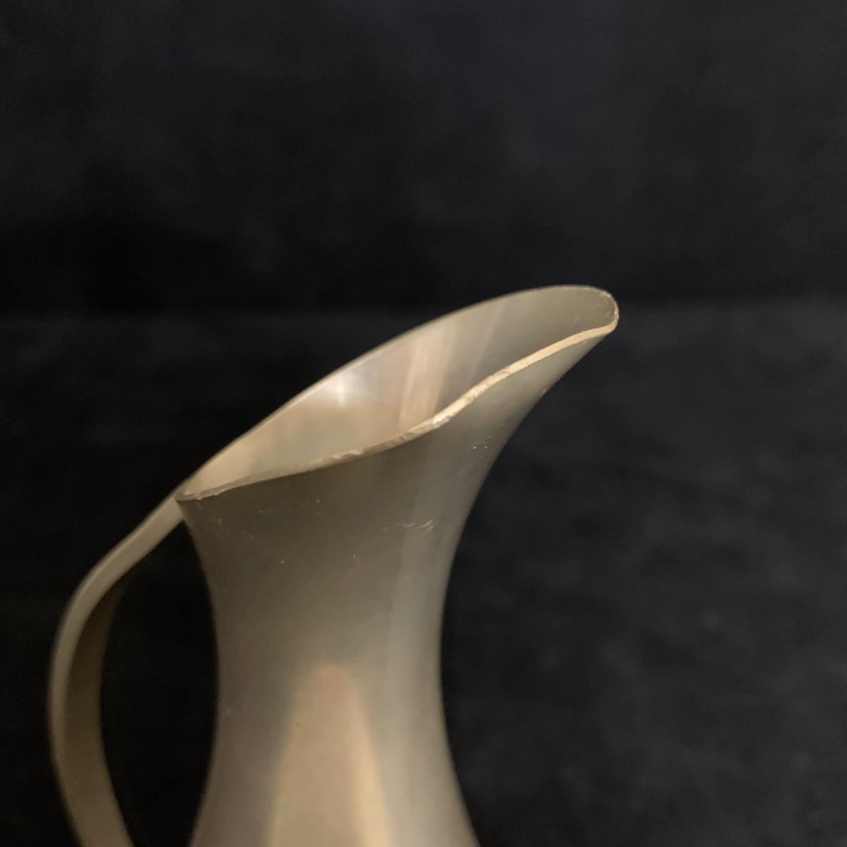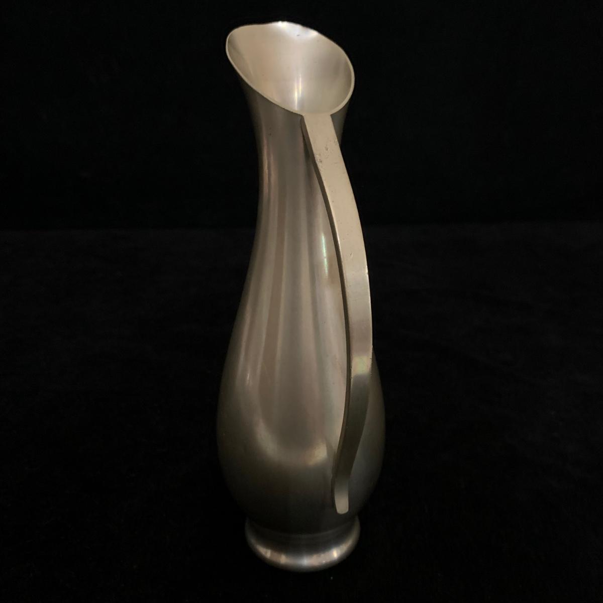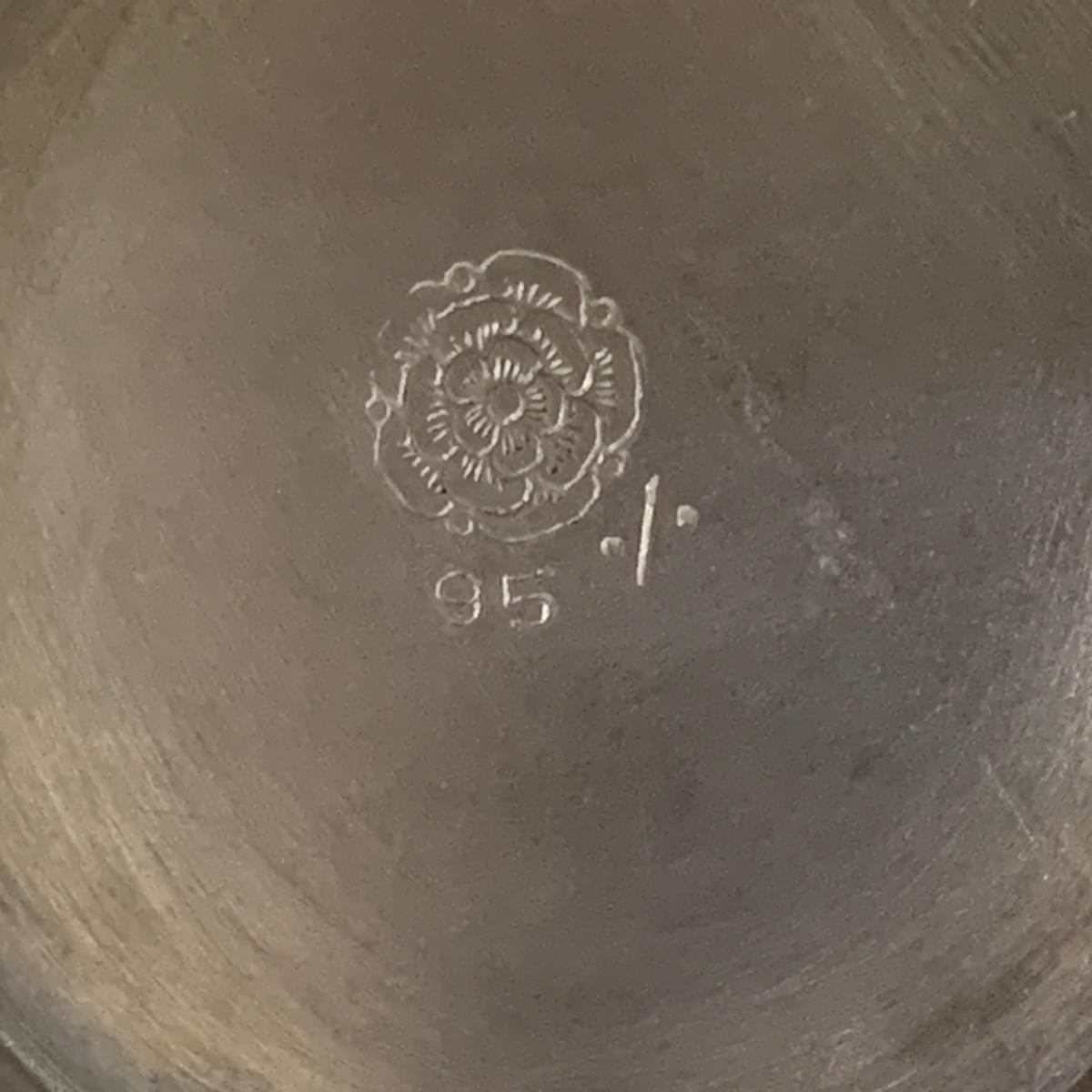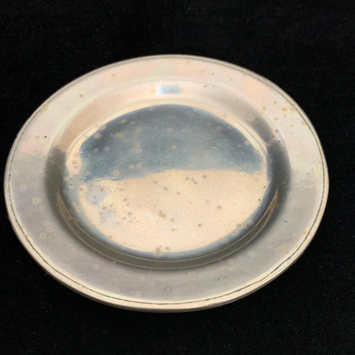 Seven total items in this collection. Some items are pewter and some are pewter-like. Pewter-marked items include: a Royal Holland Daalderop Pewter pitcher, a 6”d Wilton Columbia pewter plate, and a 10.5” Wilton Columbia pewter plate. Also included are two metal candlesticks with protective felt bottoms, a lidded pitcher with acorn finial, and a 15”d floral tray with scalloped edges. The lidded pitcher is marked “95%”. It is in good condition with minimal signs of wear. All other items have signs of wear and/or small blemishes.