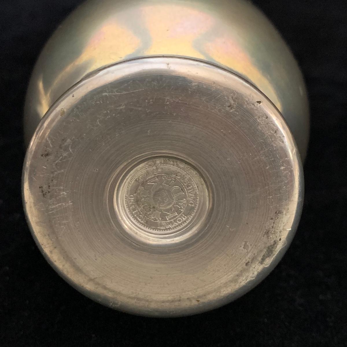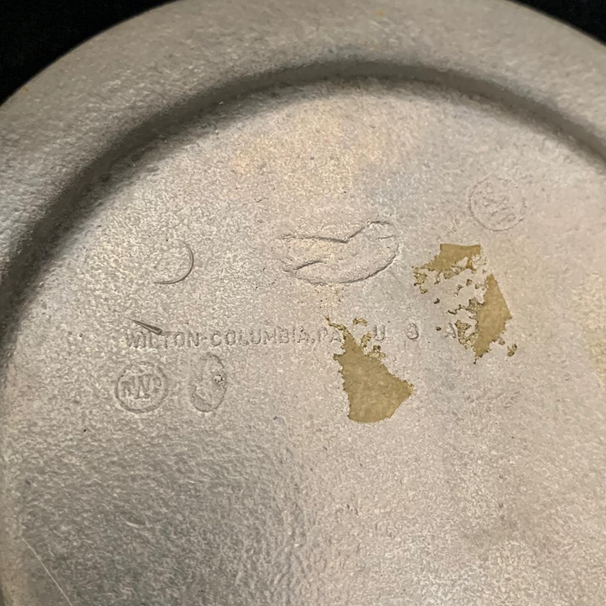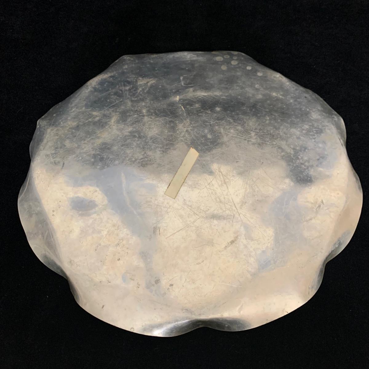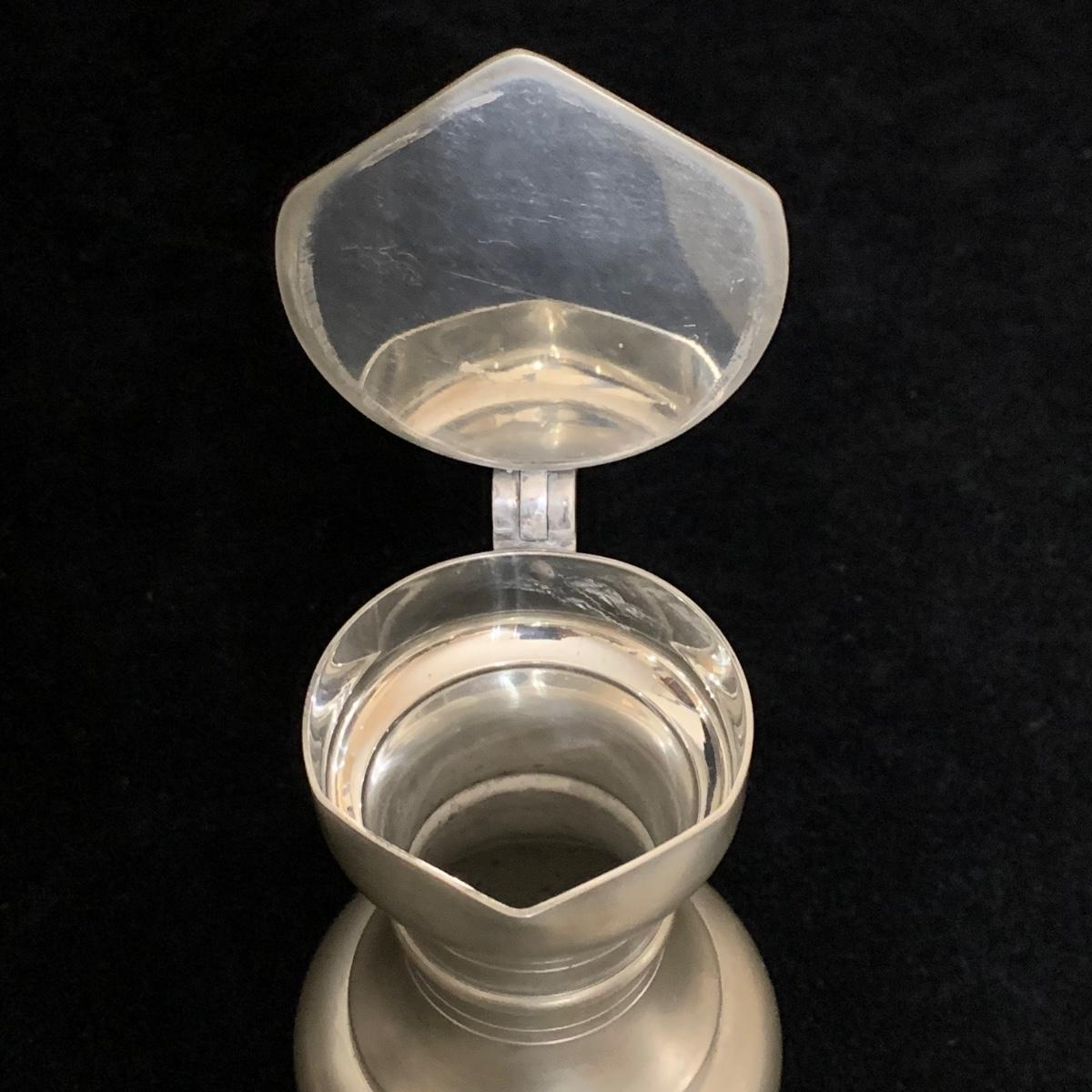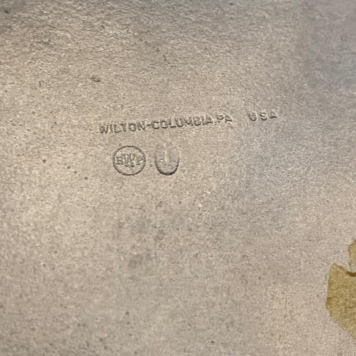 Seven total items in this collection. Some items are pewter and some are pewter-like. Pewter-marked items include: a Royal Holland Daalderop Pewter pitcher, a 6”d Wilton Columbia pewter plate, and a 10.5” Wilton Columbia pewter plate. Also included are two metal candlesticks with protective felt bottoms, a lidded pitcher with acorn finial, and a 15”d floral tray with scalloped edges. The lidded pitcher is marked “95%”. It is in good condition with minimal signs of wear. All other items have signs of wear and/or small blemishes.