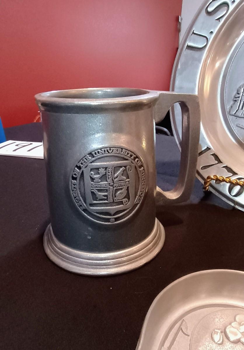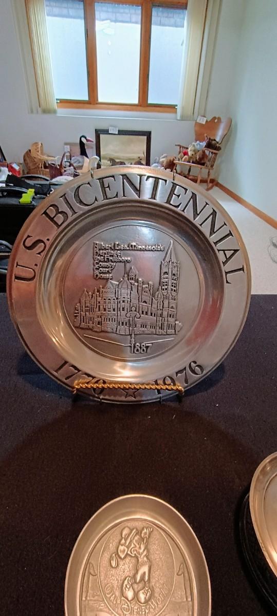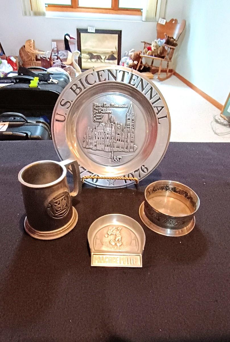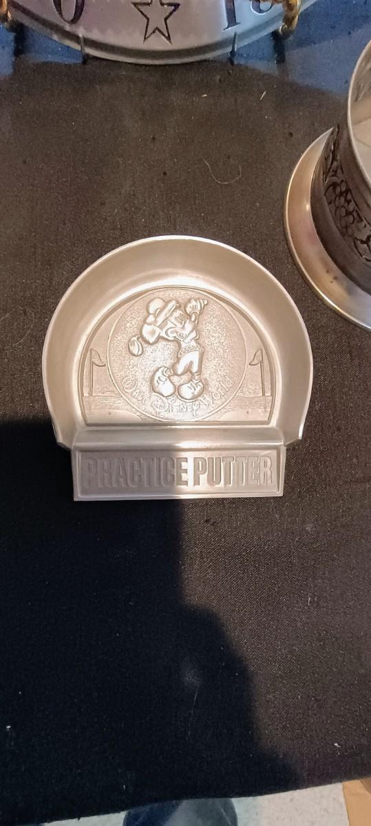 PEWTER PLATE AND MUG, STAINLESS STEEL CANDLE HOLDER & MICKEY MOUSE PRACTICE PUTTER