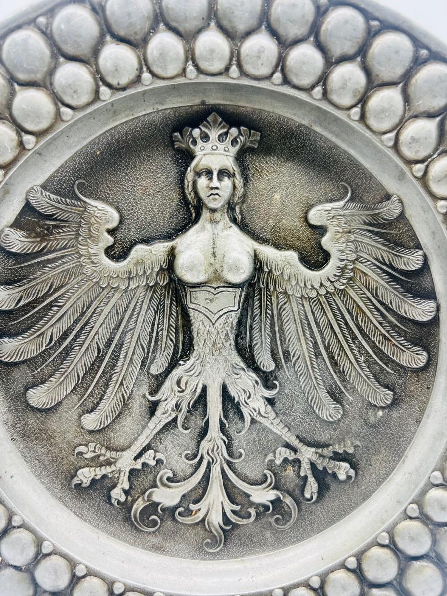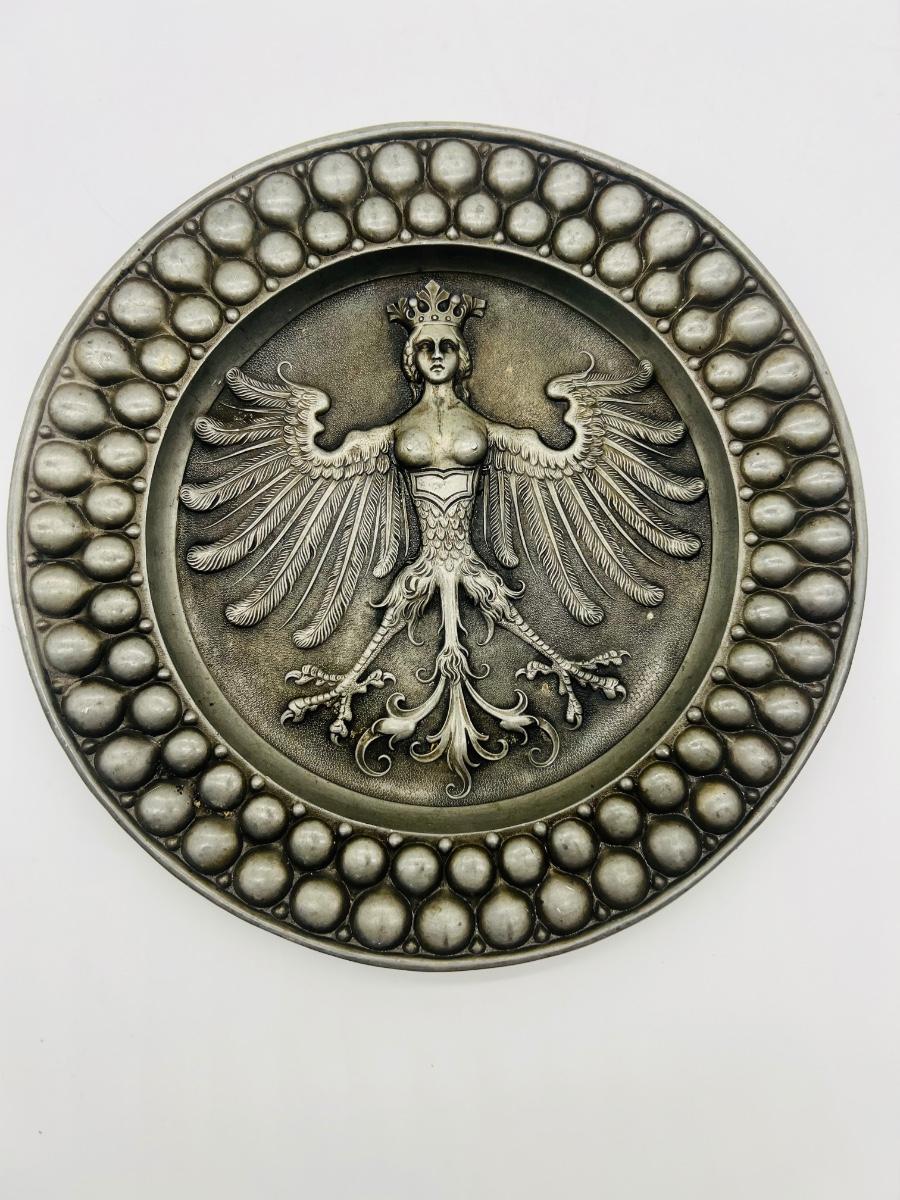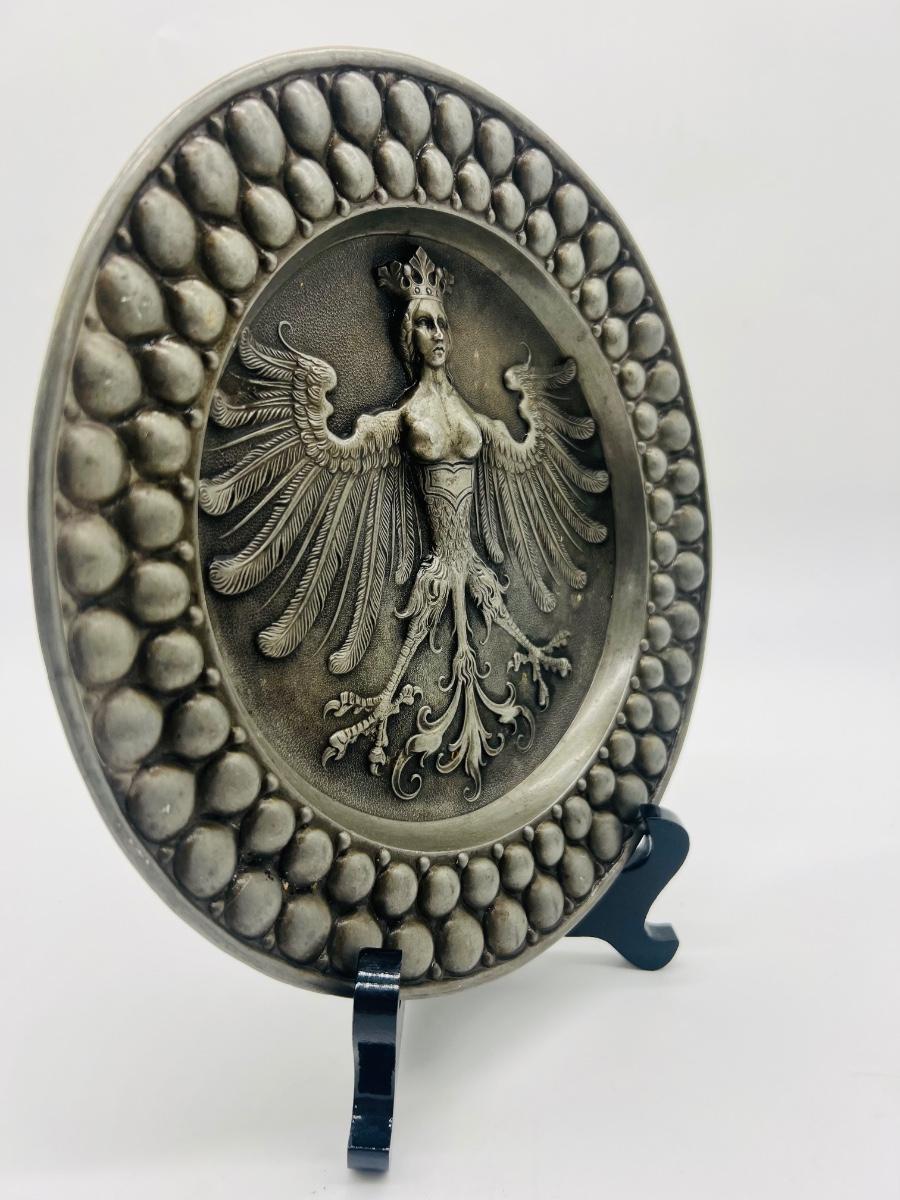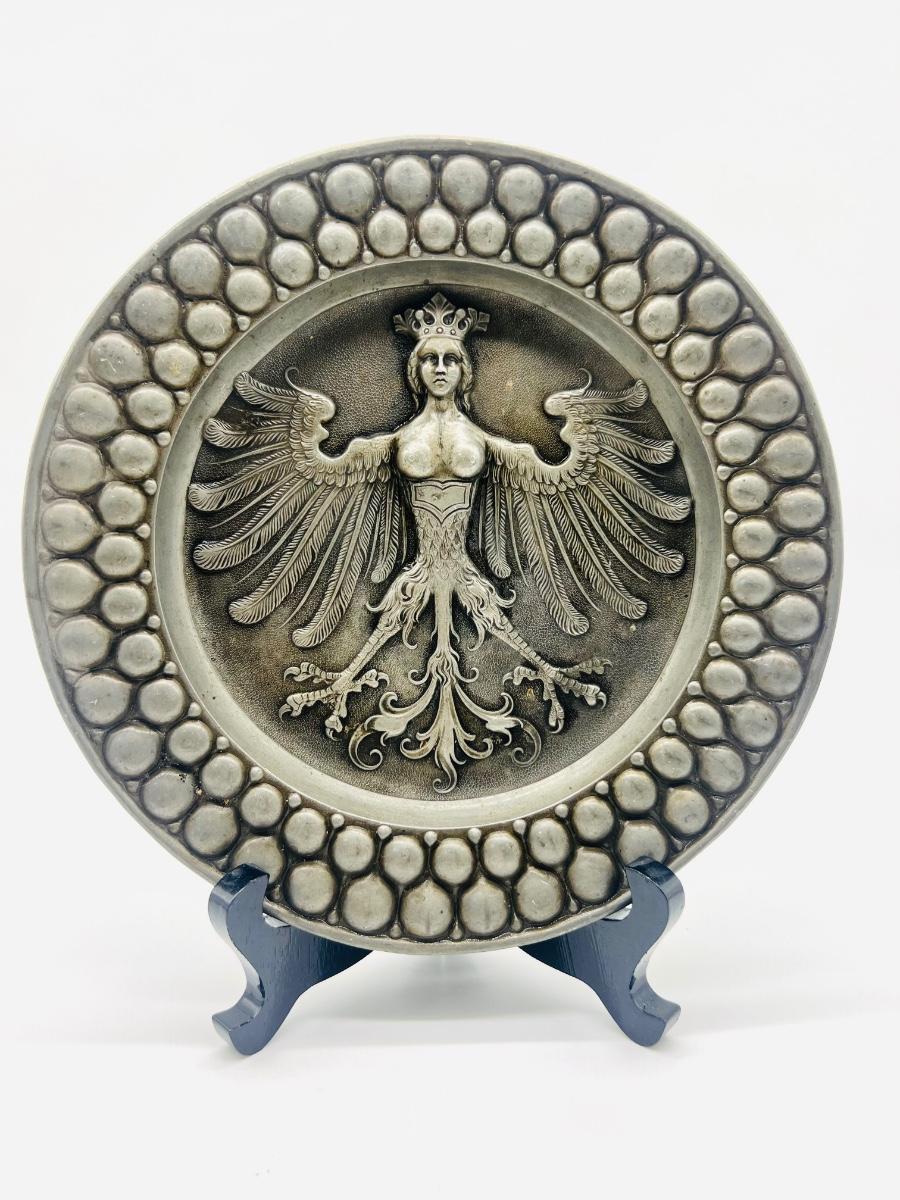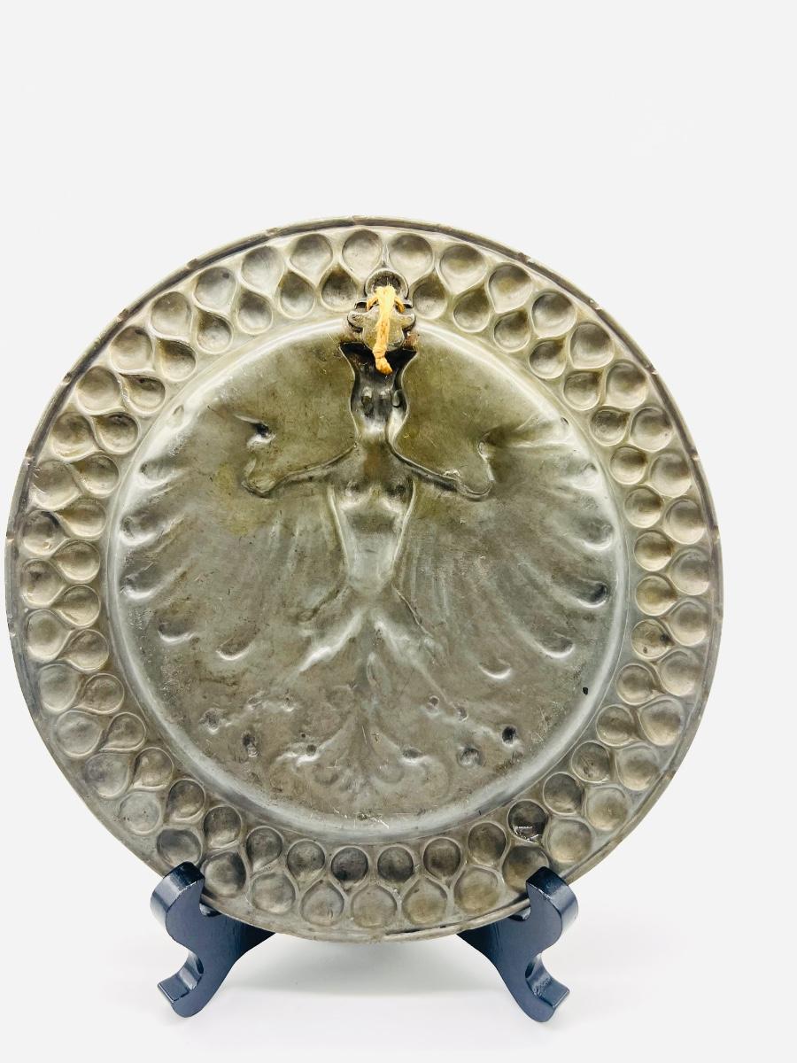 This pewter plate symbolizes the city of Nuremberg, Germany. This can be hung up or on a stand. Stand is not included measures 9 inches round.