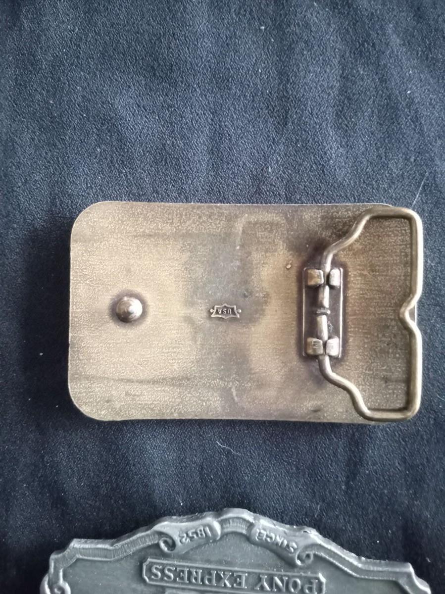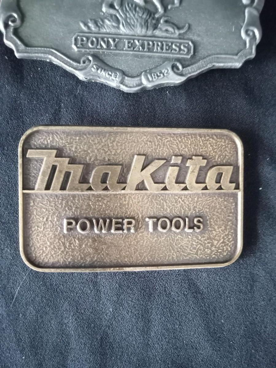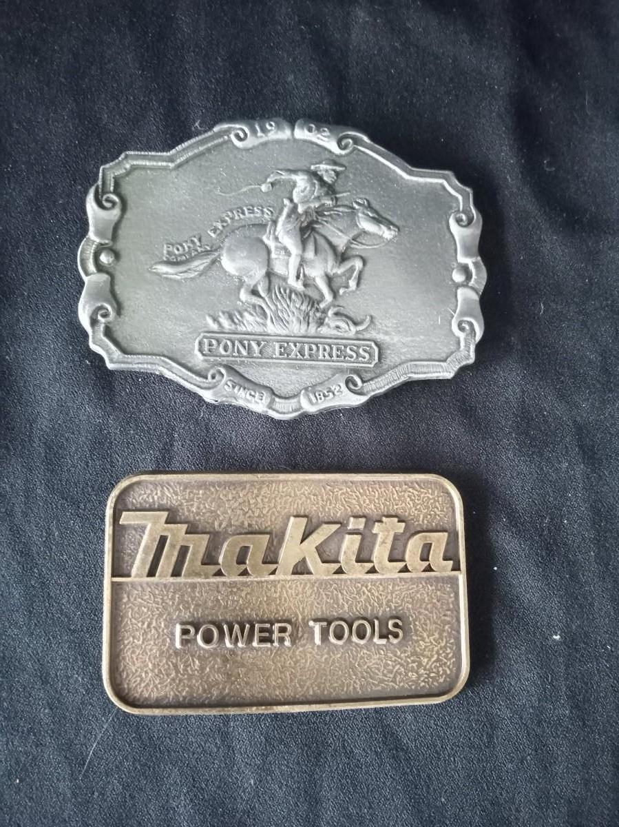 PEWTER PONY EXPRESS AND BRASS MAKITA BELT BUCKLES