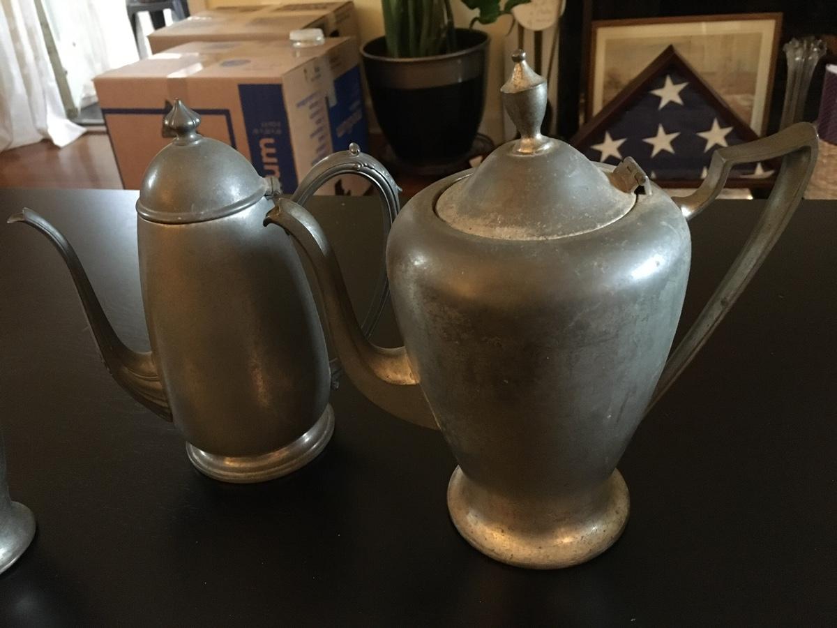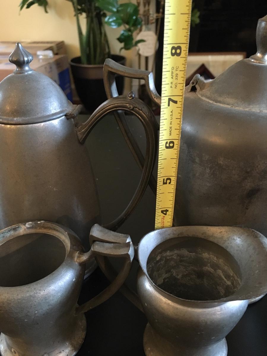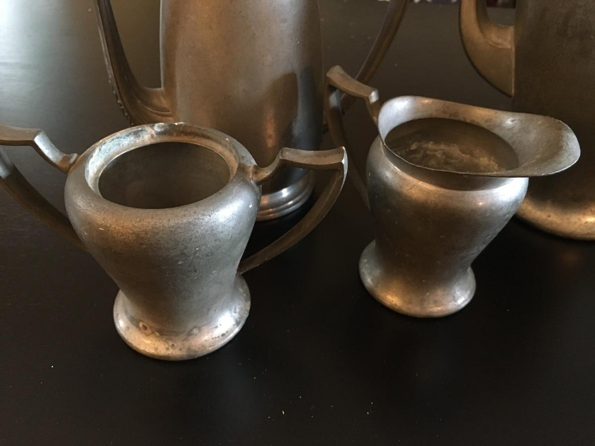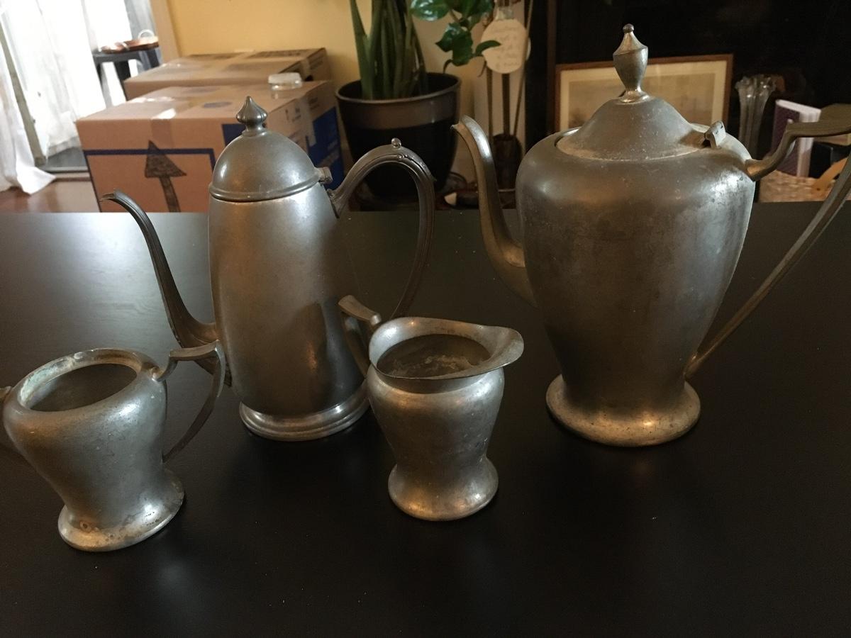 Teapot, coffee pot, sugar bowl with no lid and creamer set.