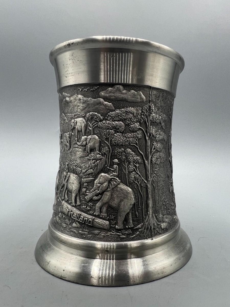 Pewter Souvenir Beer Stein Mug Thailand Elephants and Men. In good condition. Marked on the bottom. Smaller, under 5".