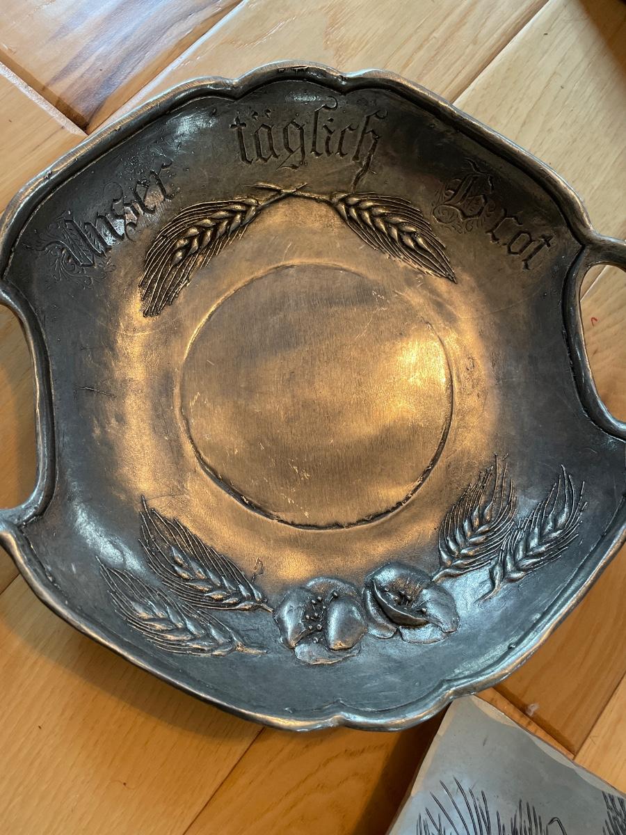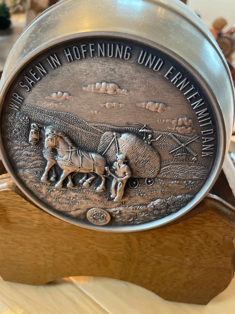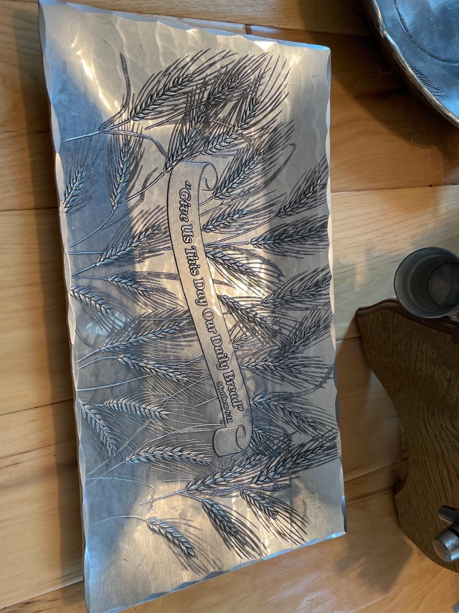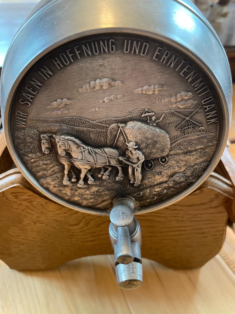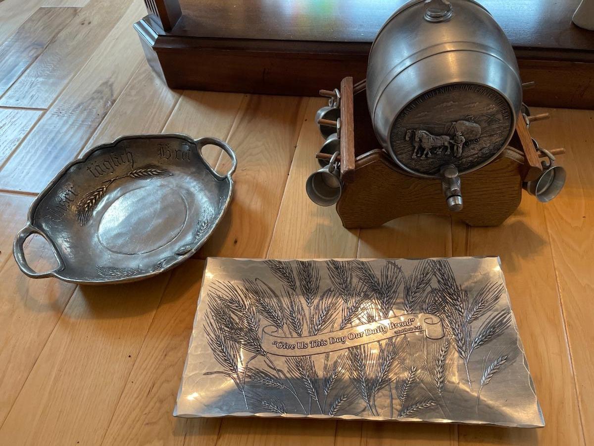 Pewter wheat decorated platters and keg with mugs