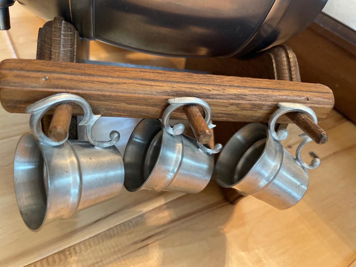 Keg is 7” long with tap in wood stand with 6 mugs