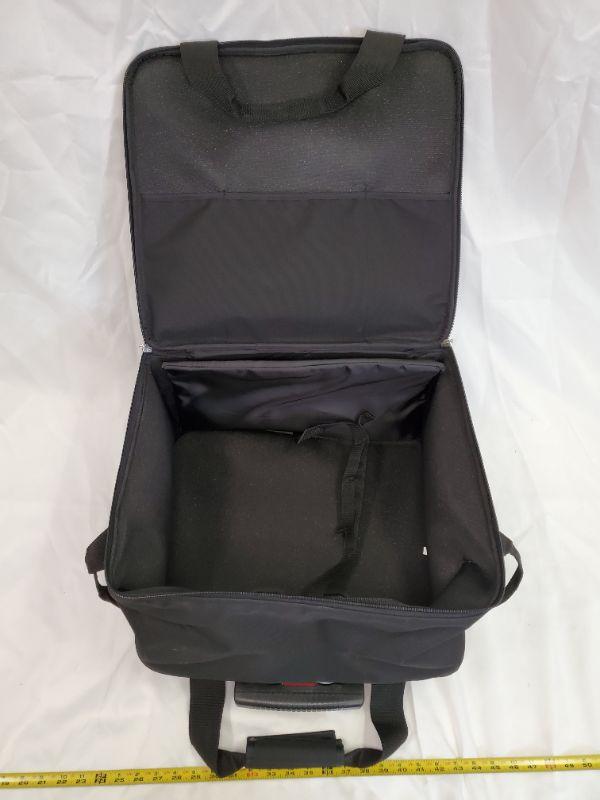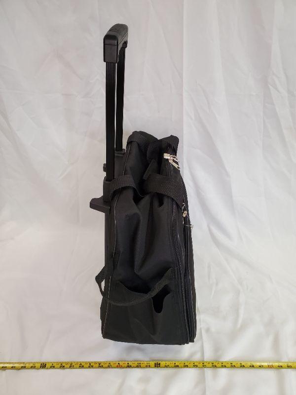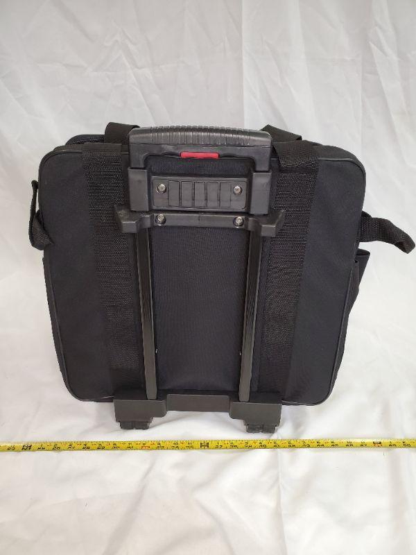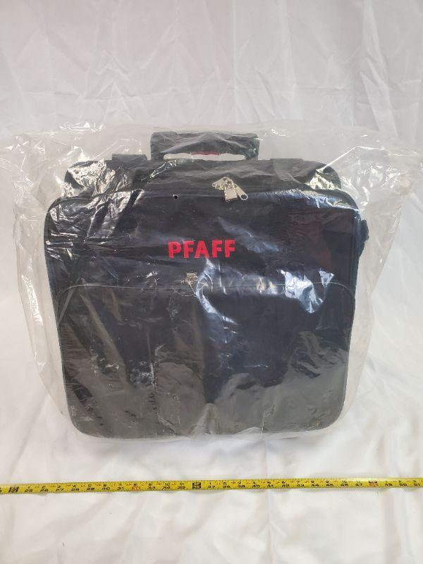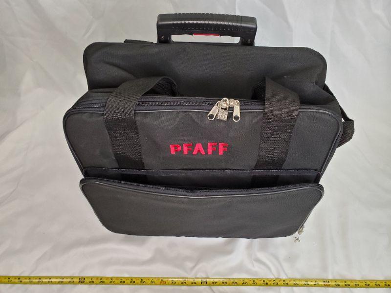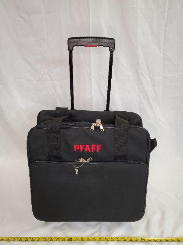 New, only removed from plastic for photos. Locks and keys included. Very nice slightly padded sewing machine bag. Wheels and retractable handle.