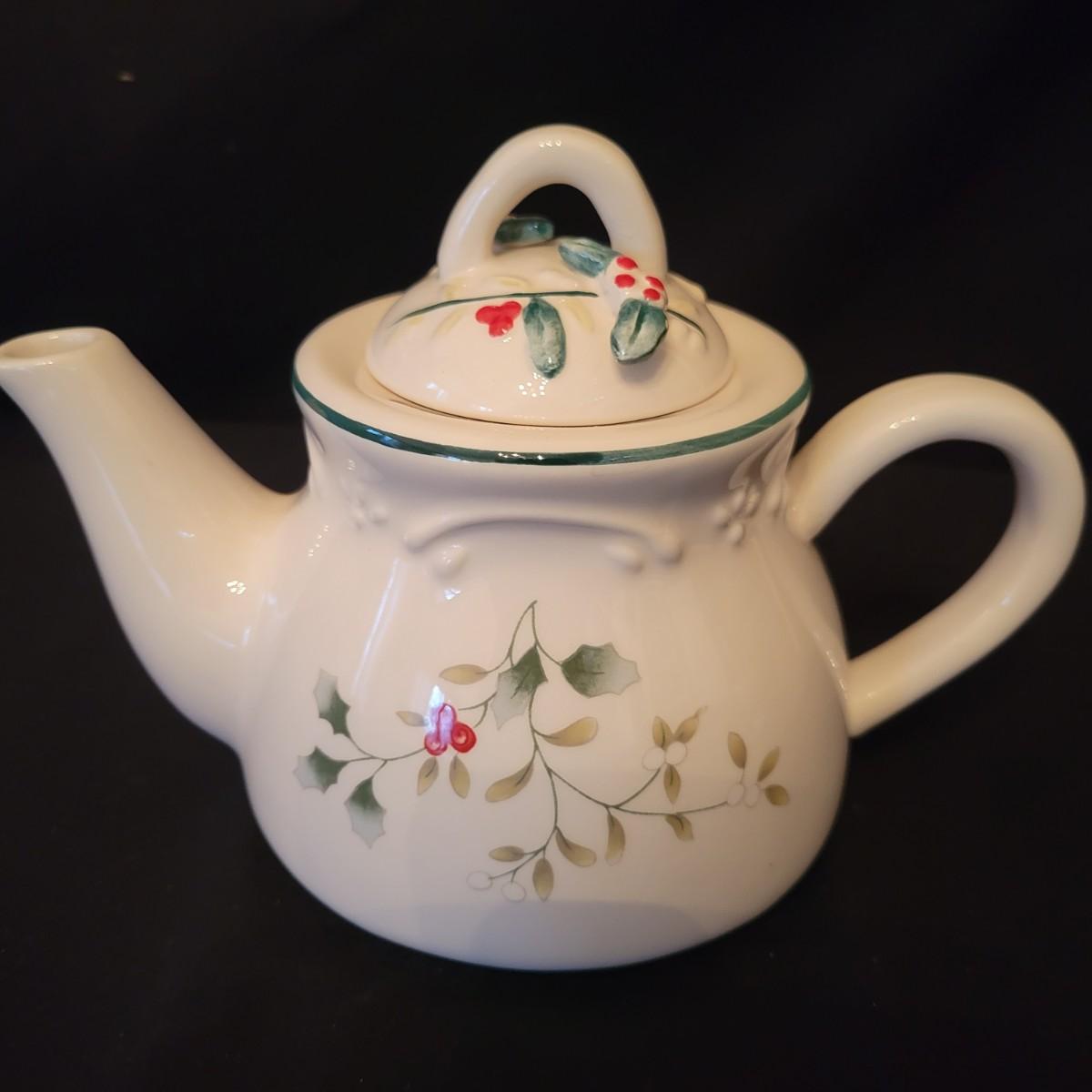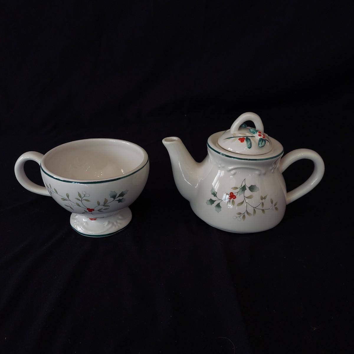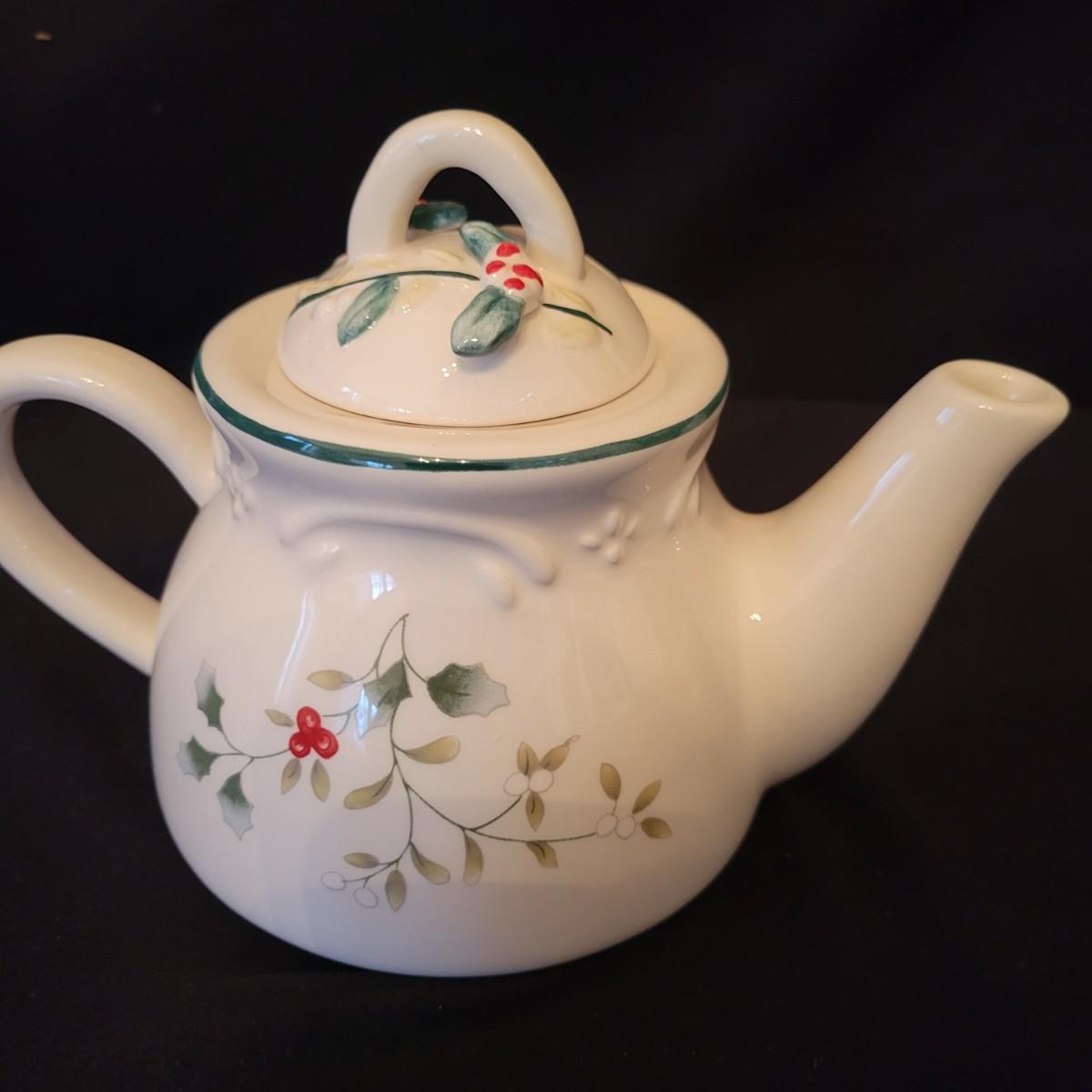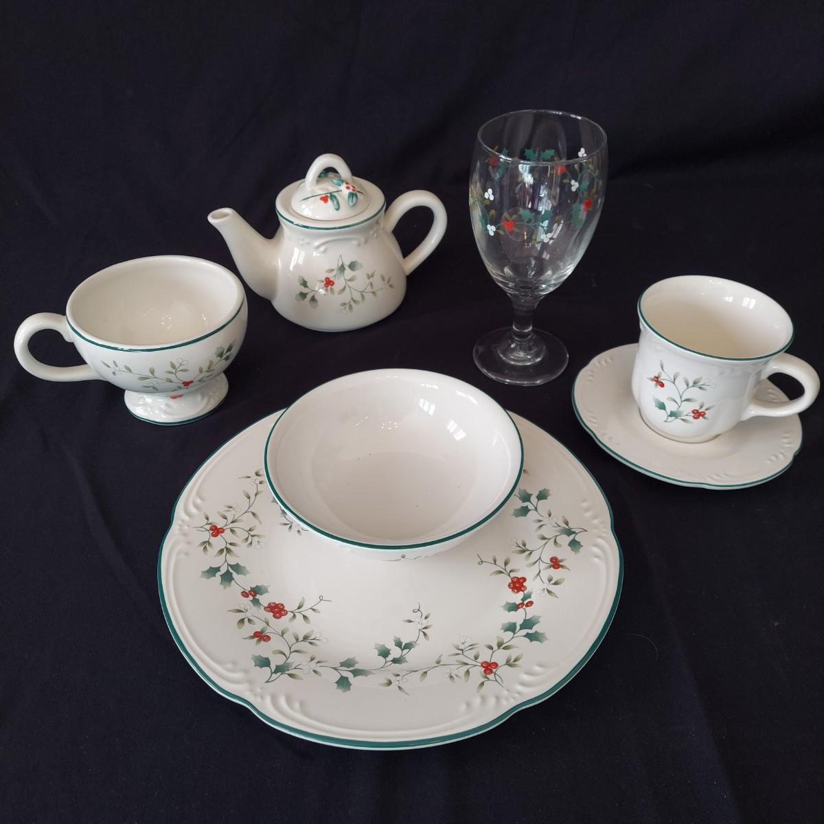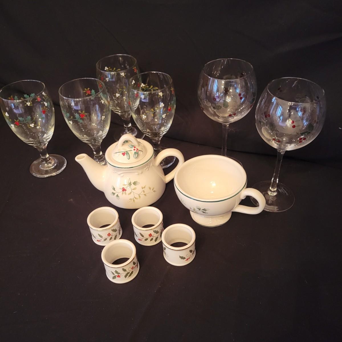 An assortment of holiday glass and ceramics. Each piece has a holly and berry motif called Winterberry. There are 28 pieces in this assortment. It includes four place settings with plate, bowl, mug, saucer and water goblet. There are also two wine glasses, a ceramic tea pot and large mug and four napkin rings. The teapot and mug both appear to be manufactured by Pfaltzgraff, but the teapot only has a stamp that is not legible. Teapot measures approximately 8" x 4" x 5.5"H. Local pickup only