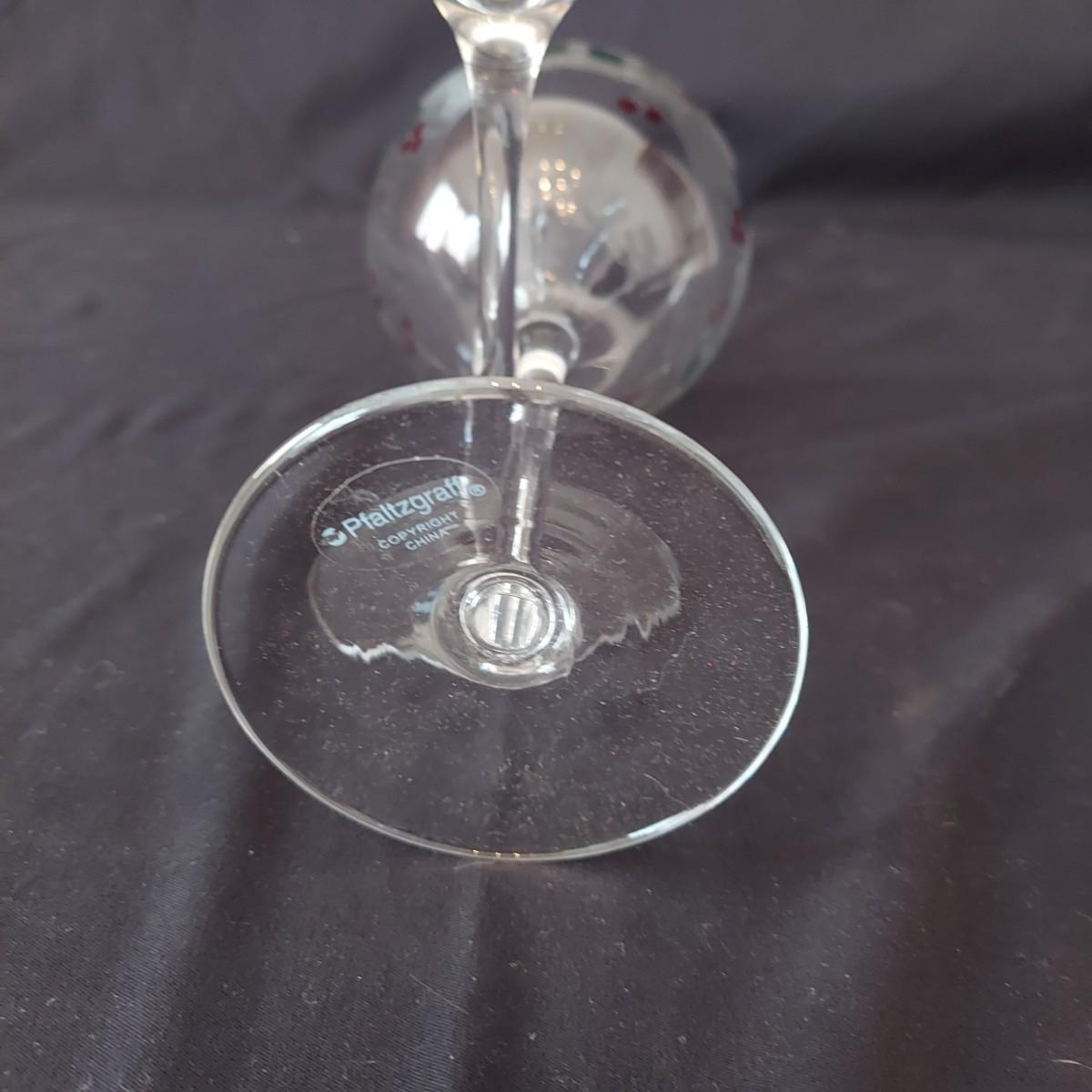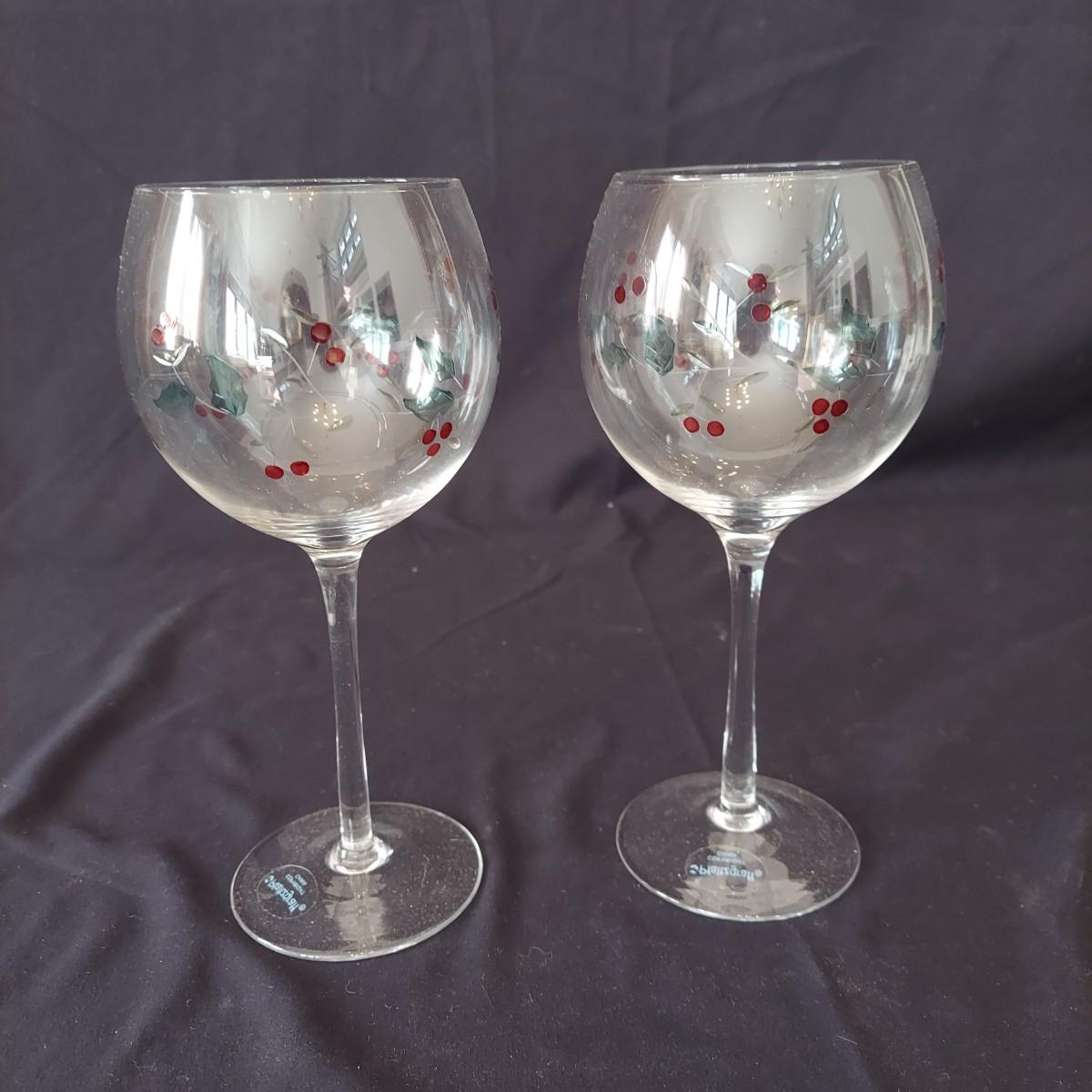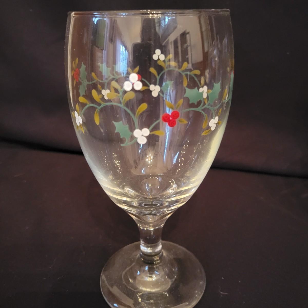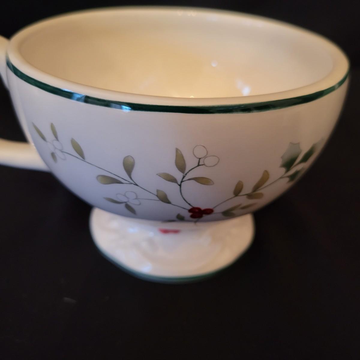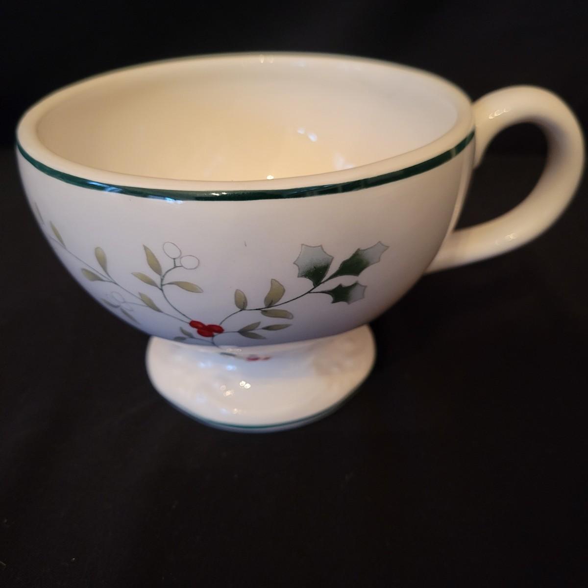 An assortment of holiday glass and ceramics. Each piece has a holly and berry motif called Winterberry. There are 28 pieces in this assortment. It includes four place settings with plate, bowl, mug, saucer and water goblet. There are also two wine glasses, a ceramic tea pot and large mug and four napkin rings. The teapot and mug both appear to be manufactured by Pfaltzgraff, but the teapot only has a stamp that is not legible. Teapot measures approximately 8" x 4" x 5.5"H. Local pickup only