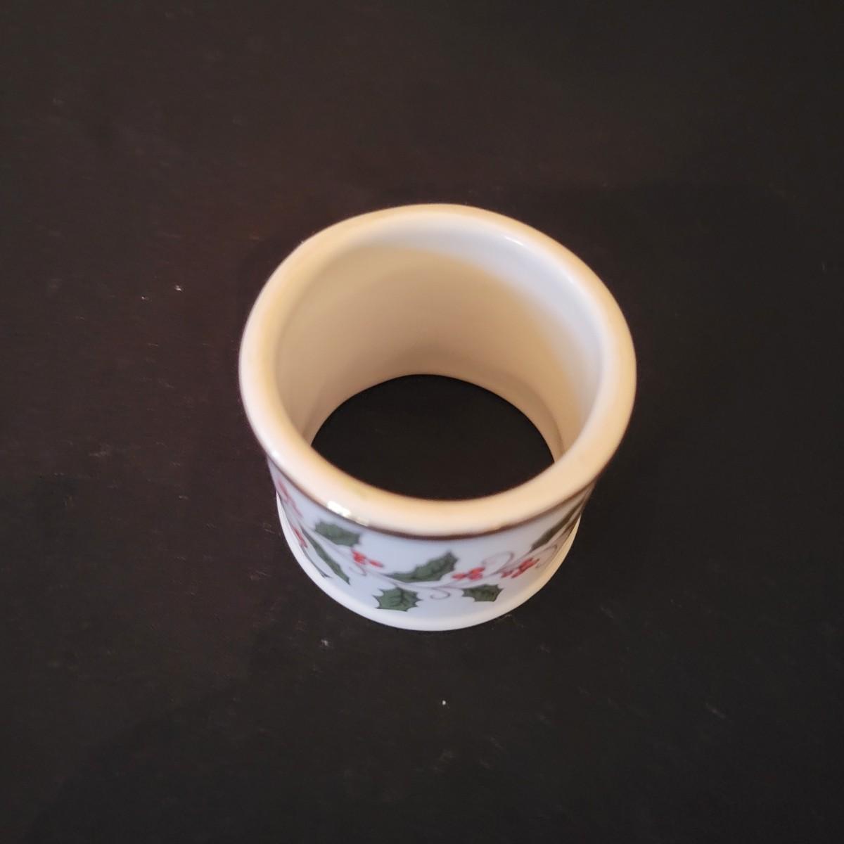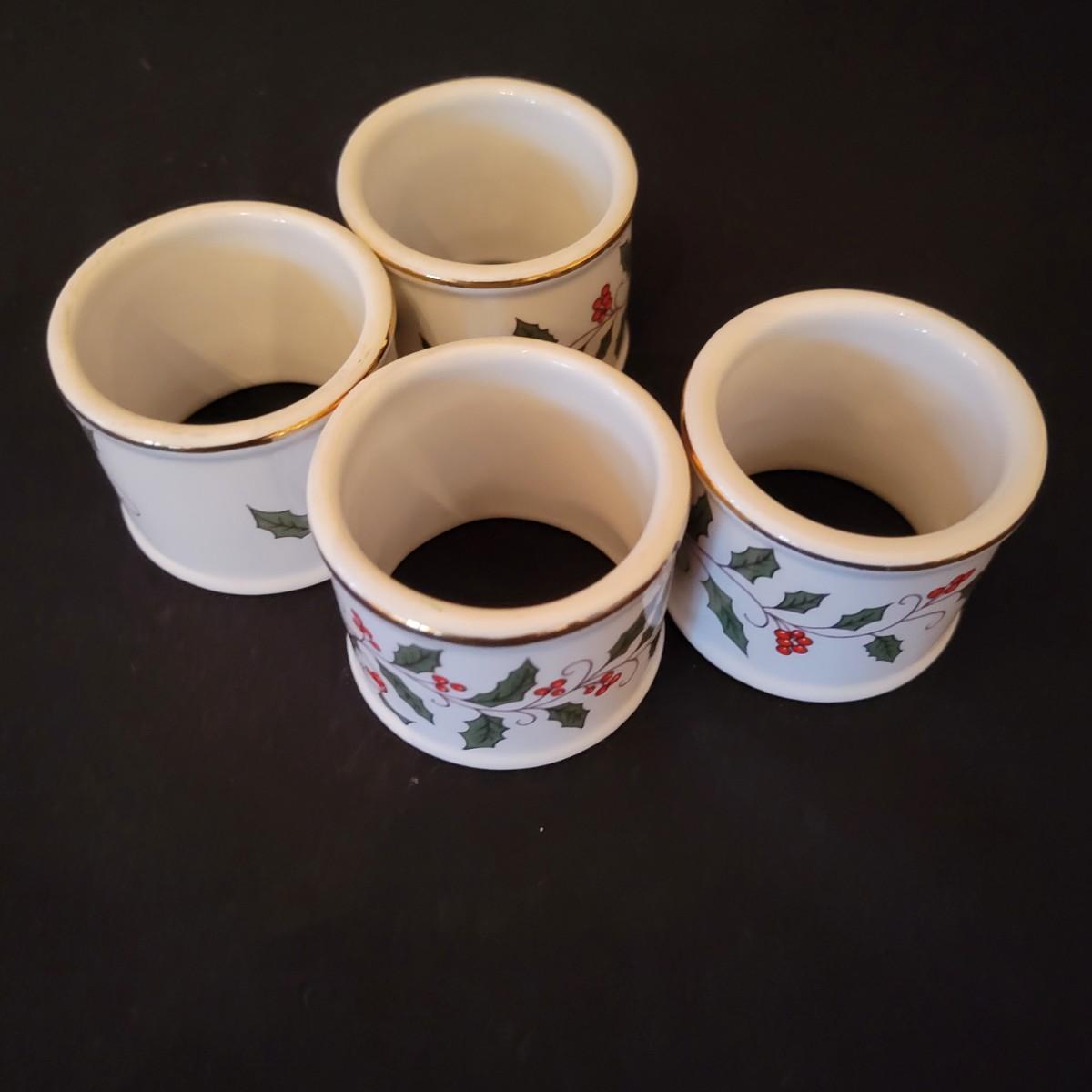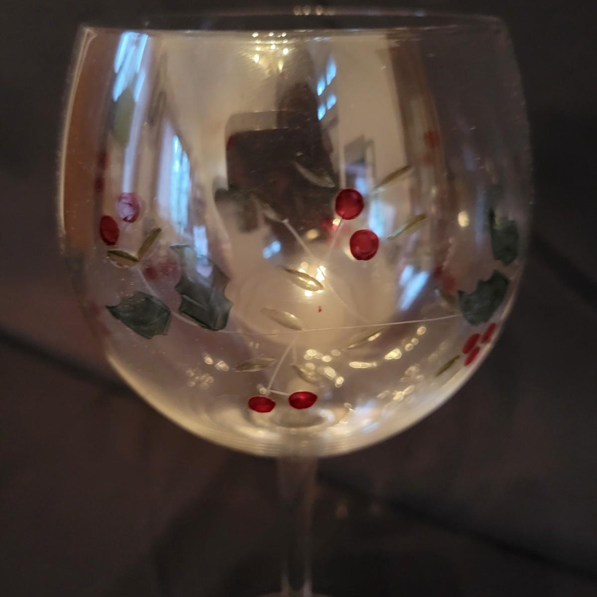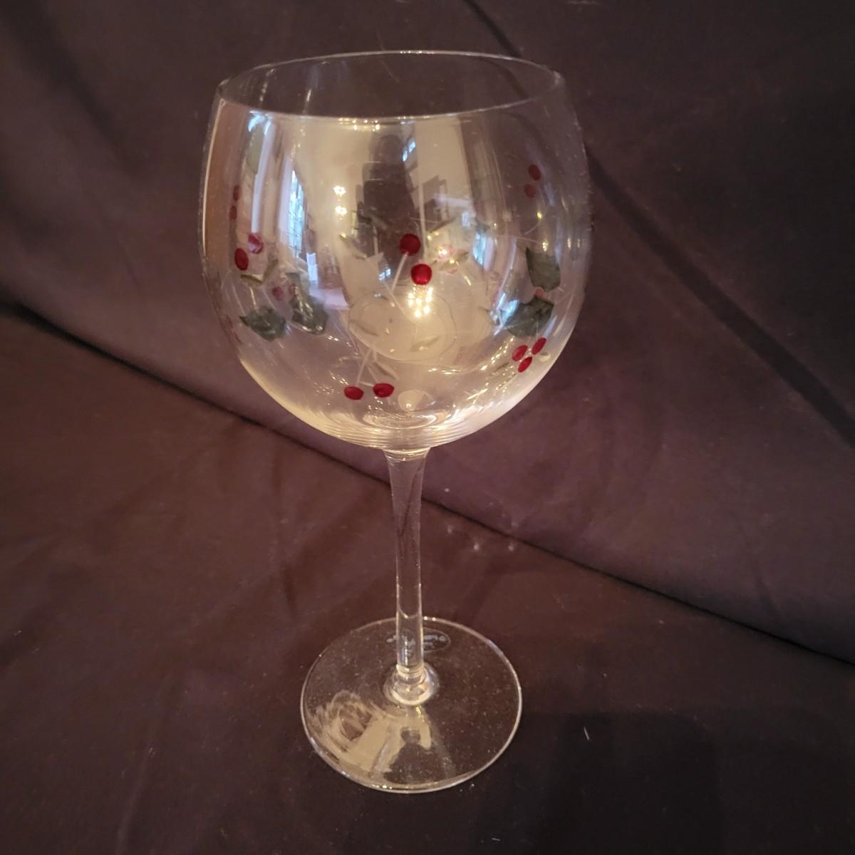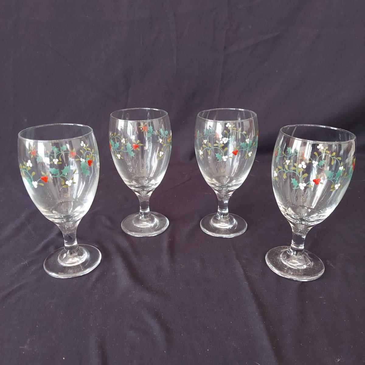 An assortment of holiday glass and ceramics. Each piece has a holly and berry motif called Winterberry. There are 28 pieces in this assortment. It includes four place settings with plate, bowl, mug, saucer and water goblet. There are also two wine glasses, a ceramic tea pot and large mug and four napkin rings. The teapot and mug both appear to be manufactured by Pfaltzgraff, but the teapot only has a stamp that is not legible. Teapot measures approximately 8" x 4" x 5.5"H. Local pickup only