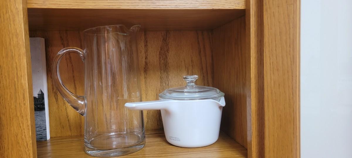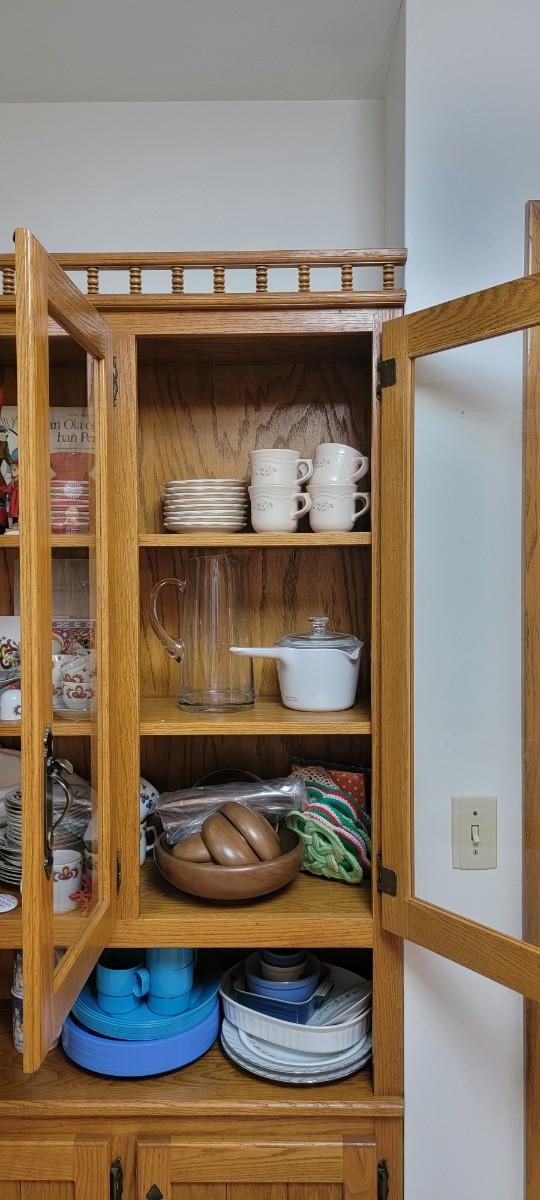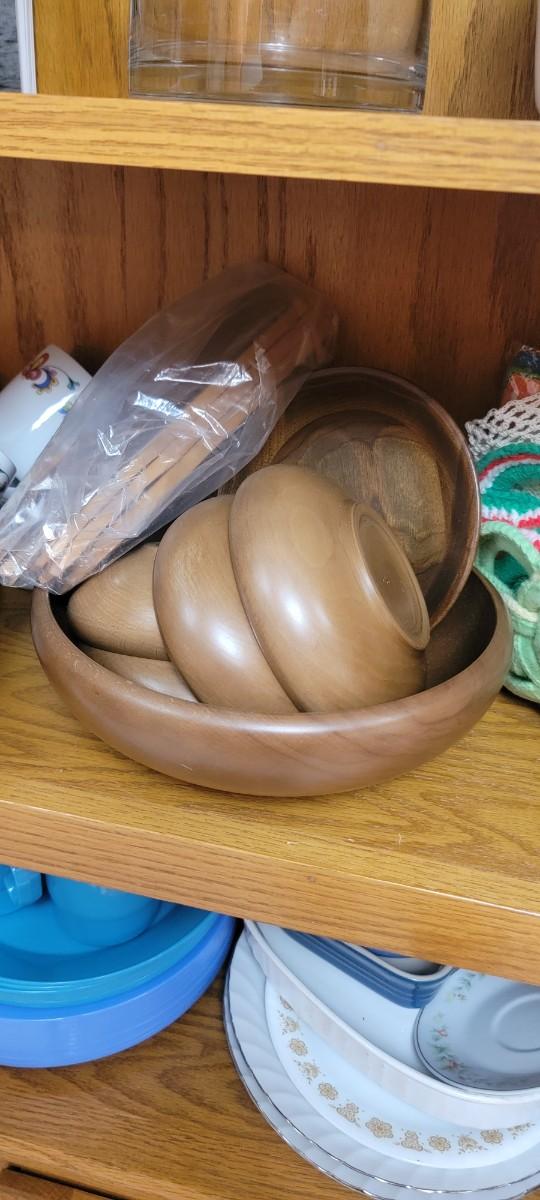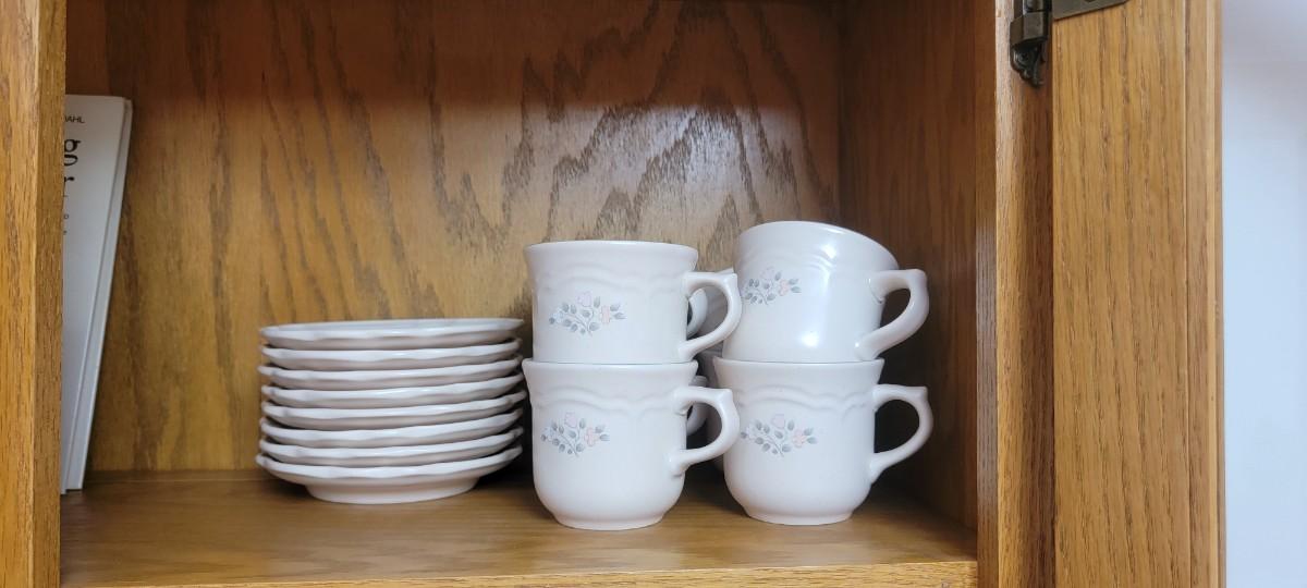 Pfaltzgraff cups and saucers 8, Corningware kettle, wooden salad set