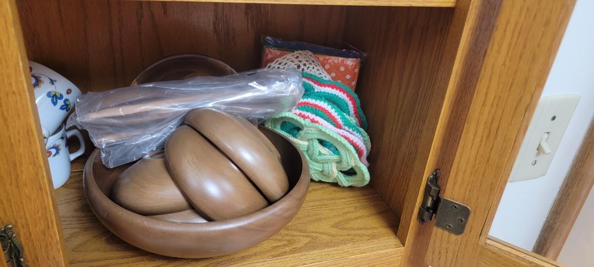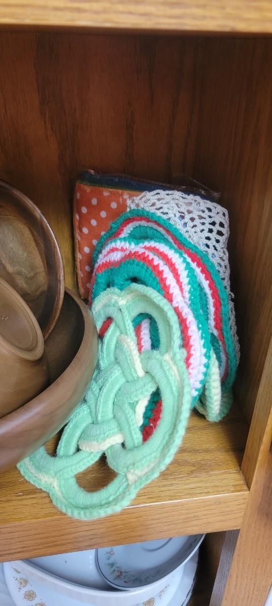 Pfaltzgraff cups and saucers, wooden salad set, handmade trivets