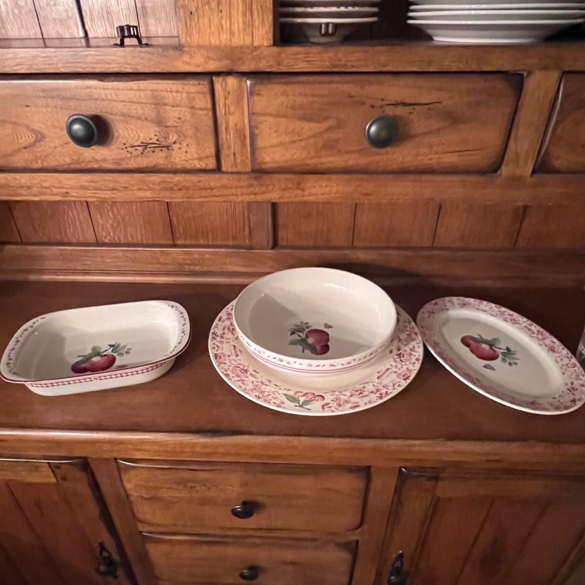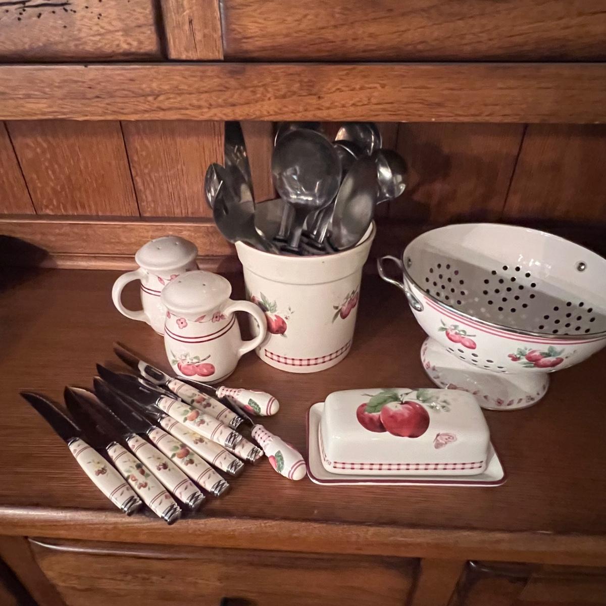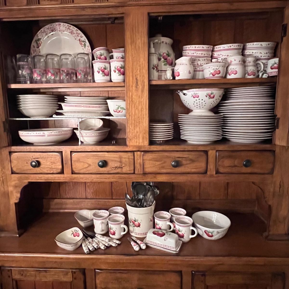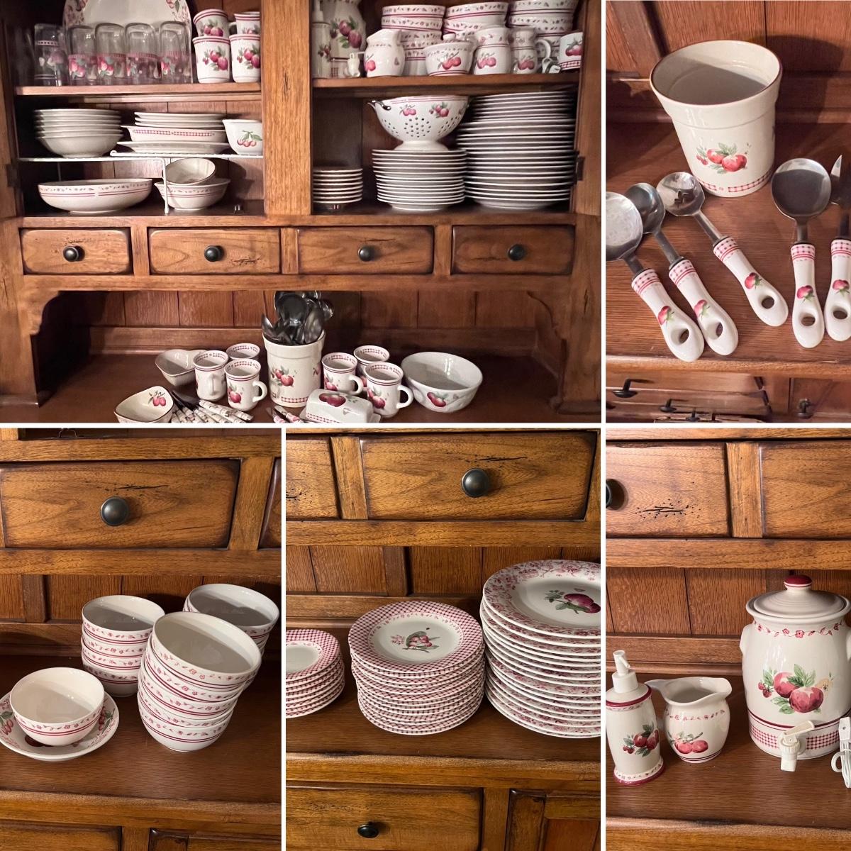 A huge lot of over 100 pieces of Pfaltzgraff ceramic dinnerware plus more in the ‘Delicious’ design. Amounts of each item vary, see photos for full inventory and measurements. Included are coffee cups, three sizes of drinking glasses (note the fading on most of them), colander, lidded butter dish, utensil holder with utensils and much more. There are three sizes of plates and two sizes for bowls. Sixteen dinner plates (two have small chips), thirteen salad and eight bread plates altogether. One of the fifteen smaller dessert bowls has a crack. The beautiful hutch in photos is available in another lot within this auction.