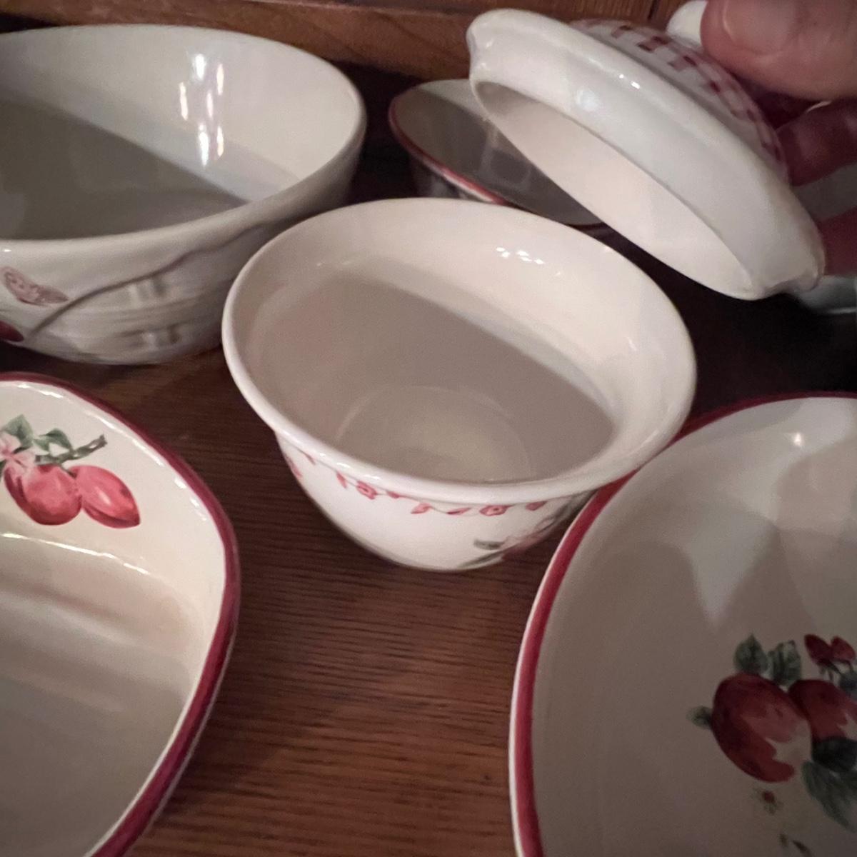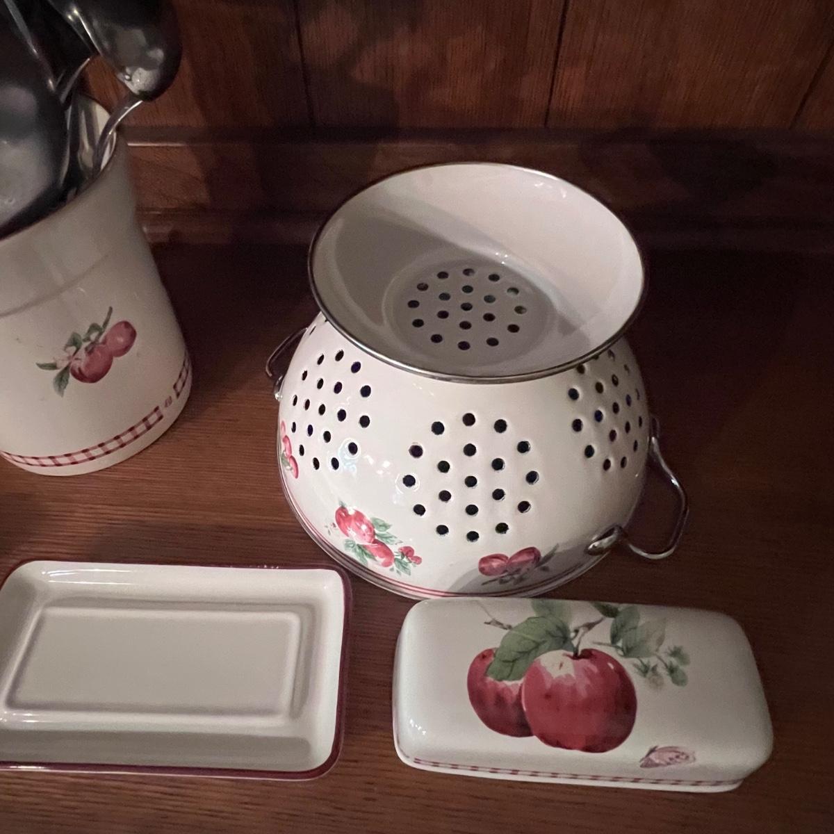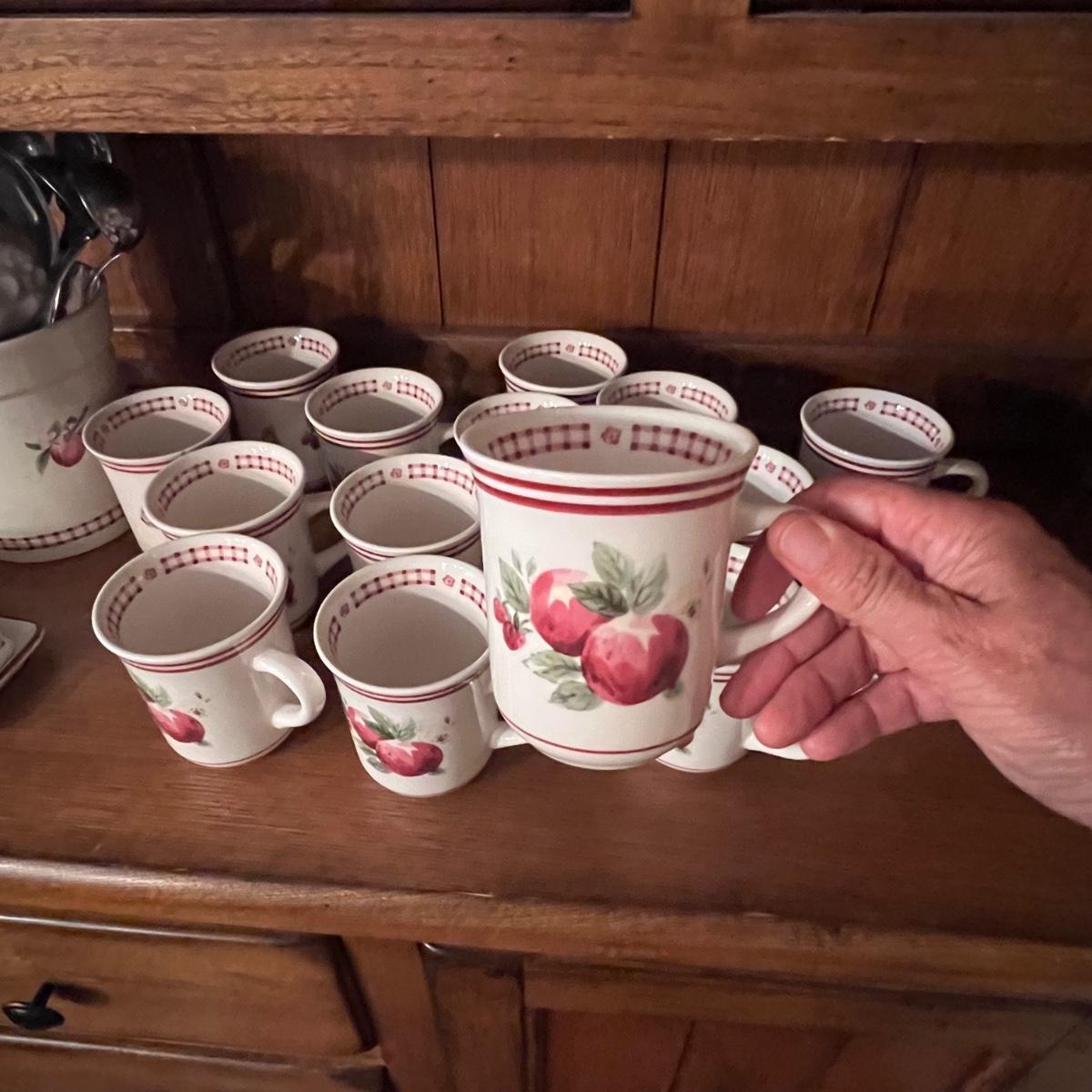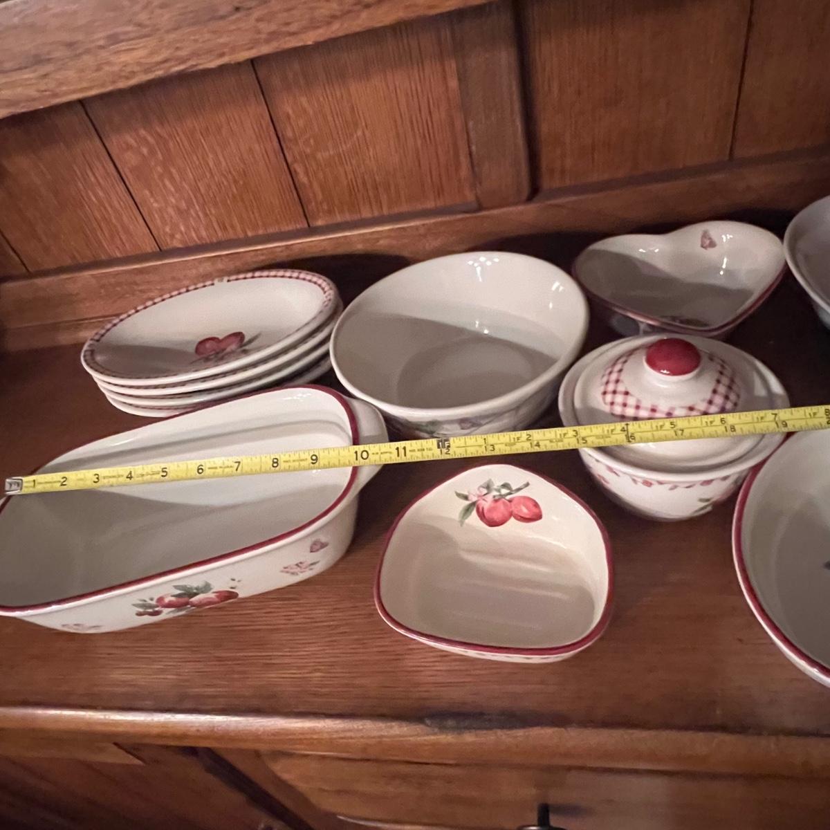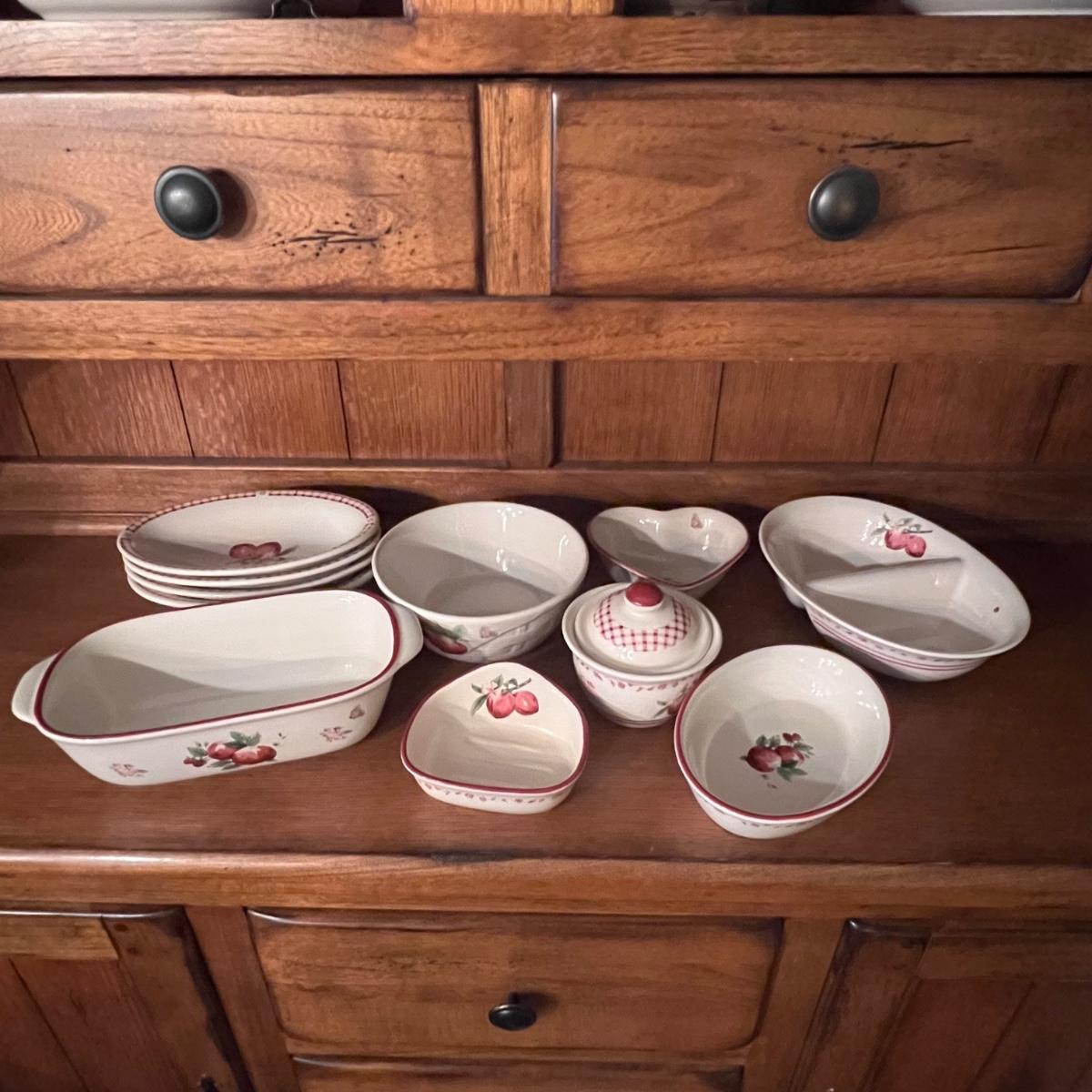 A huge lot of over 100 pieces of Pfaltzgraff ceramic dinnerware plus more in the ‘Delicious’ design. Amounts of each item vary, see photos for full inventory and measurements. Included are coffee cups, three sizes of drinking glasses (note the fading on most of them), colander, lidded butter dish, utensil holder with utensils and much more. There are three sizes of plates and two sizes for bowls. Sixteen dinner plates (two have small chips), thirteen salad and eight bread plates altogether. One of the fifteen smaller dessert bowls has a crack. The beautiful hutch in photos is available in another lot within this auction.
