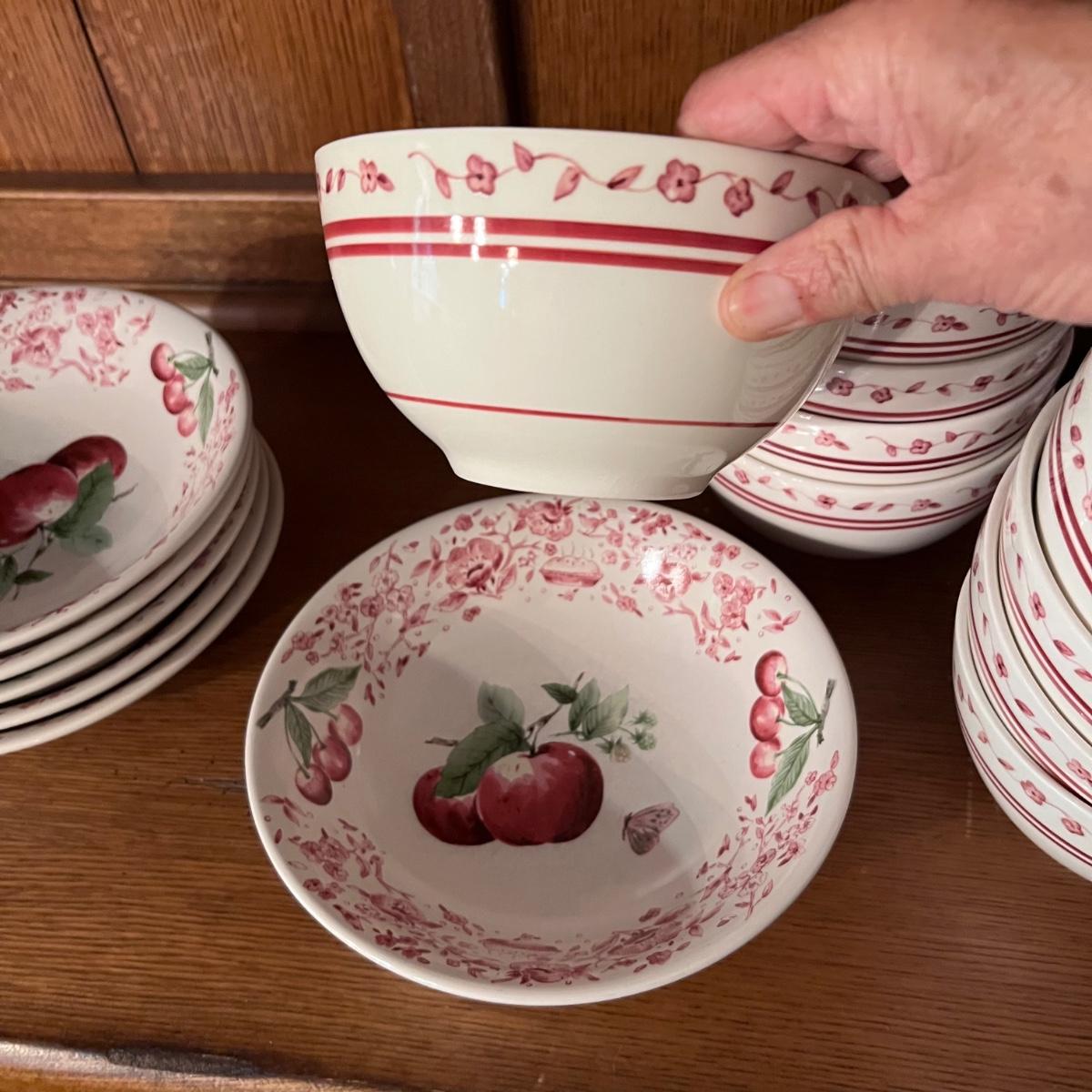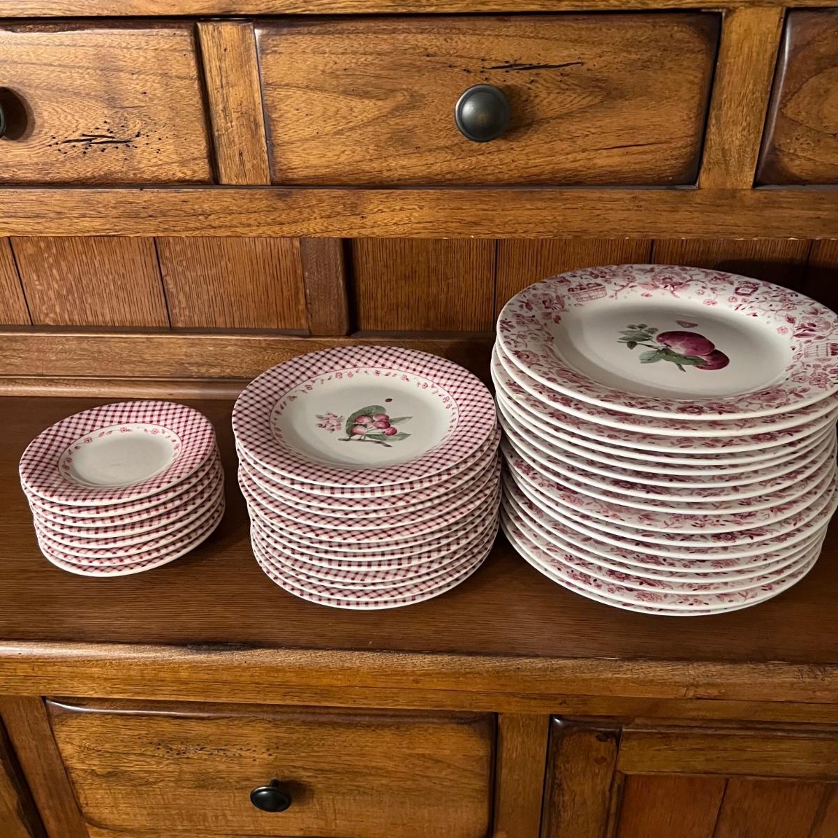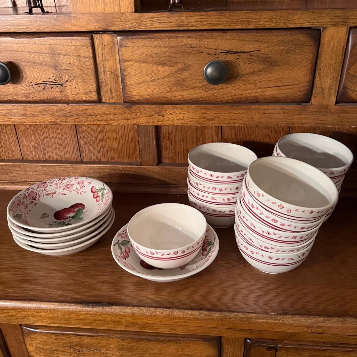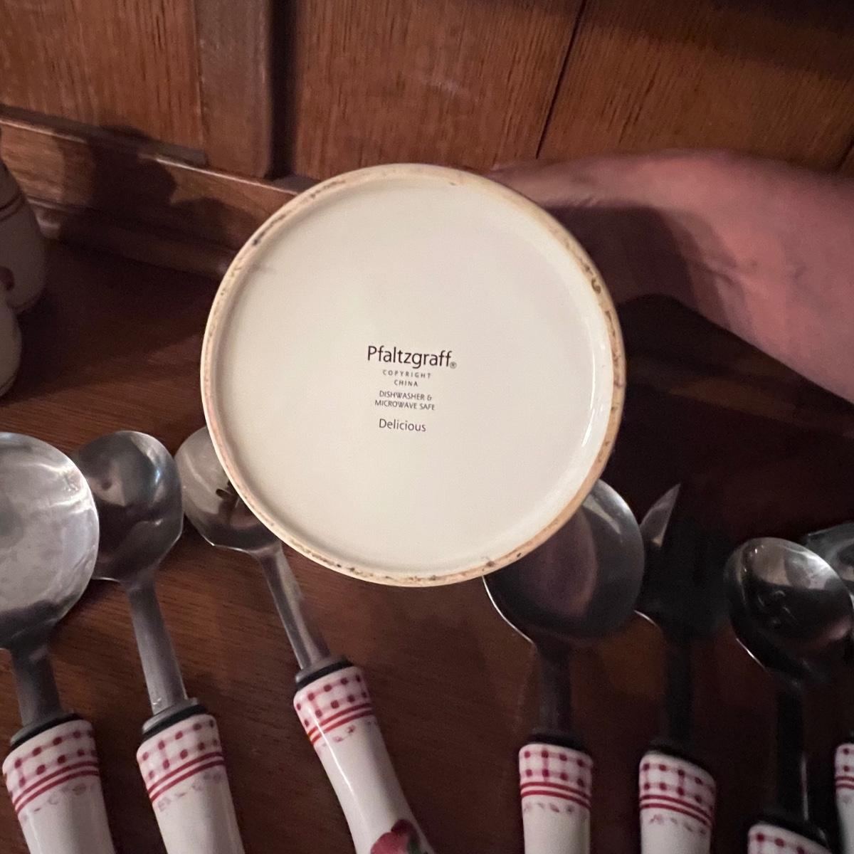 A huge lot of over 100 pieces of Pfaltzgraff ceramic dinnerware plus more in the ‘Delicious’ design. Amounts of each item vary, see photos for full inventory and measurements. Included are coffee cups, three sizes of drinking glasses (note the fading on most of them), colander, lidded butter dish, utensil holder with utensils and much more. There are three sizes of plates and two sizes for bowls. Sixteen dinner plates (two have small chips), thirteen salad and eight bread plates altogether. One of the fifteen smaller dessert bowls has a crack. The beautiful hutch in photos is available in another lot within this auction.