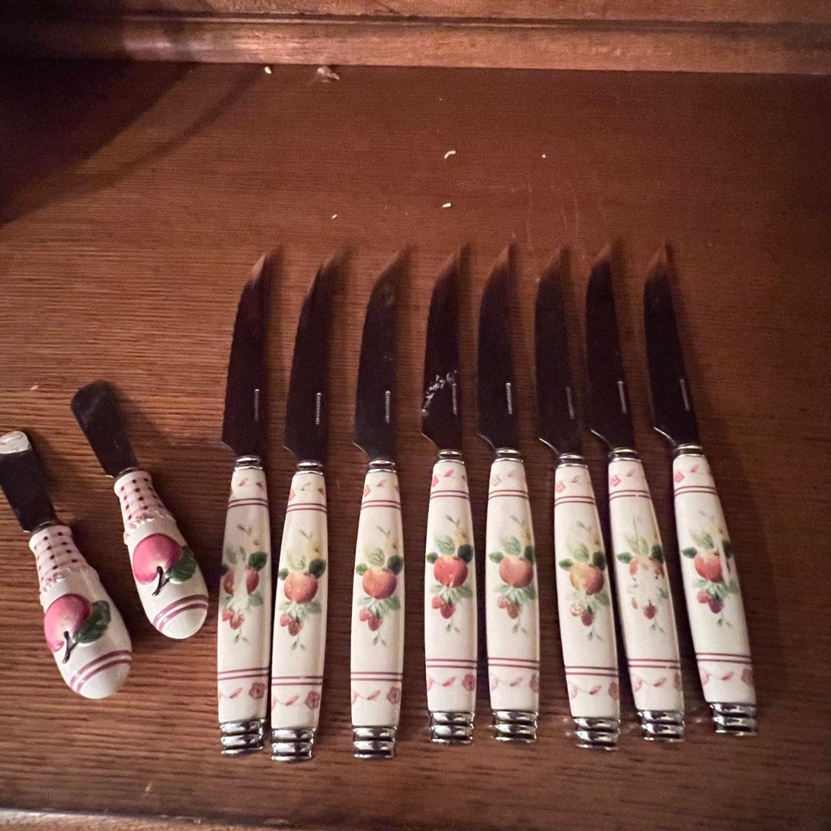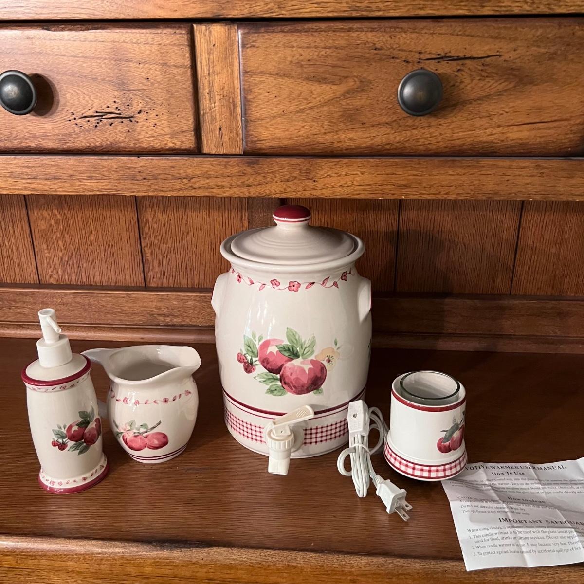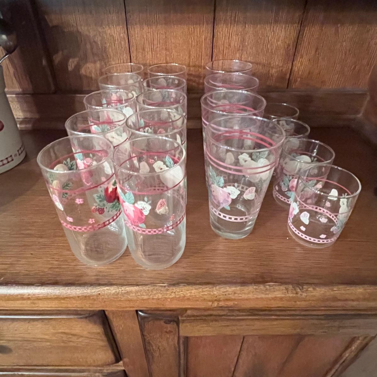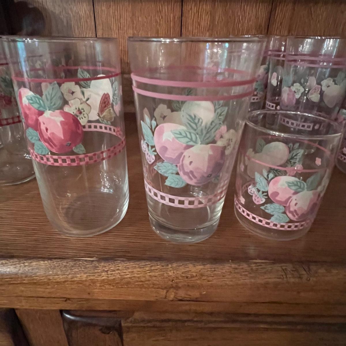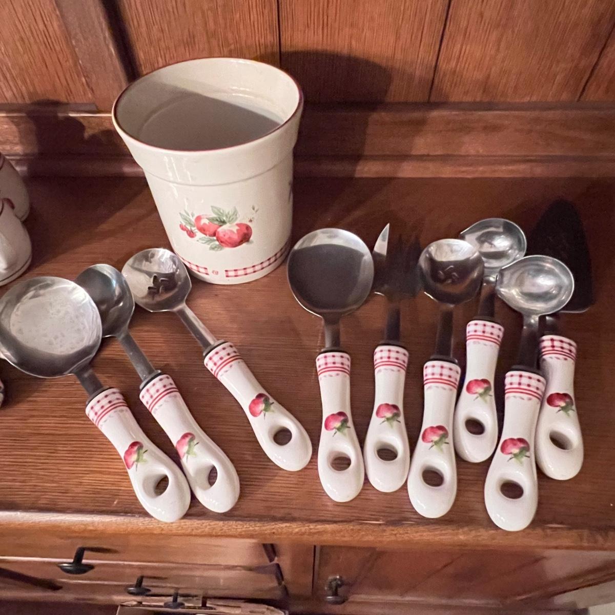 A huge lot of over 100 pieces of Pfaltzgraff ceramic dinnerware plus more in the ‘Delicious’ design. Amounts of each item vary, see photos for full inventory and measurements. Included are coffee cups, three sizes of drinking glasses (note the fading on most of them), colander, lidded butter dish, utensil holder with utensils and much more. There are three sizes of plates and two sizes for bowls. Sixteen dinner plates (two have small chips), thirteen salad and eight bread plates altogether. One of the fifteen smaller dessert bowls has a crack. The beautiful hutch in photos is available in another lot within this auction.