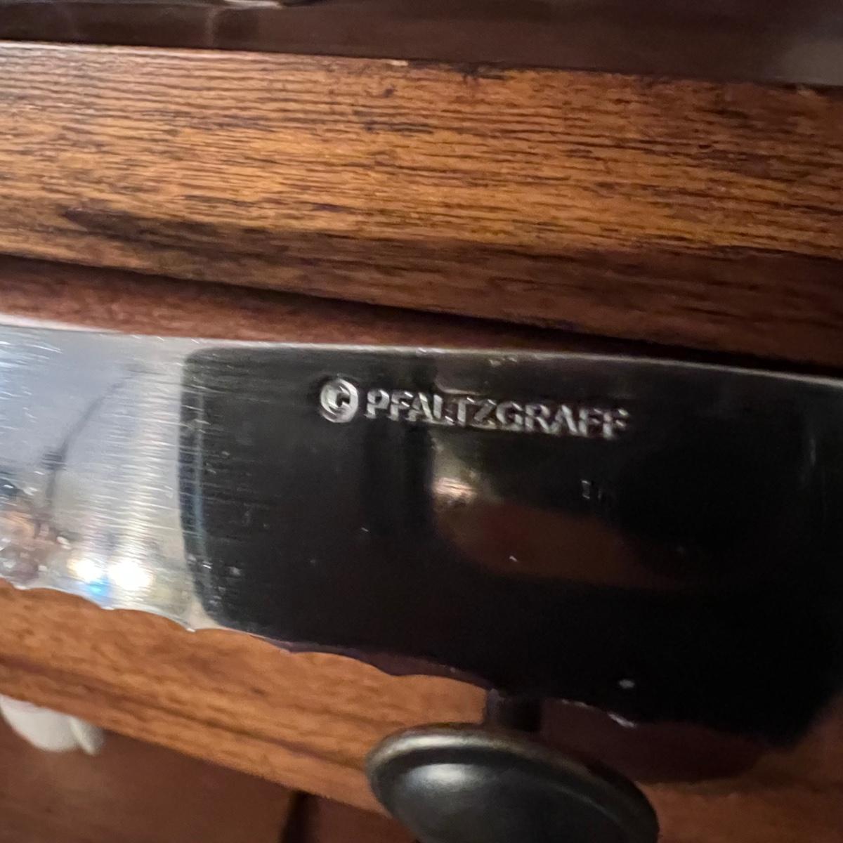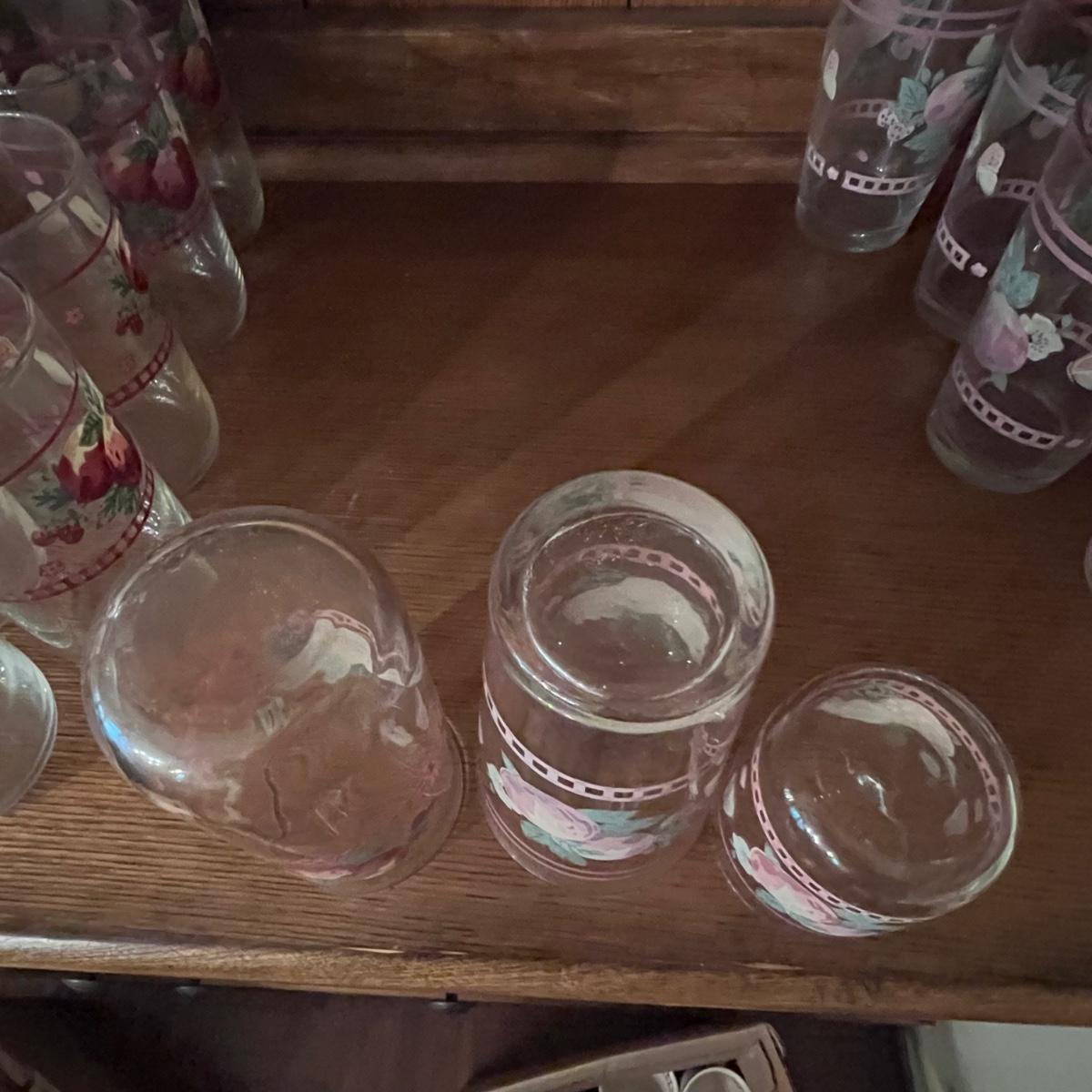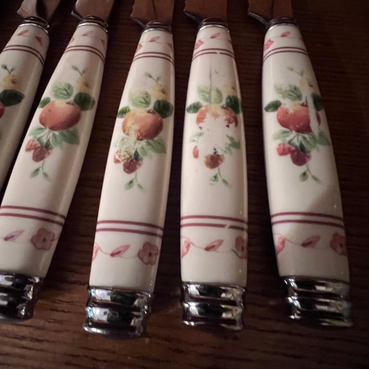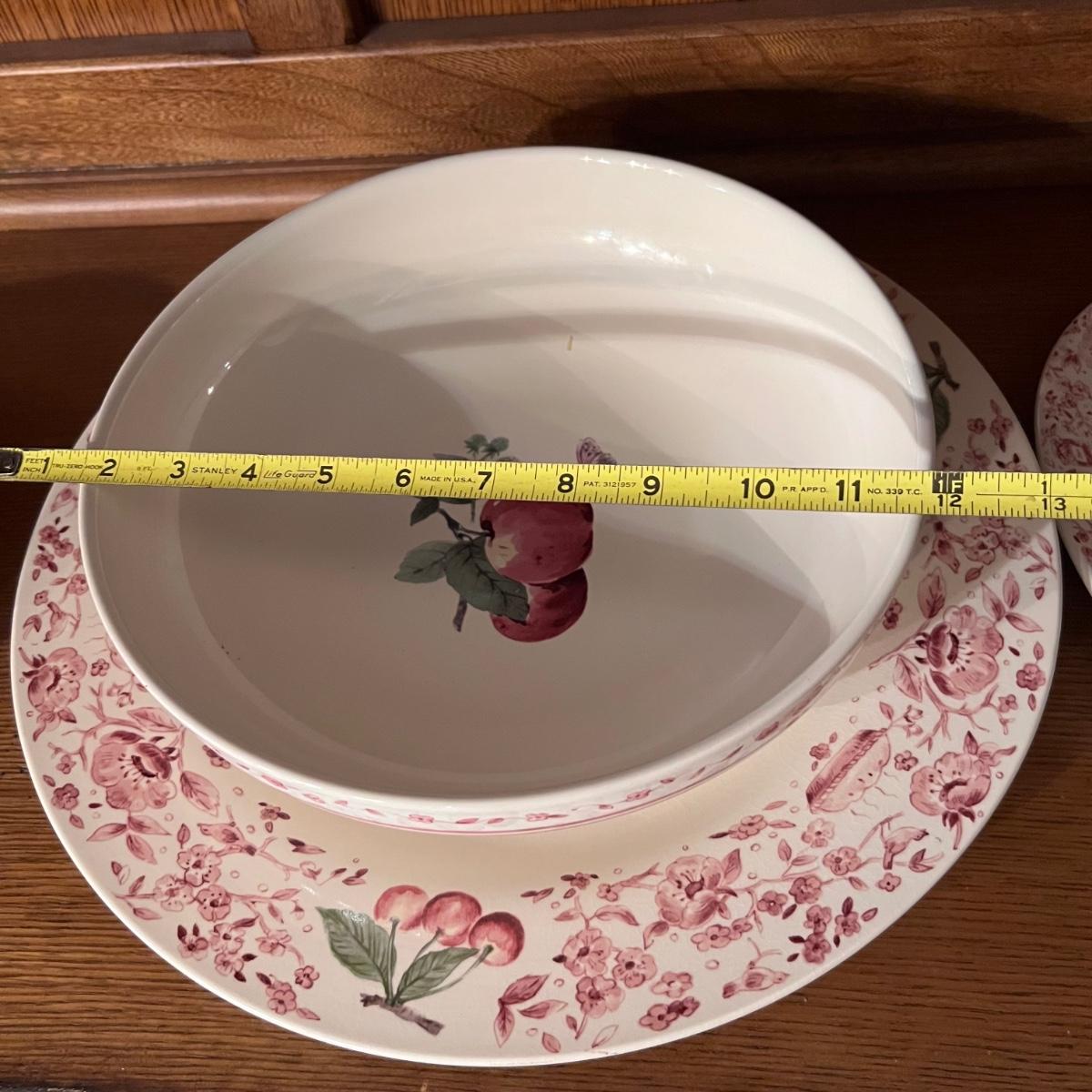 A huge lot of over 100 pieces of Pfaltzgraff ceramic dinnerware plus more in the ‘Delicious’ design. Amounts of each item vary, see photos for full inventory and measurements. Included are coffee cups, three sizes of drinking glasses (note the fading on most of them), colander, lidded butter dish, utensil holder with utensils and much more. There are three sizes of plates and two sizes for bowls. Sixteen dinner plates (two have small chips), thirteen salad and eight bread plates altogether. One of the fifteen smaller dessert bowls has a crack. The beautiful hutch in photos is available in another lot within this auction.