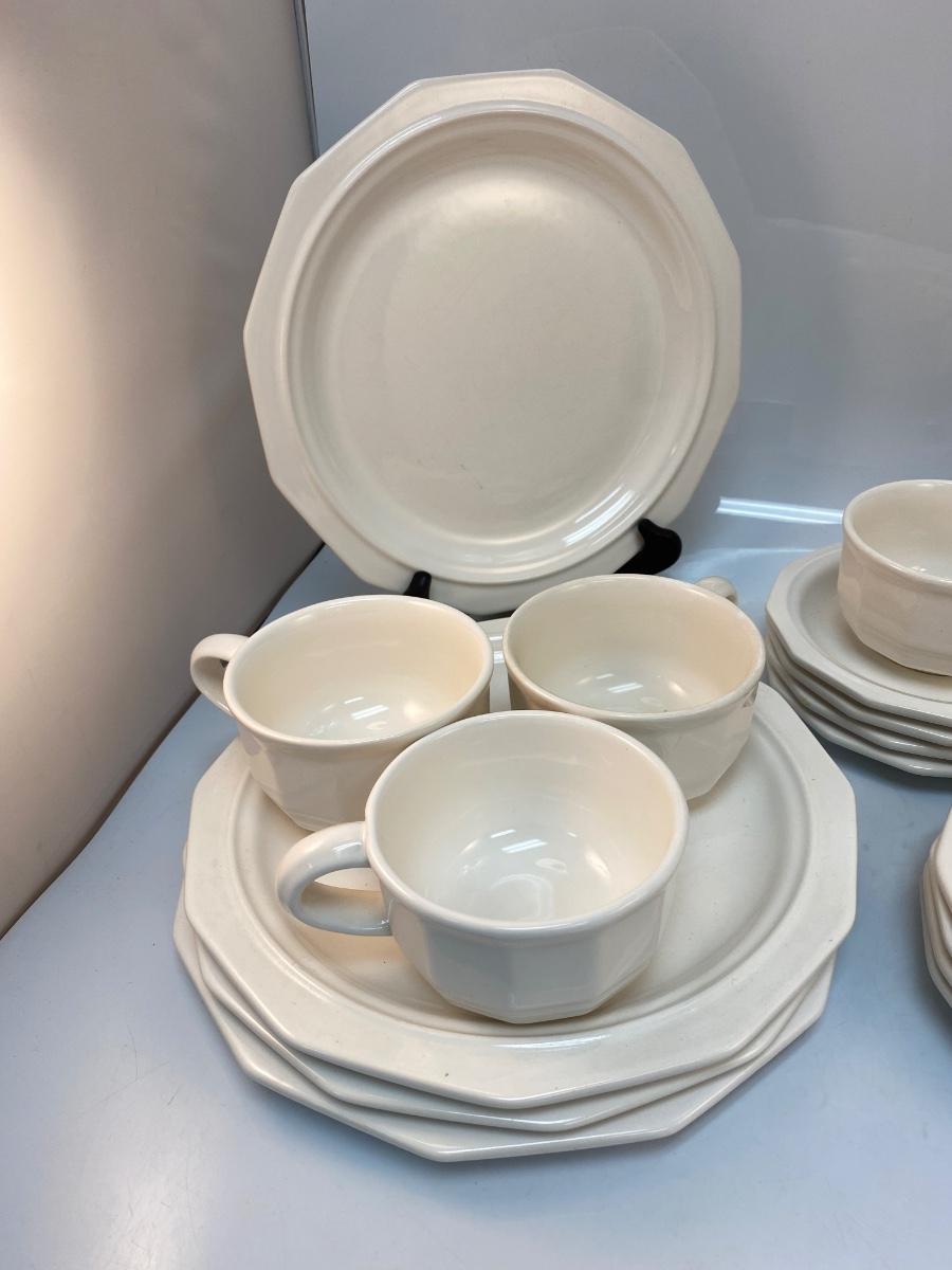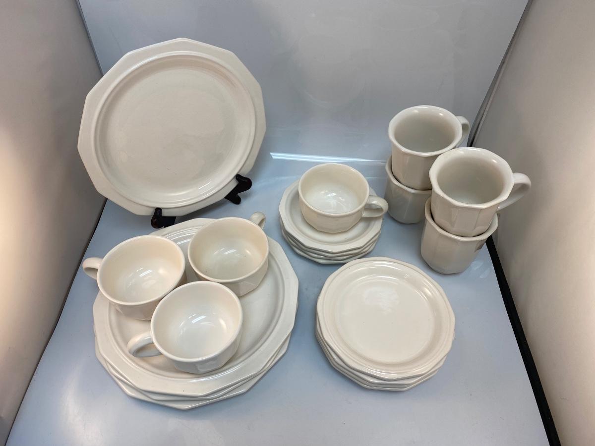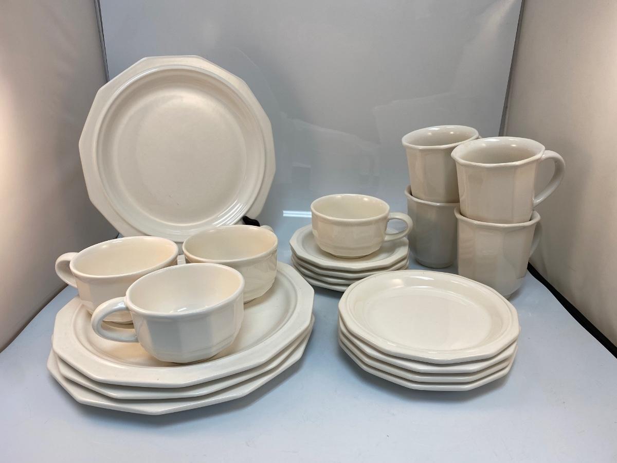 Pfaltzgraff Heritage White Ceramic Dishware 5 Piece Place Setting Set for 4. Includes 4 each - dinner plate, bread plate, saucer, teacup, coffee mug. All pieces are in good condition, no chips.