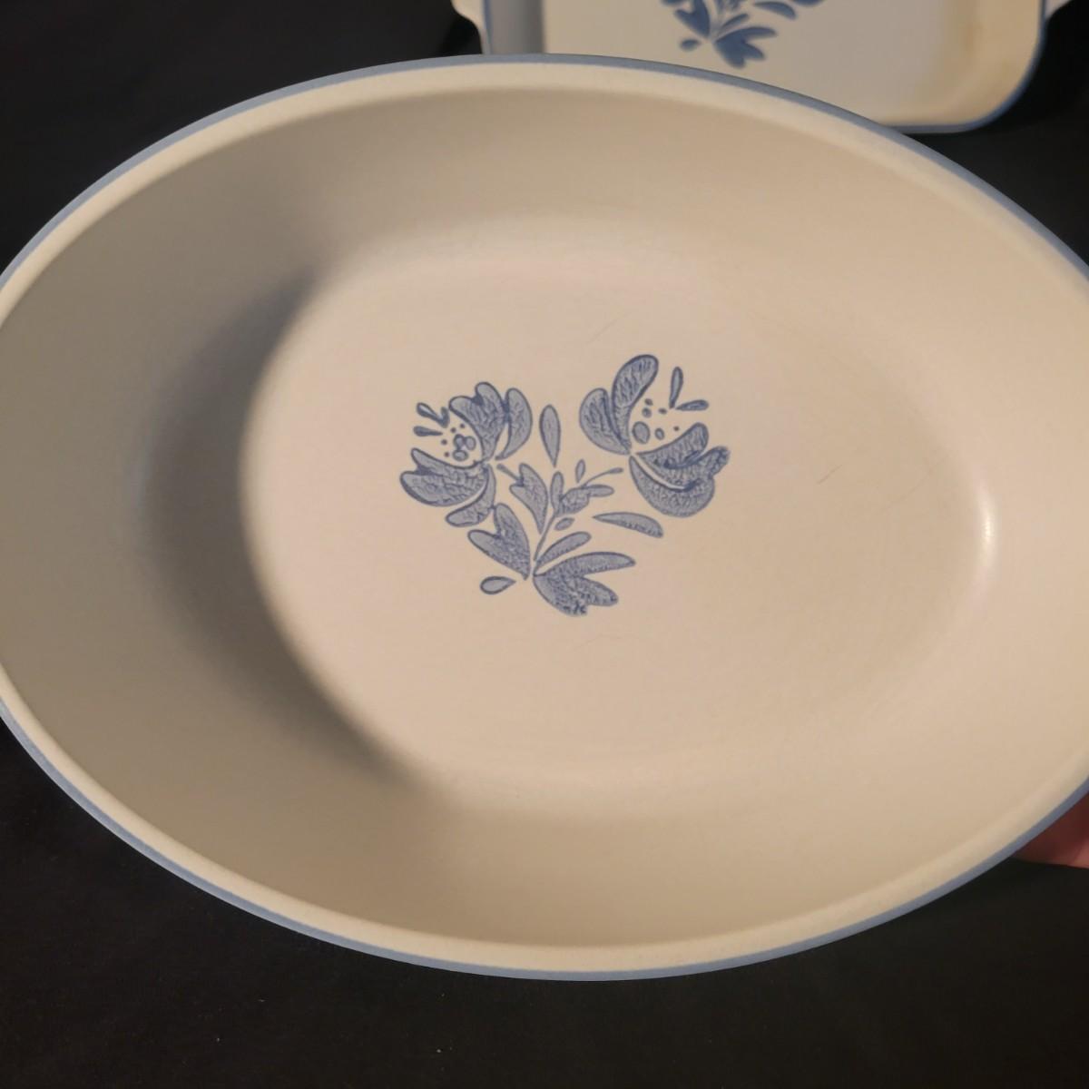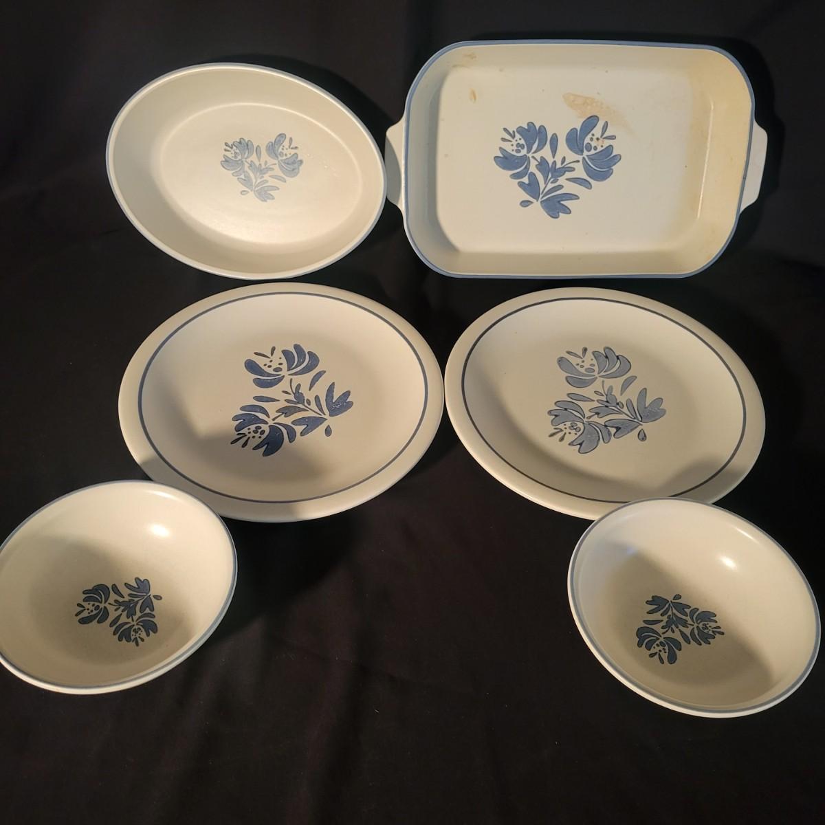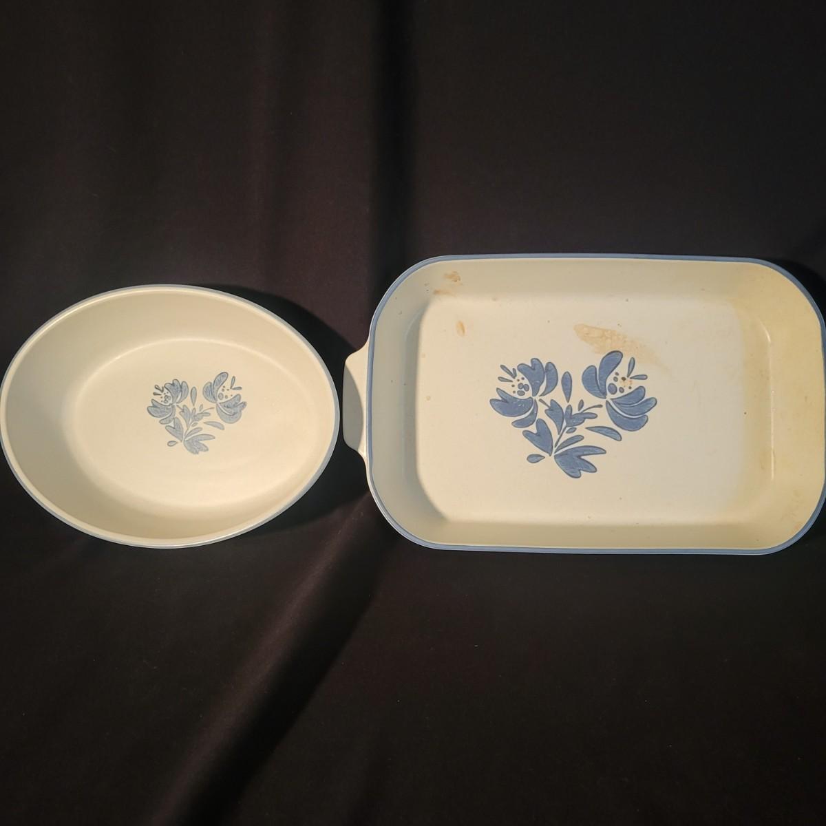 A collection of Pfaltzgraff kitchenware in good condition. Included are two bowls and plates, a medium sized baking dish, and a large baking dish. Large baking dish measures approximately 14" x 8" x 2". One bowl does have a chip and the large baking dish does appear to be permanently stained. Shipping available. Shipping can be costly please call UPS store at 828-252-6930 for estimate