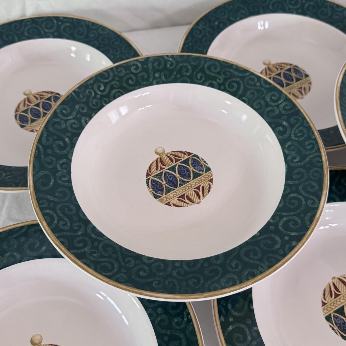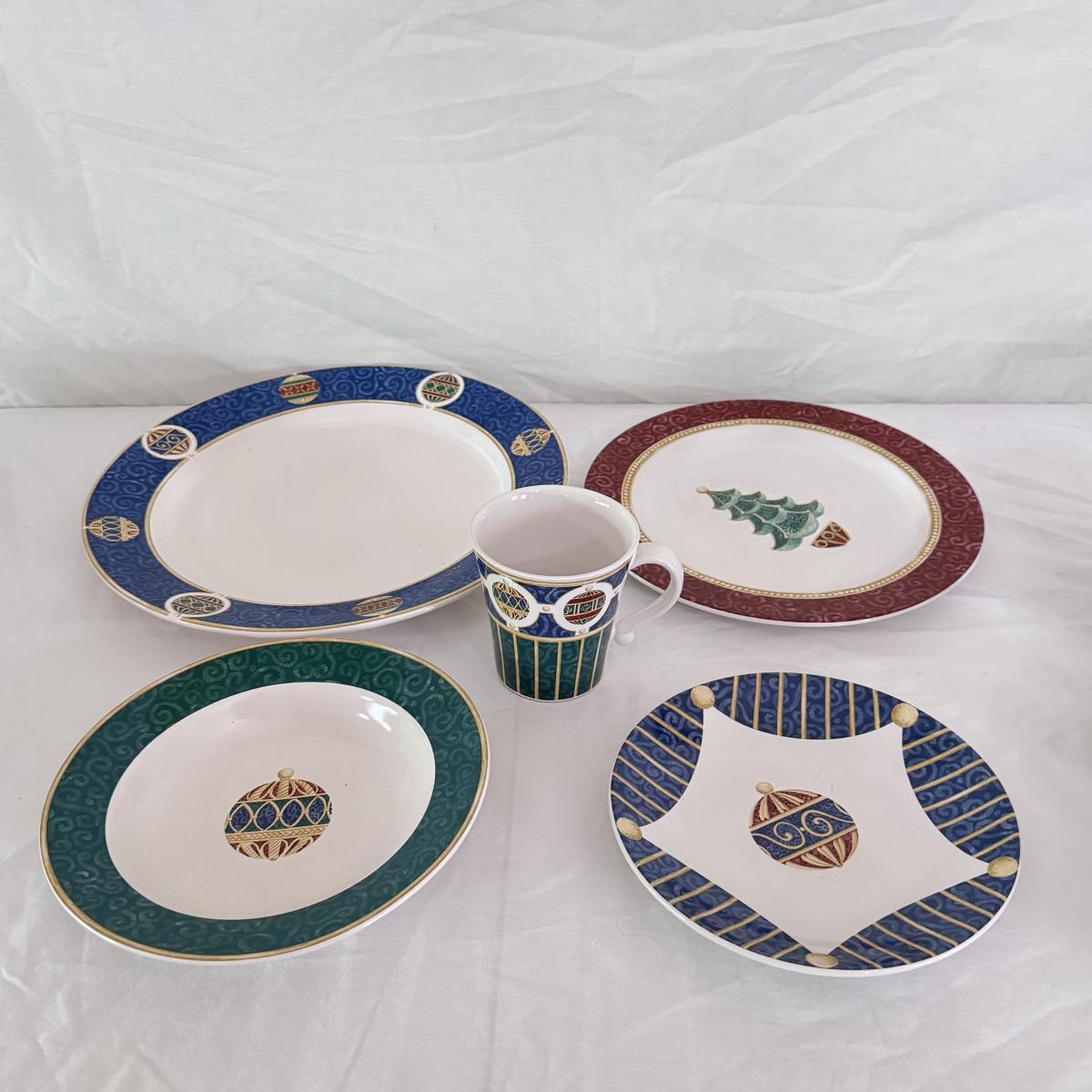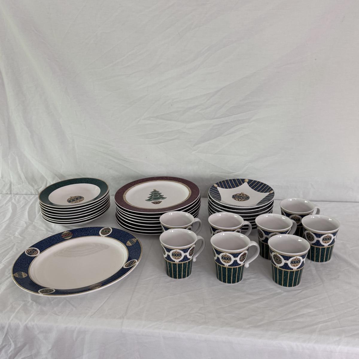 This lot includes the Pfaltzgraff “Royal Holiday” ceramic collection of eight green plates with an ornament, eight red plates with Christmas trees, eight navy plates with ornaments, one large serving plate, and eight mugs. See pictures for all details. The larger serving plate measures 13.5” x 1.5”H. Shipping available.