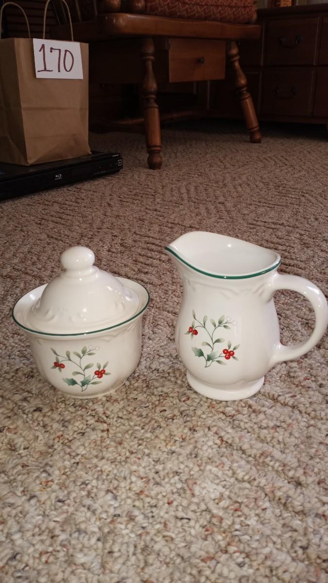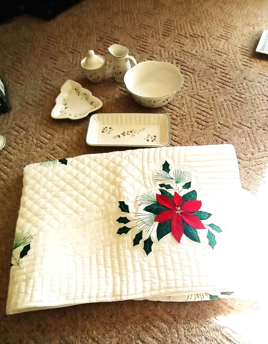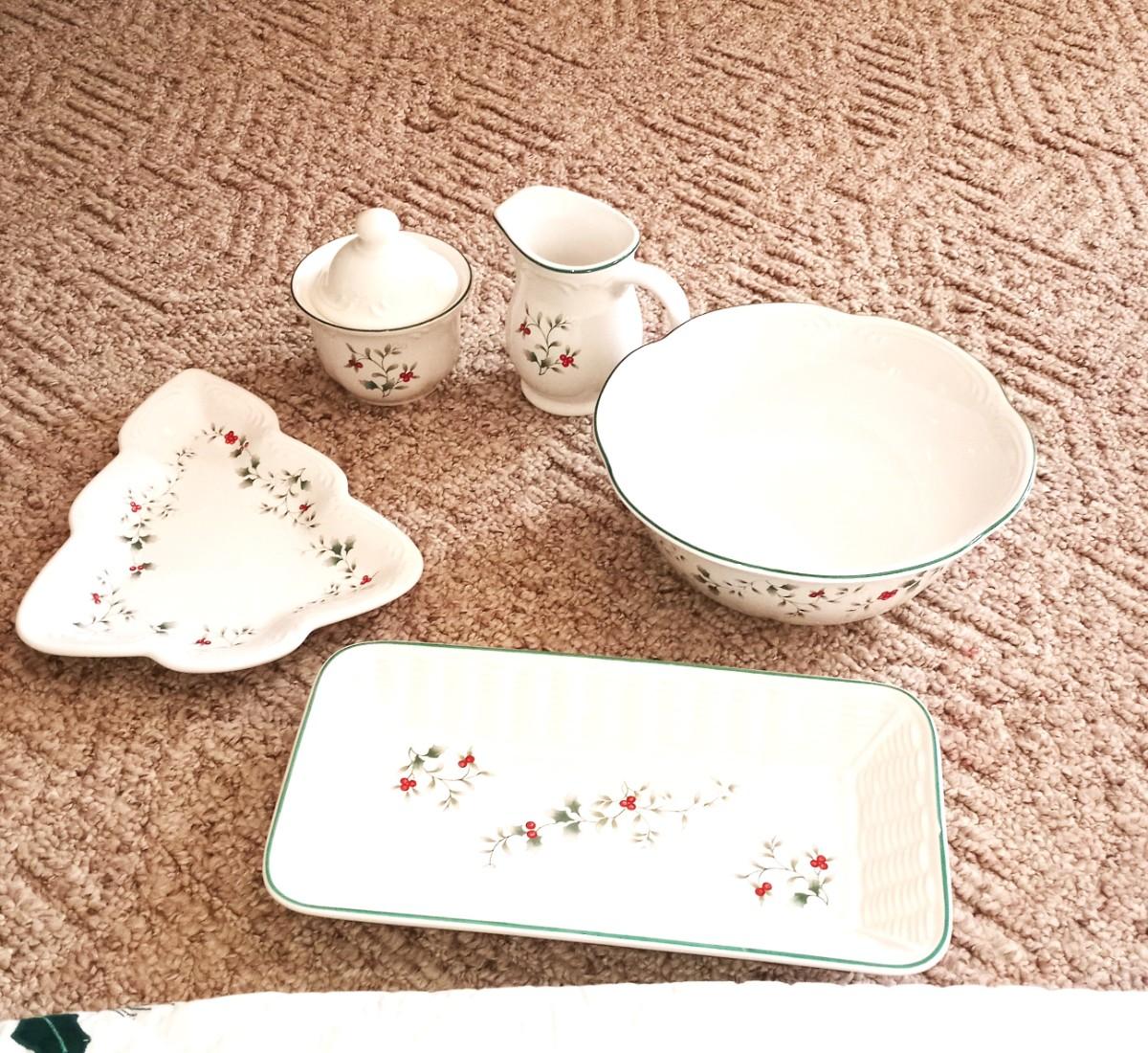 PFALTZGRAFF HOLIDAY SERVING BOWL-TWO SHALLOW DISHES-SUGAR & CREAMER-TABLE COVER