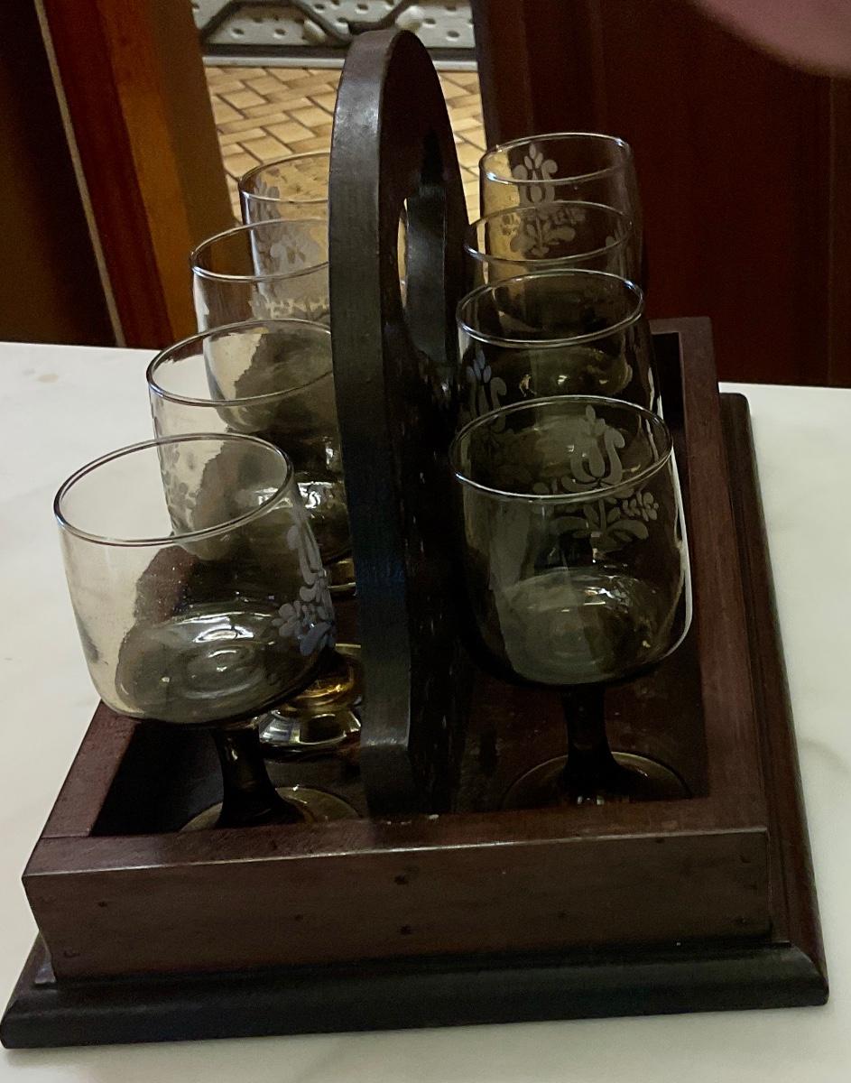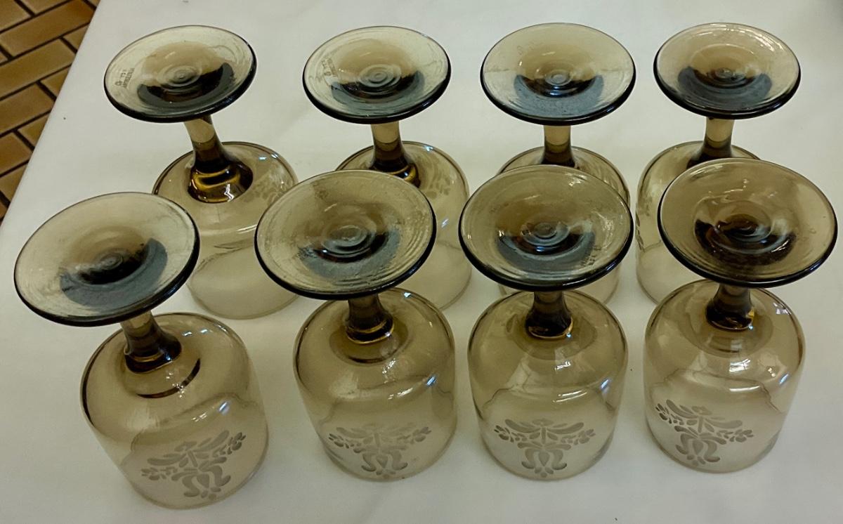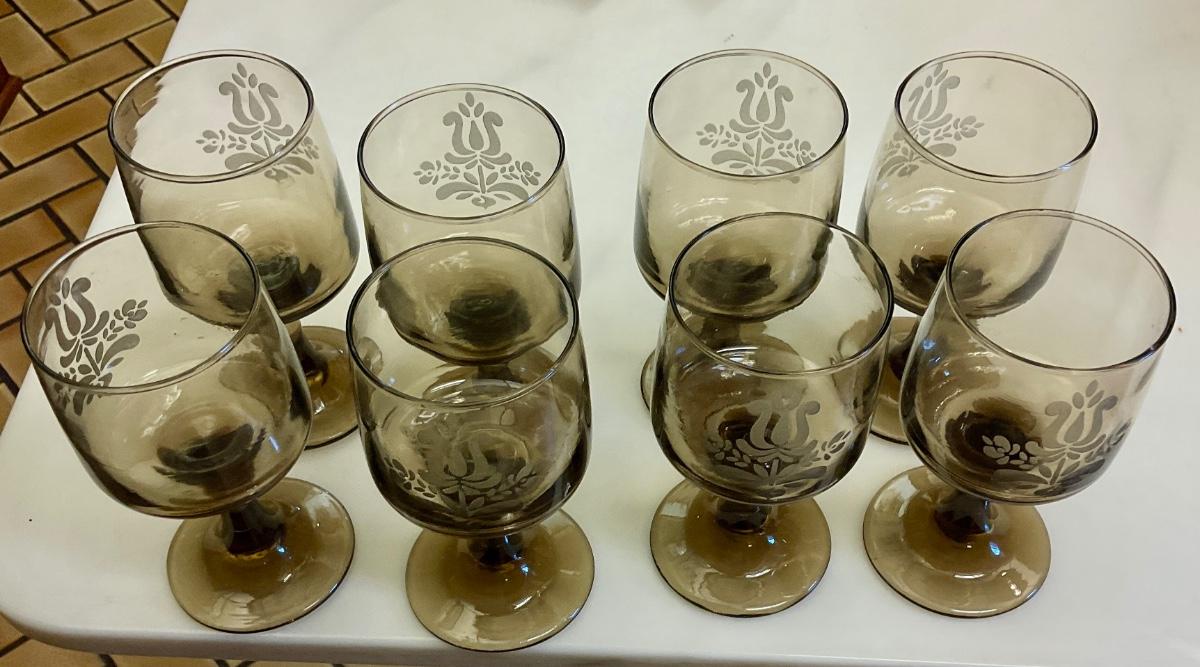 Pfaltzgraff Village glassware smoke color 8 stems and wooden carrier
