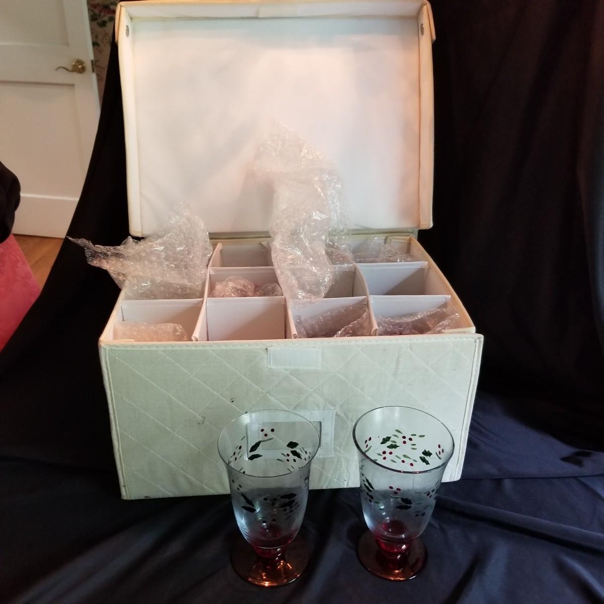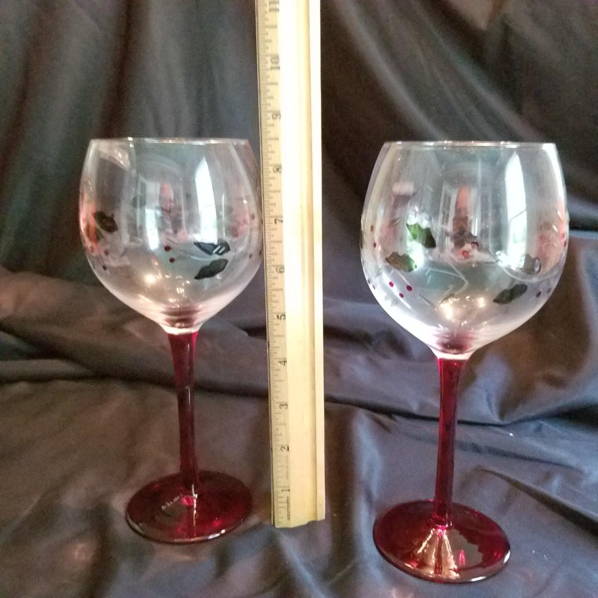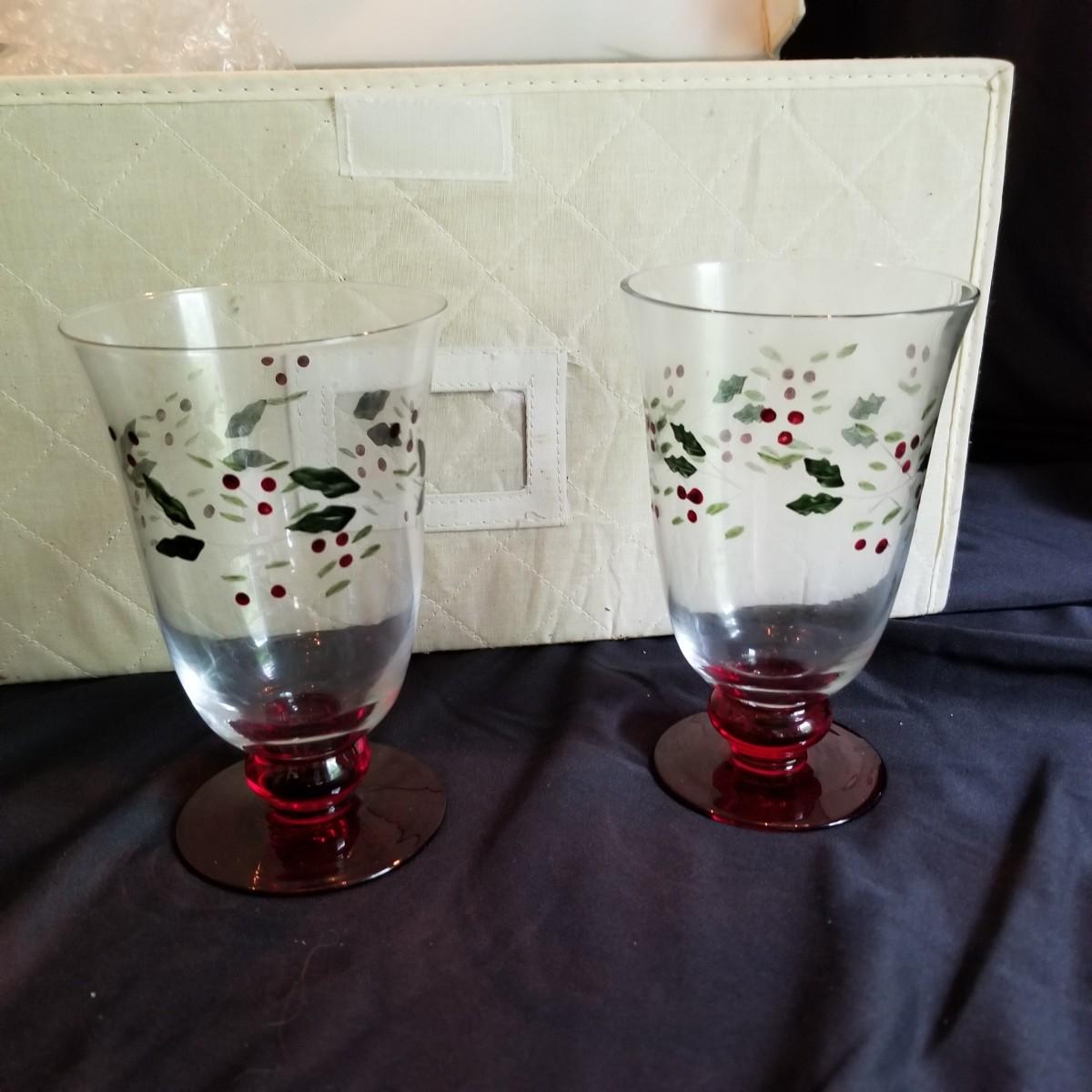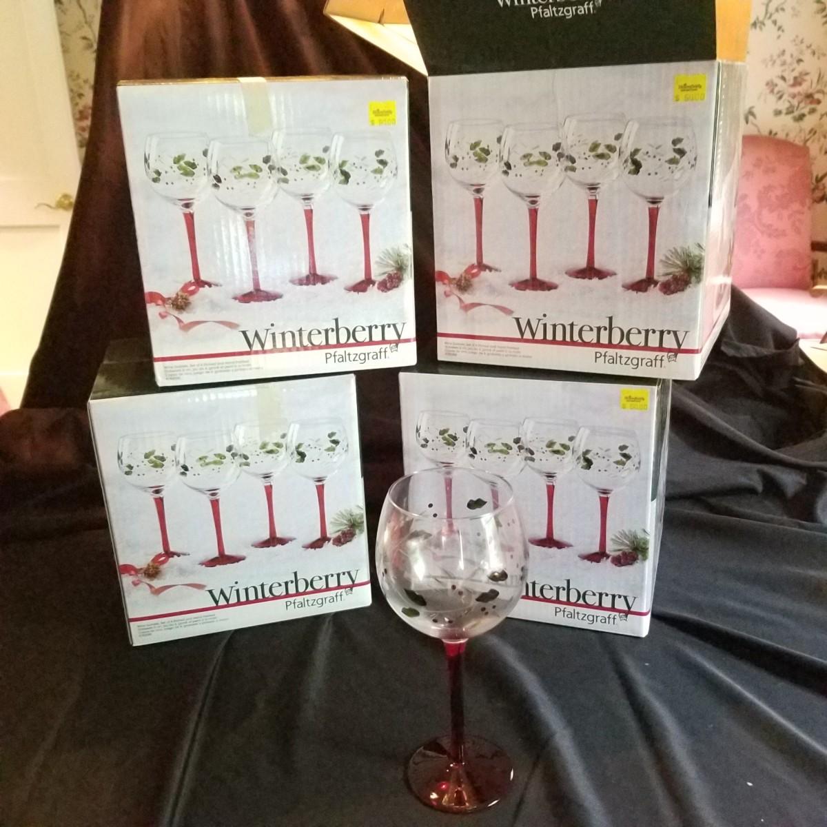 Hand painted wine goblets and water glasses in the 'Winterberry' pattern by Pfaltzgraff. Four boxes of four each wine glasses, 8 1/2" tall. New in box. Also eight 6" tall water glasses in protective storage case, lightly used. All items have red stems with painted bowls. Shipping available.