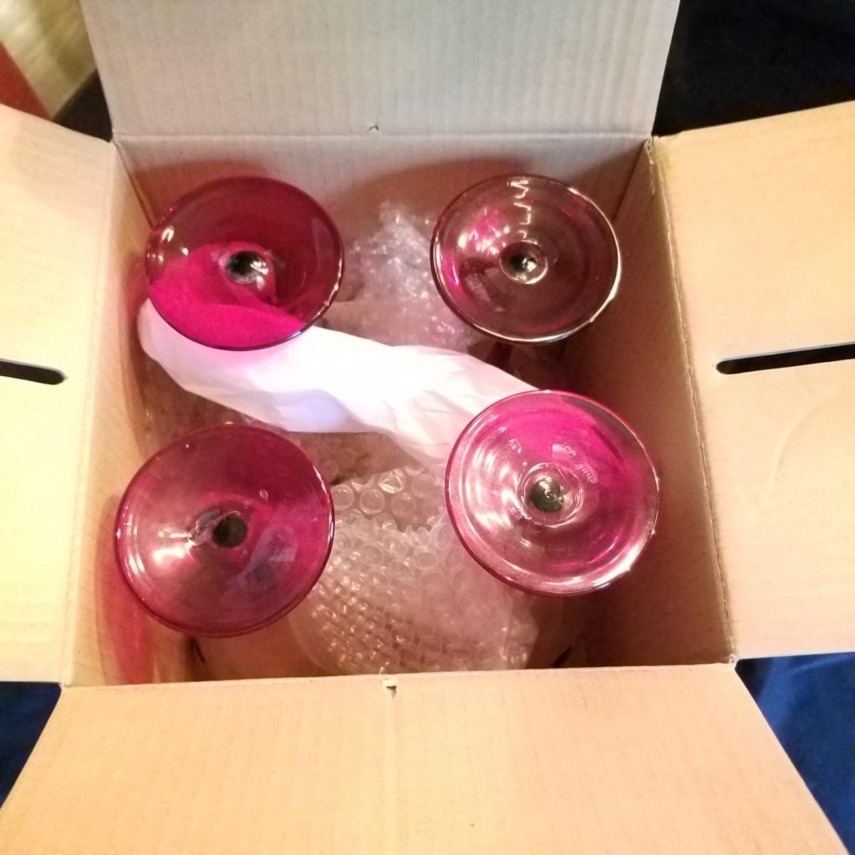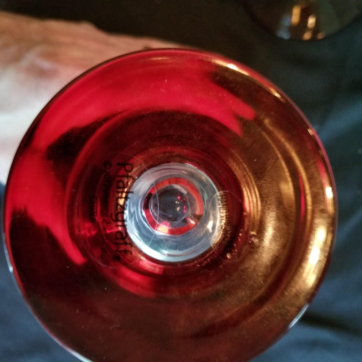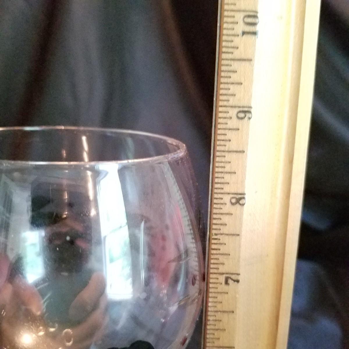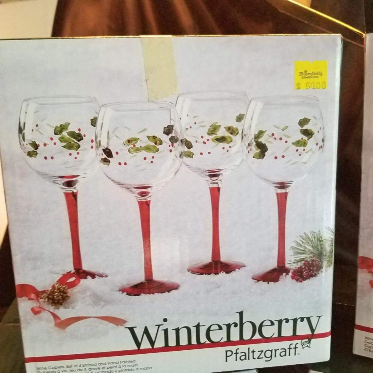 Hand painted wine goblets and water glasses in the 'Winterberry' pattern by Pfaltzgraff. Four boxes of four each wine glasses, 8 1/2" tall. New in box. Also eight 6" tall water glasses in protective storage case, lightly used. All items have red stems with painted bowls. Shipping available.
