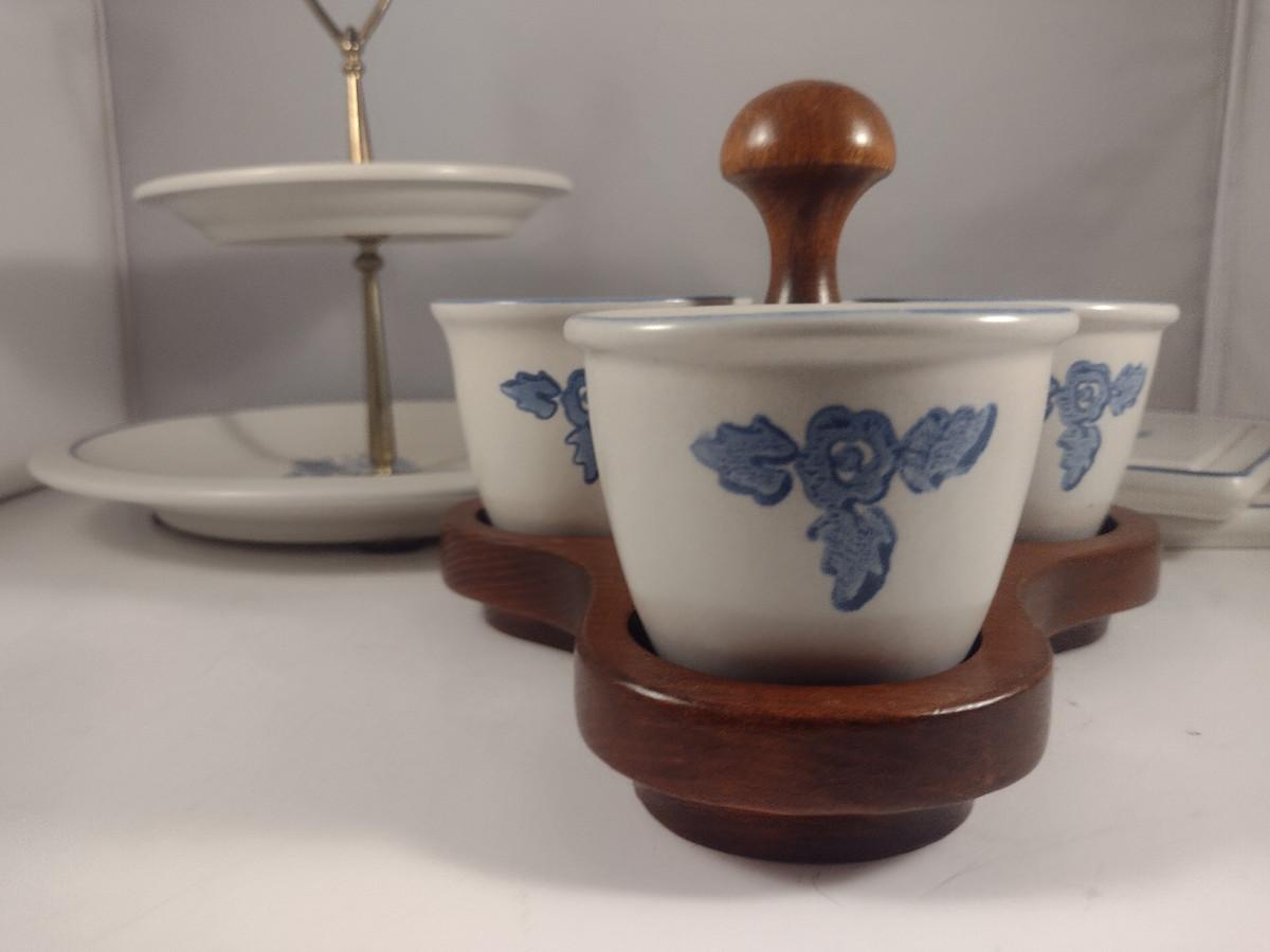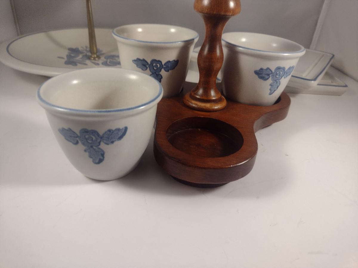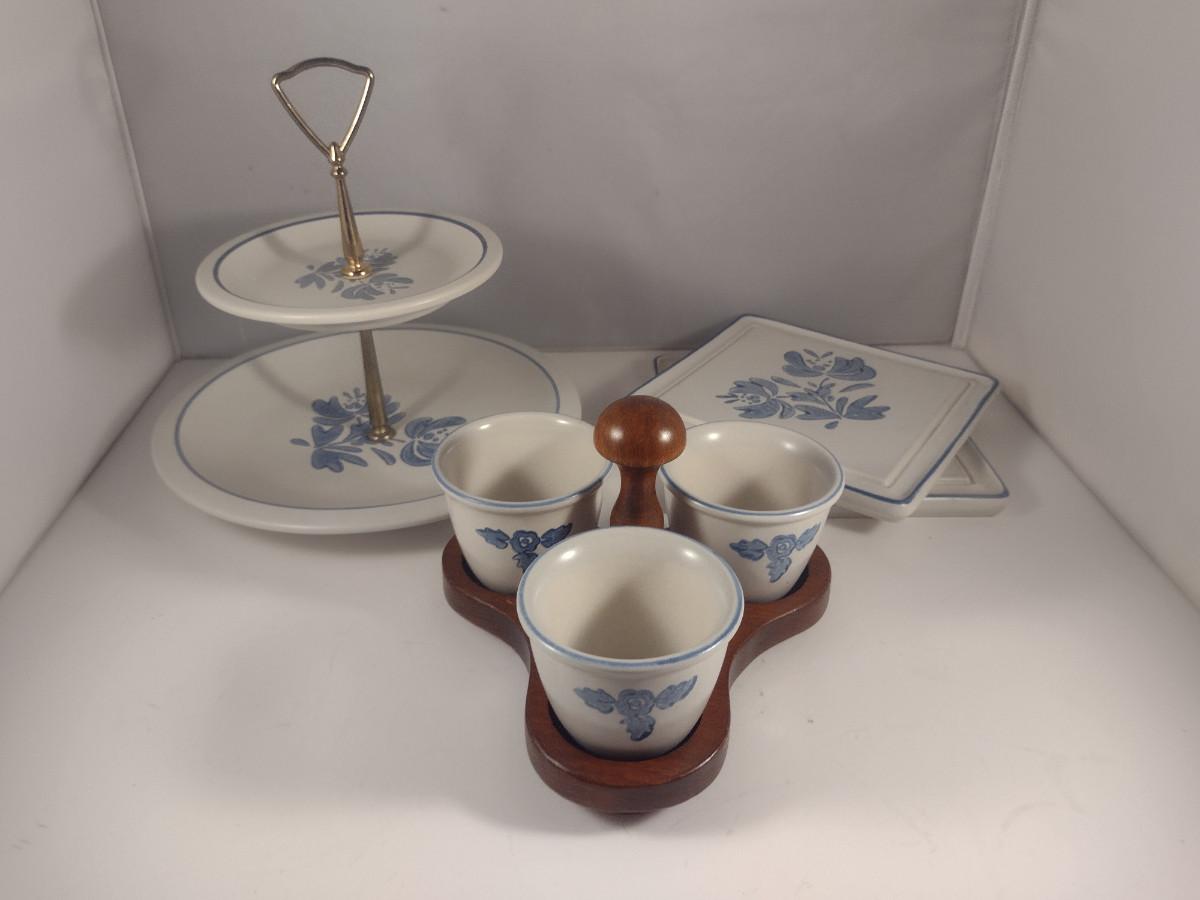 Pfaltzgraff Yorktowne Pottery Table Ware- Trivets, Condiment Caddy, Two Tier Tidbit Tray. Handle for tidbit tray does not tighten securely- needs work.
