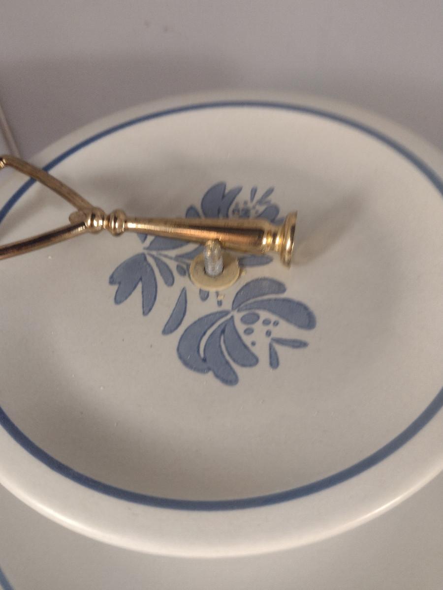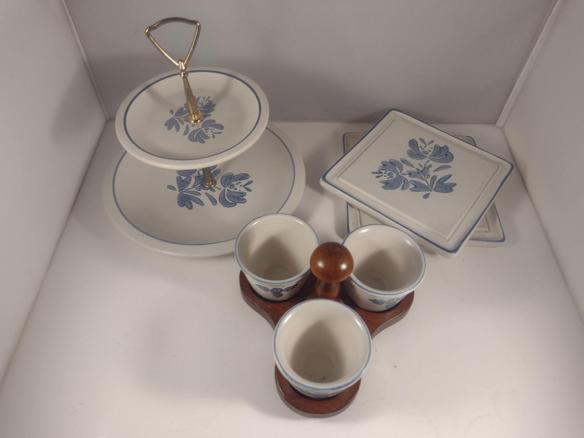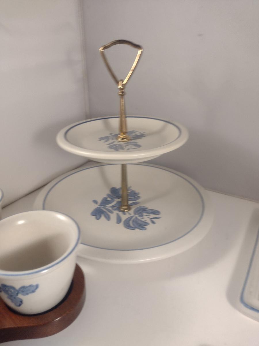 Pfaltzgraff Yorktowne Pottery Table Ware- Trivets, Condiment Caddy, Two Tier Tidbit Tray. Handle for tidbit tray does not tighten securely- needs work.