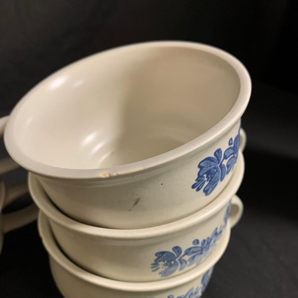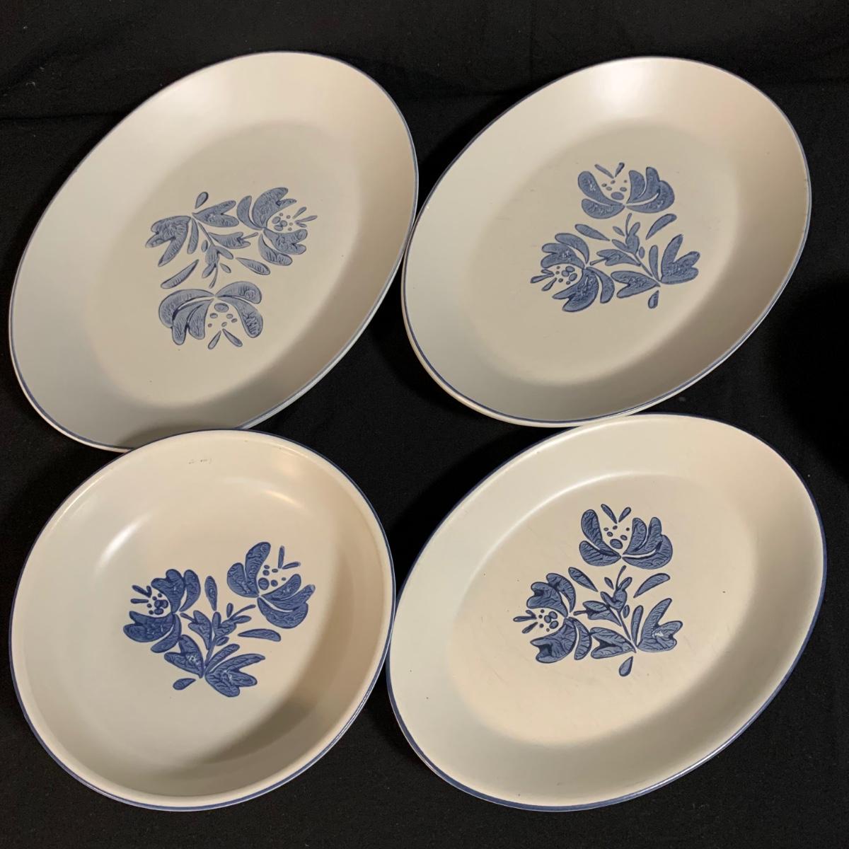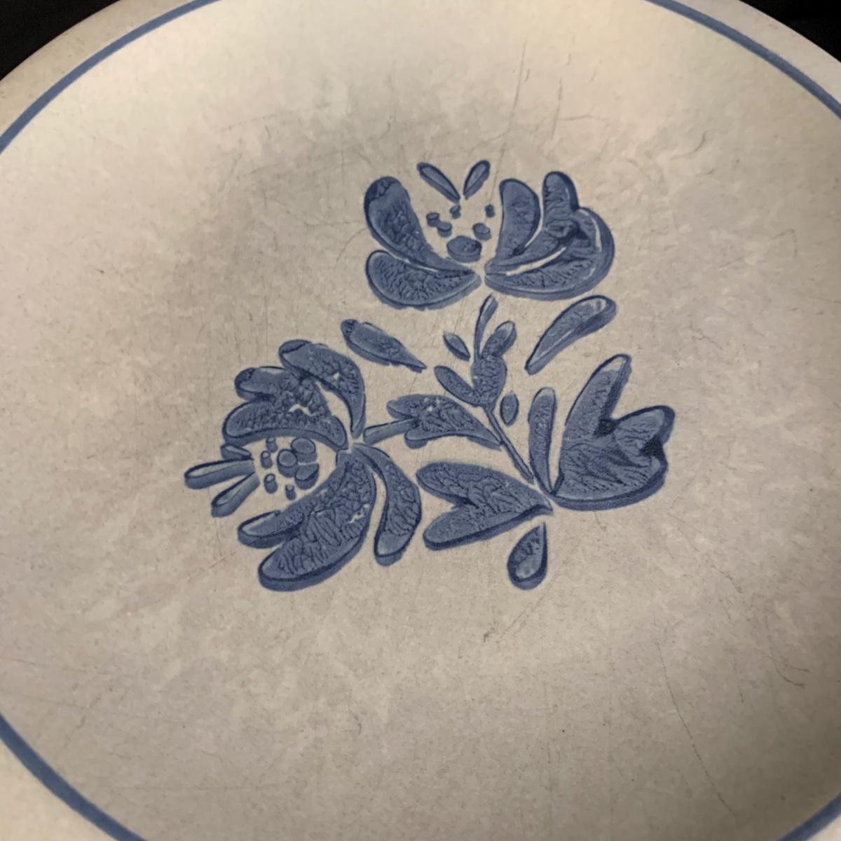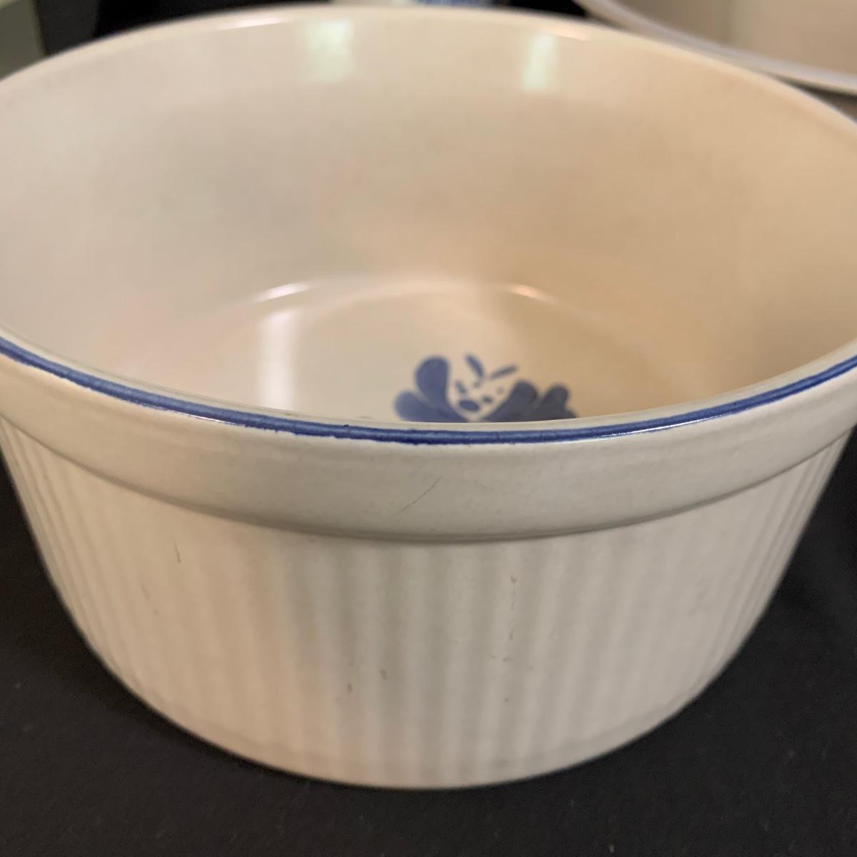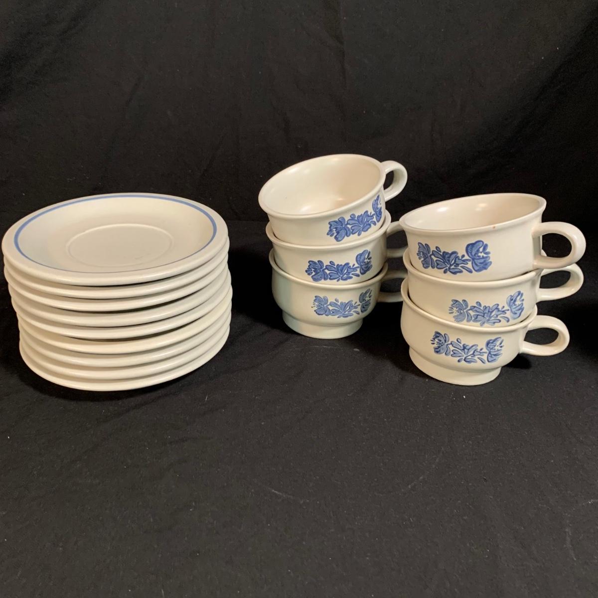 Yorktowne collection by Pfaltzgraff, stoneware dinnerware set. This large set includes: six 10.5” dinner plates, five 7” salad plates, six 6” soup/cereal bowls, four 12 oz. onion soup bowls, 9 saucers, 6 teacups, 3 oval serving dishes, one round baking dish, a pitcher and bowl set, a sugar crock and milk pitcher, a small round gravy boat, a salt and pepper set, and 8 napkin rings. There are also some printouts that list the different Yorktowne stoneware pieces as well as care instructions. The set is in very good condition structurally, with the exception of some chips on the sugar crock lid and two teacups with small chips. There are some scratches seen on some of the plate surfaces, likely from knives, as well as some crazing and blemishes on the salt and pepper shakers. Local pickup only.