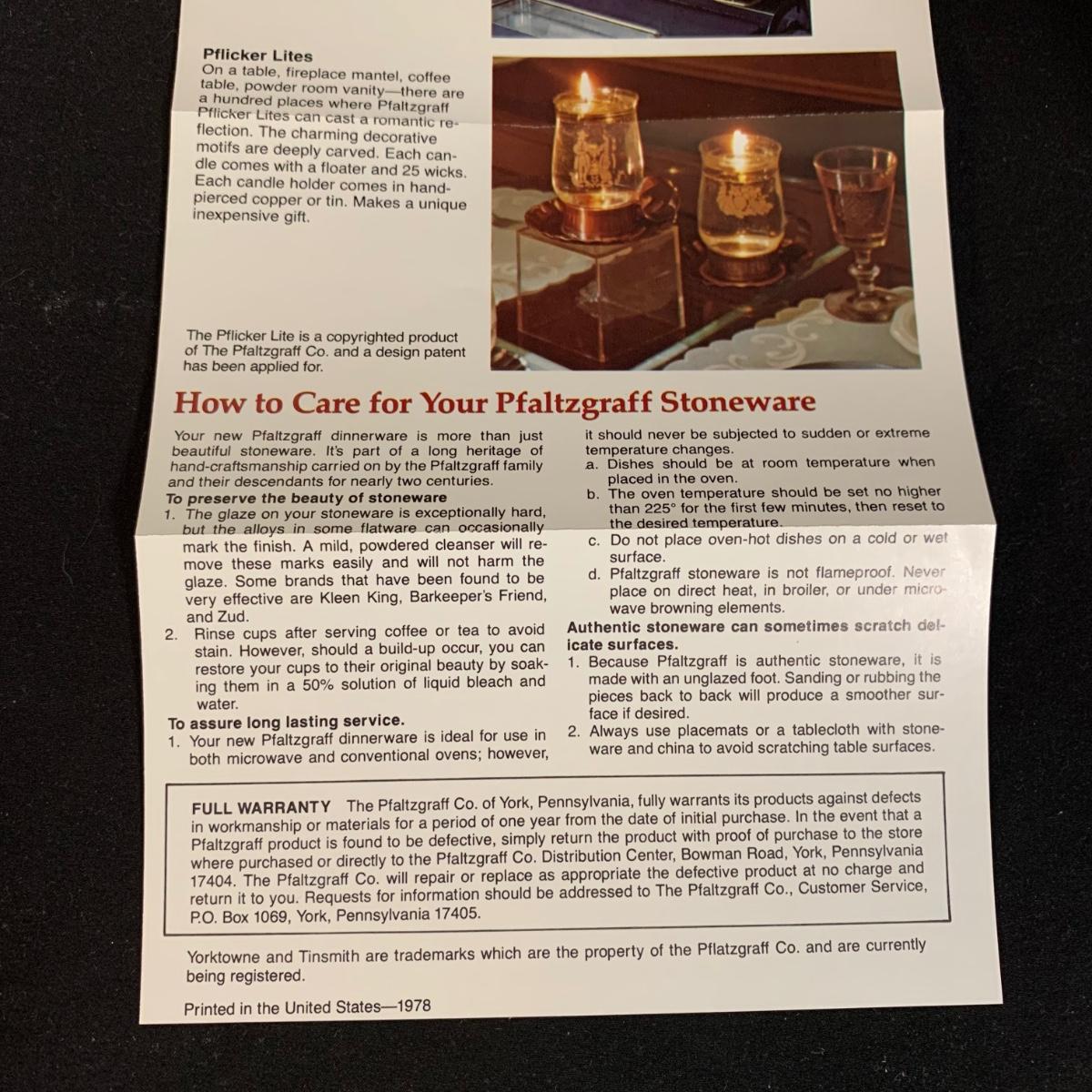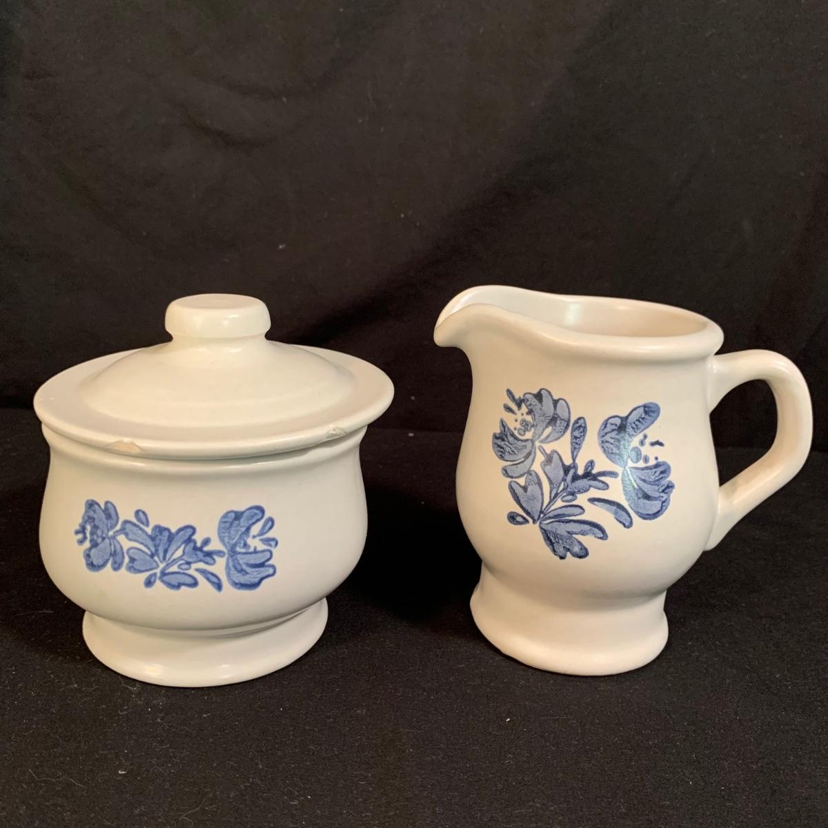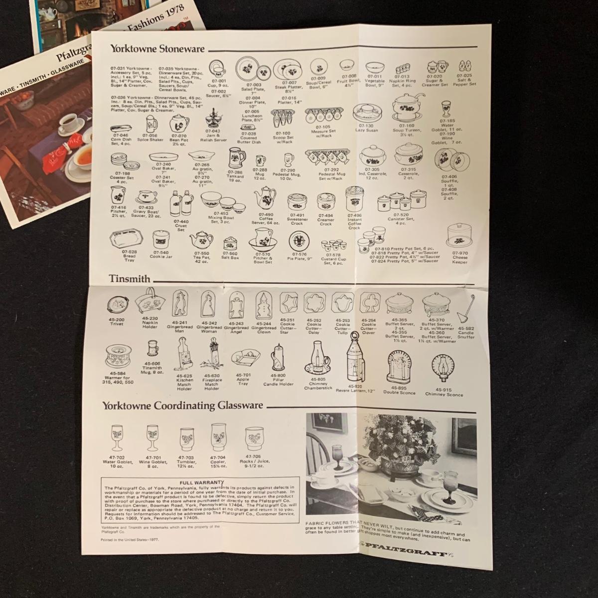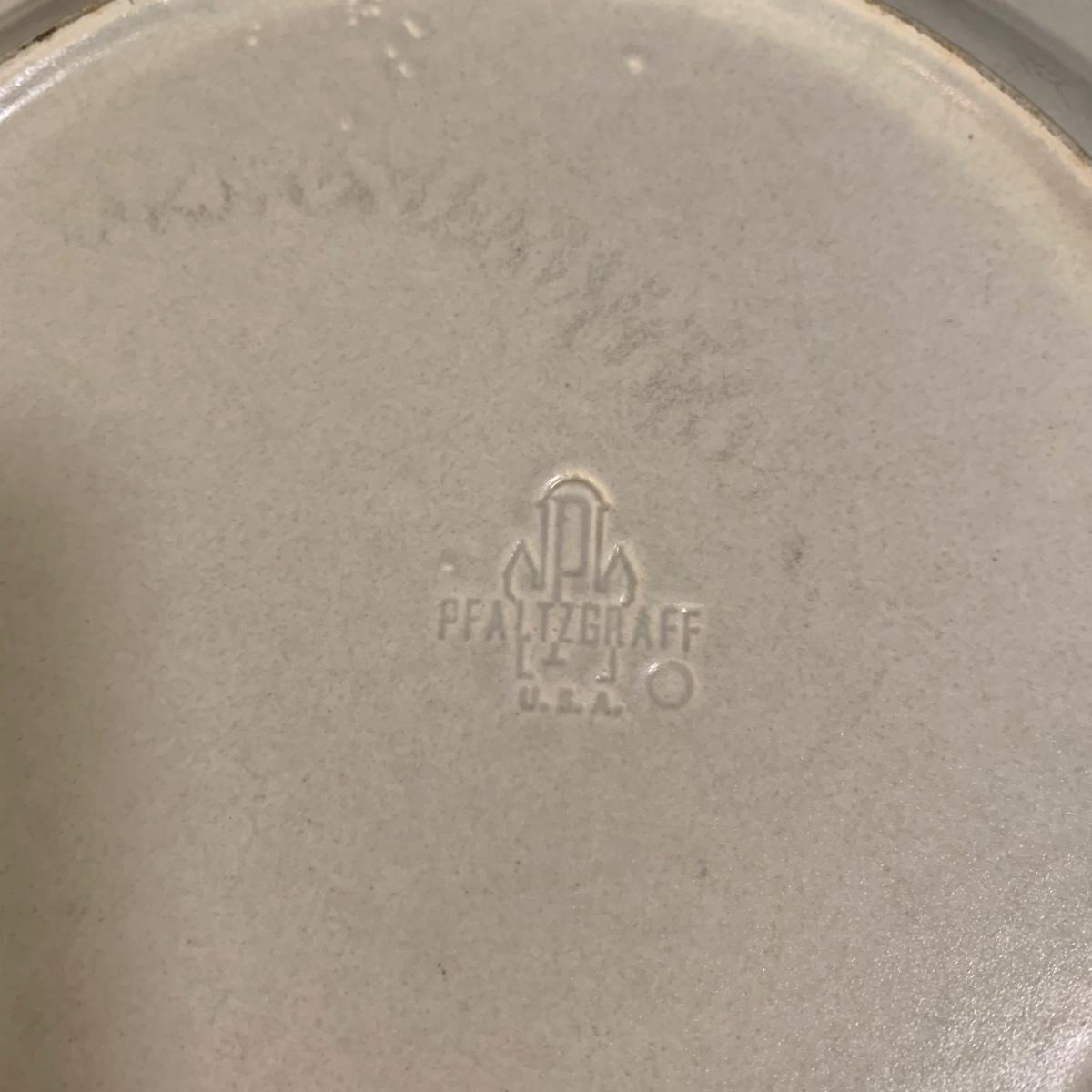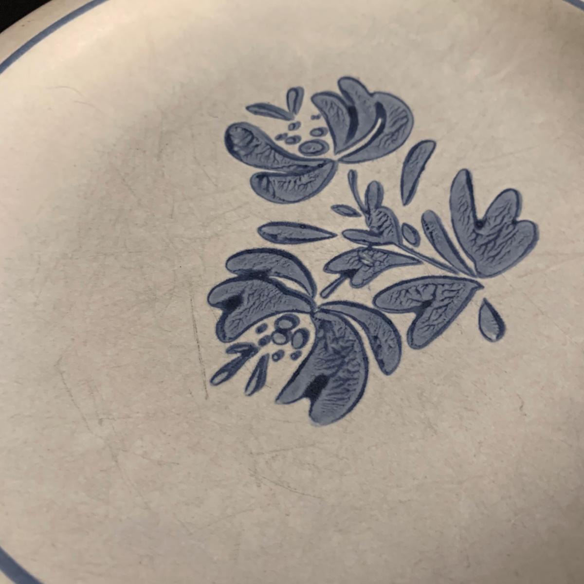 Yorktowne collection by Pfaltzgraff, stoneware dinnerware set. This large set includes: six 10.5” dinner plates, five 7” salad plates, six 6” soup/cereal bowls, four 12 oz. onion soup bowls, 9 saucers, 6 teacups, 3 oval serving dishes, one round baking dish, a pitcher and bowl set, a sugar crock and milk pitcher, a small round gravy boat, a salt and pepper set, and 8 napkin rings. There are also some printouts that list the different Yorktowne stoneware pieces as well as care instructions. The set is in very good condition structurally, with the exception of some chips on the sugar crock lid and two teacups with small chips. There are some scratches seen on some of the plate surfaces, likely from knives, as well as some crazing and blemishes on the salt and pepper shakers. Local pickup only.