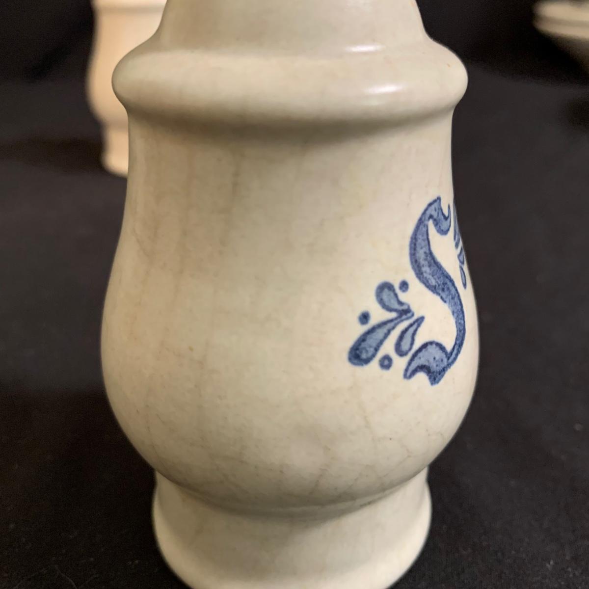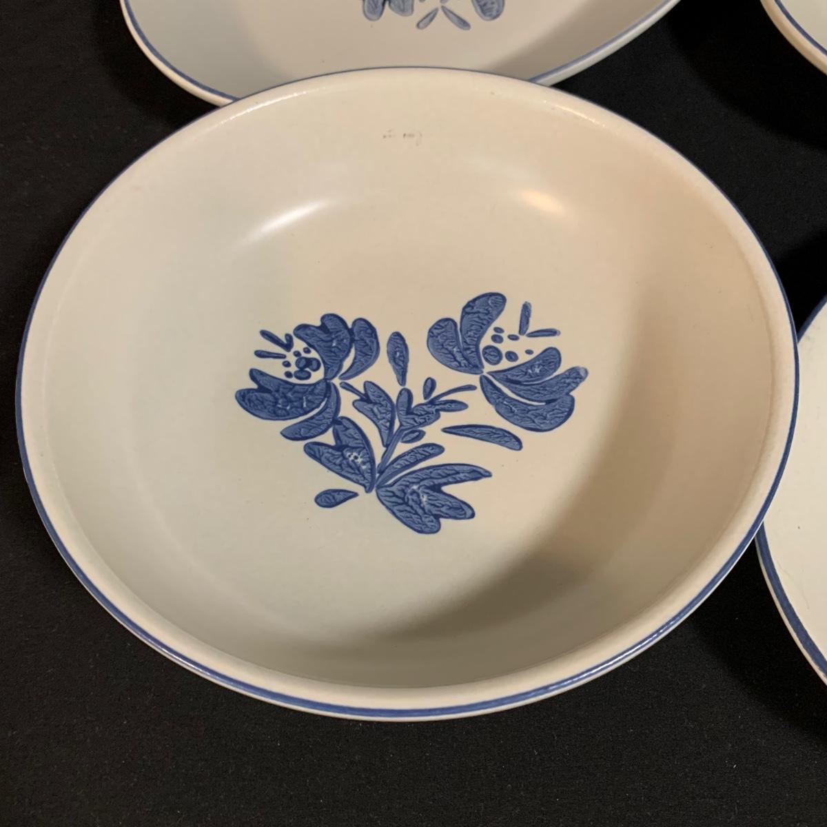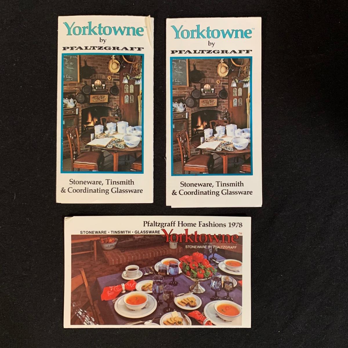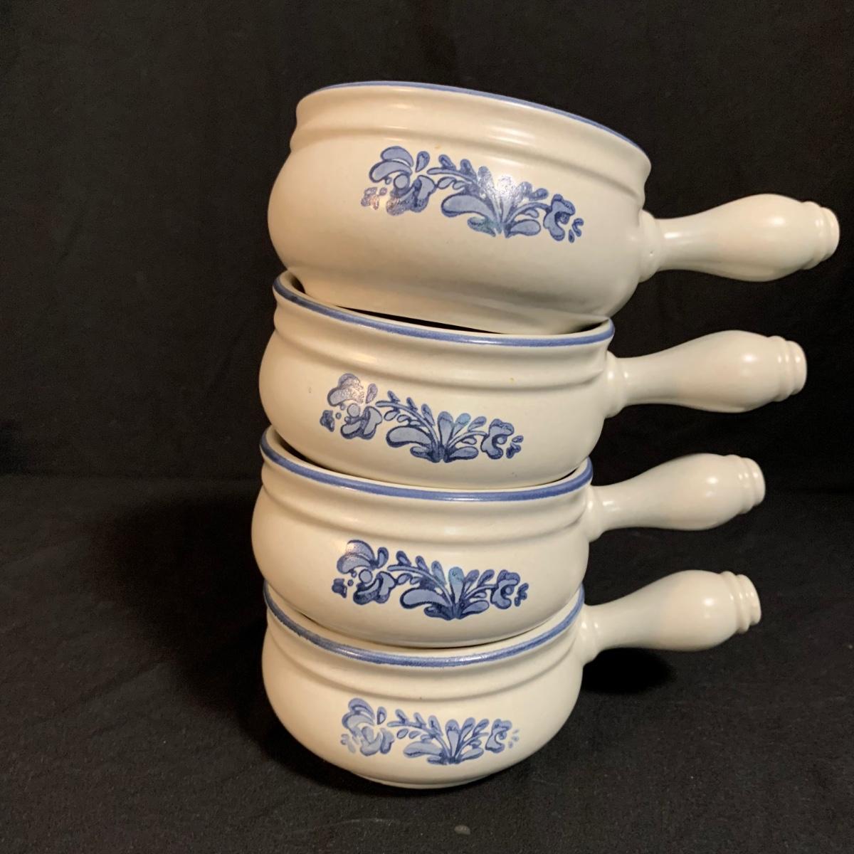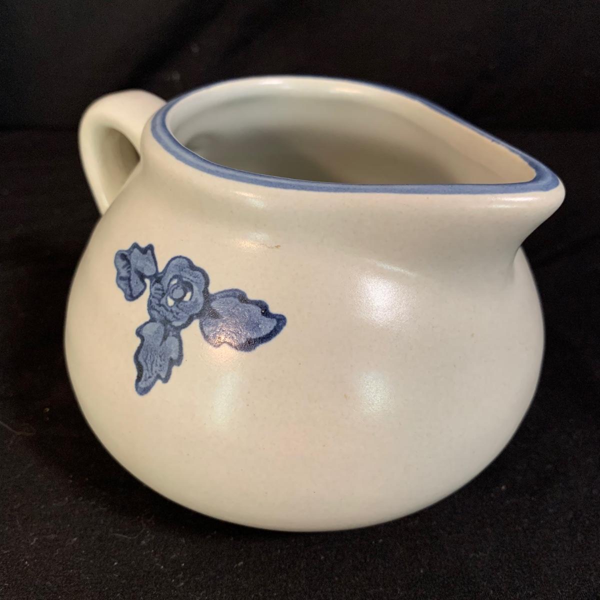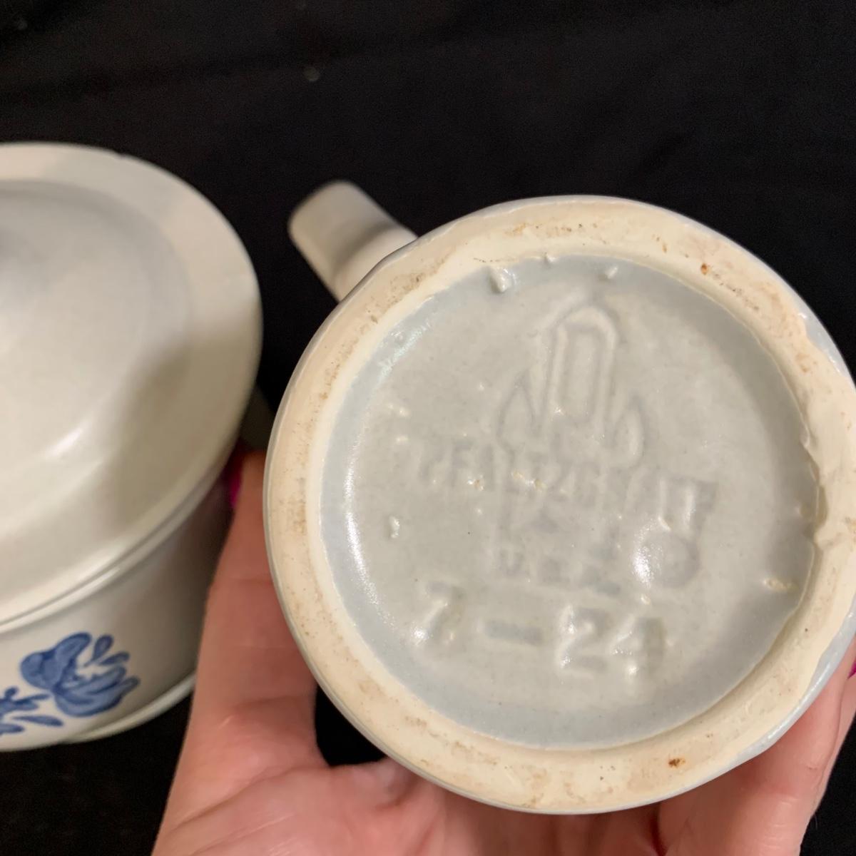 Yorktowne collection by Pfaltzgraff, stoneware dinnerware set. This large set includes: six 10.5” dinner plates, five 7” salad plates, six 6” soup/cereal bowls, four 12 oz. onion soup bowls, 9 saucers, 6 teacups, 3 oval serving dishes, one round baking dish, a pitcher and bowl set, a sugar crock and milk pitcher, a small round gravy boat, a salt and pepper set, and 8 napkin rings. There are also some printouts that list the different Yorktowne stoneware pieces as well as care instructions. The set is in very good condition structurally, with the exception of some chips on the sugar crock lid and two teacups with small chips. There are some scratches seen on some of the plate surfaces, likely from knives, as well as some crazing and blemishes on the salt and pepper shakers. Local pickup only.