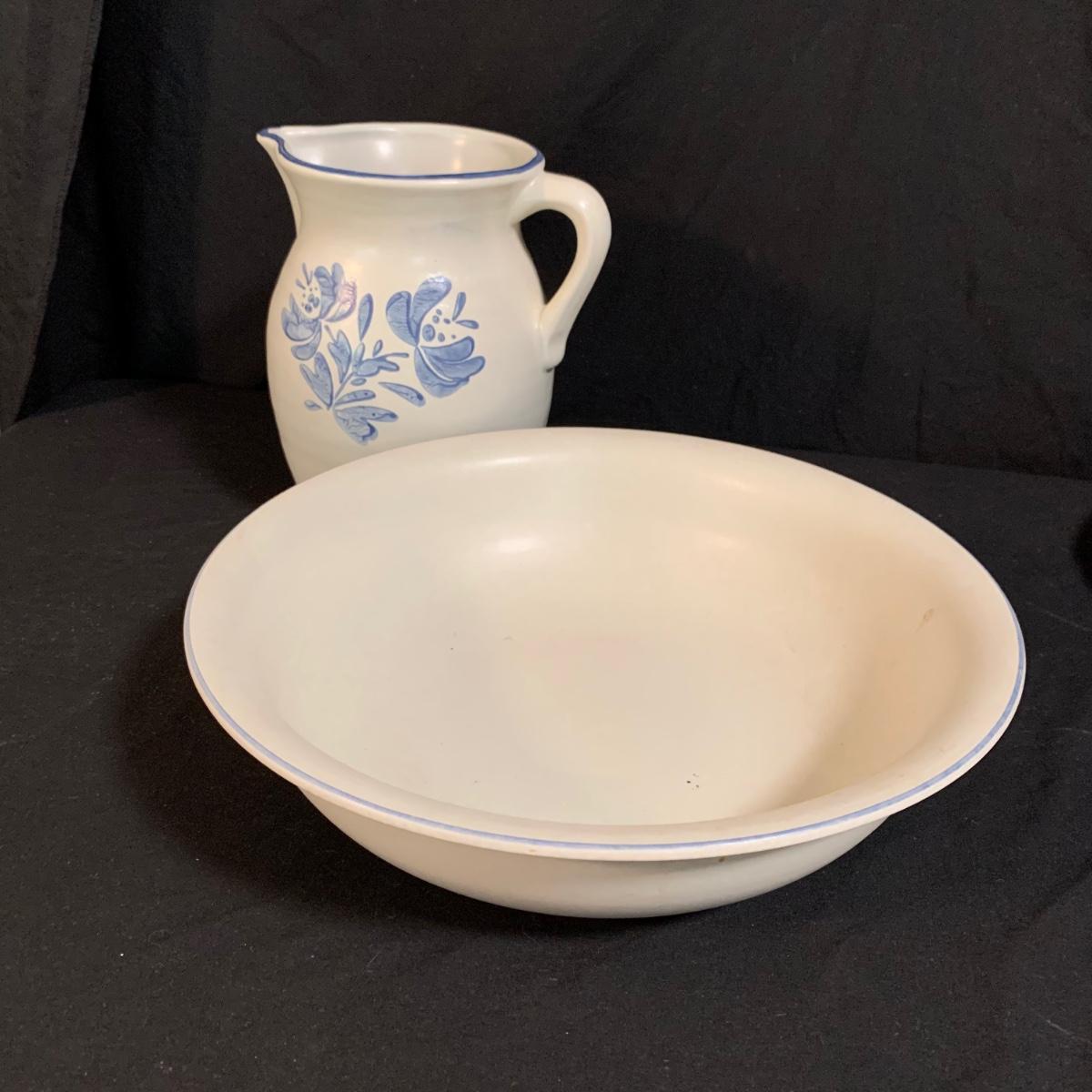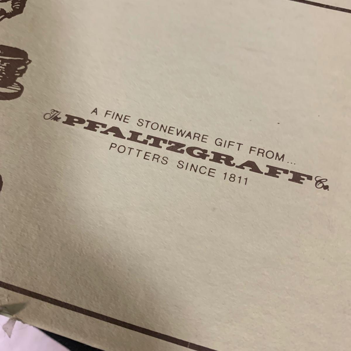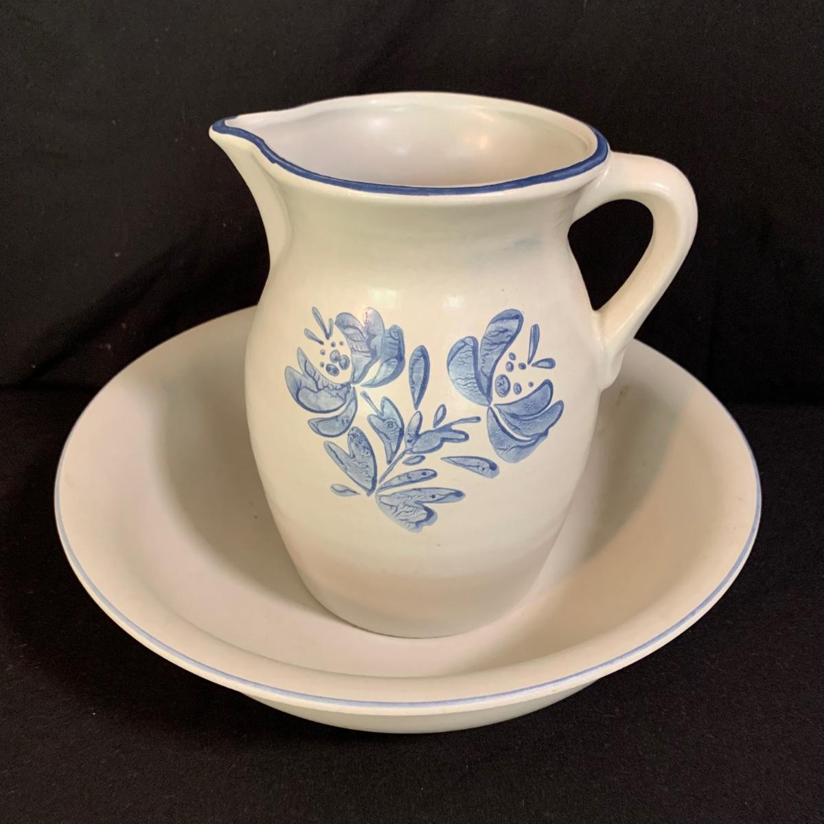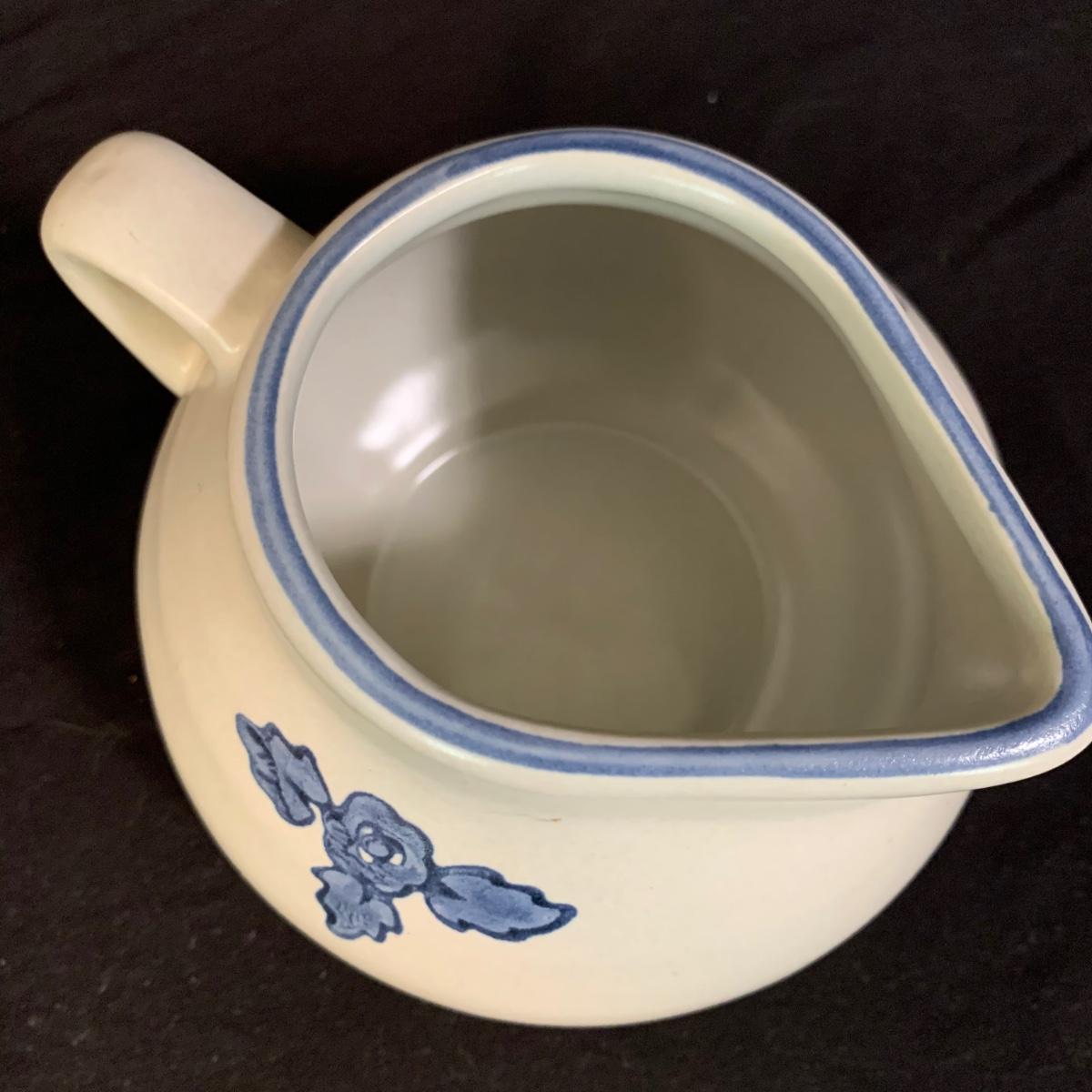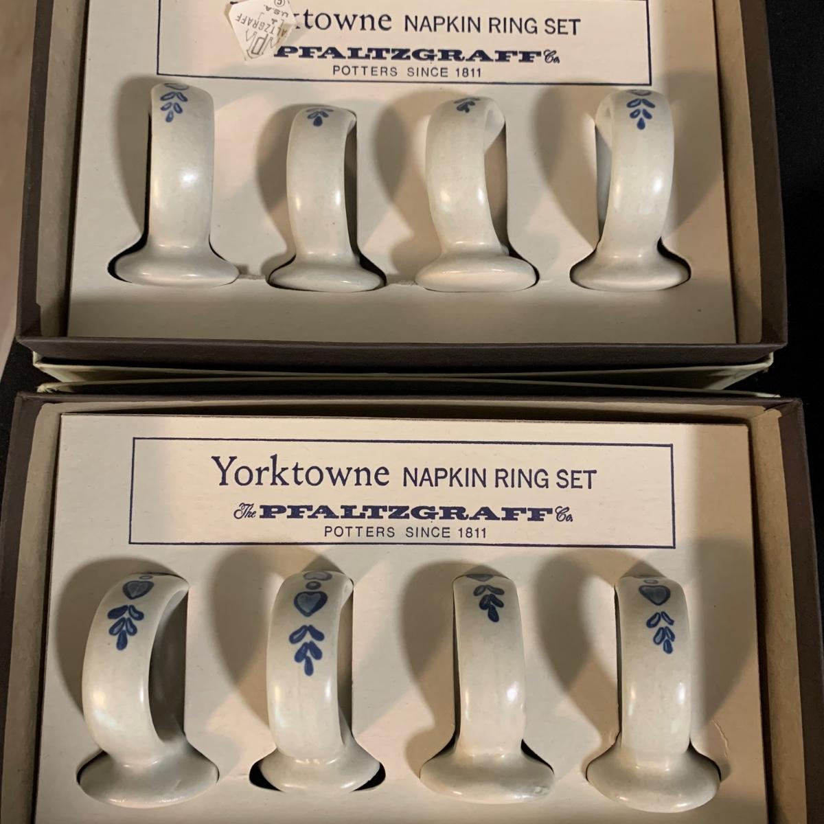 Yorktowne collection by Pfaltzgraff, stoneware dinnerware set. This large set includes: six 10.5” dinner plates, five 7” salad plates, six 6” soup/cereal bowls, four 12 oz. onion soup bowls, 9 saucers, 6 teacups, 3 oval serving dishes, one round baking dish, a pitcher and bowl set, a sugar crock and milk pitcher, a small round gravy boat, a salt and pepper set, and 8 napkin rings. There are also some printouts that list the different Yorktowne stoneware pieces as well as care instructions. The set is in very good condition structurally, with the exception of some chips on the sugar crock lid and two teacups with small chips. There are some scratches seen on some of the plate surfaces, likely from knives, as well as some crazing and blemishes on the salt and pepper shakers. Local pickup only.