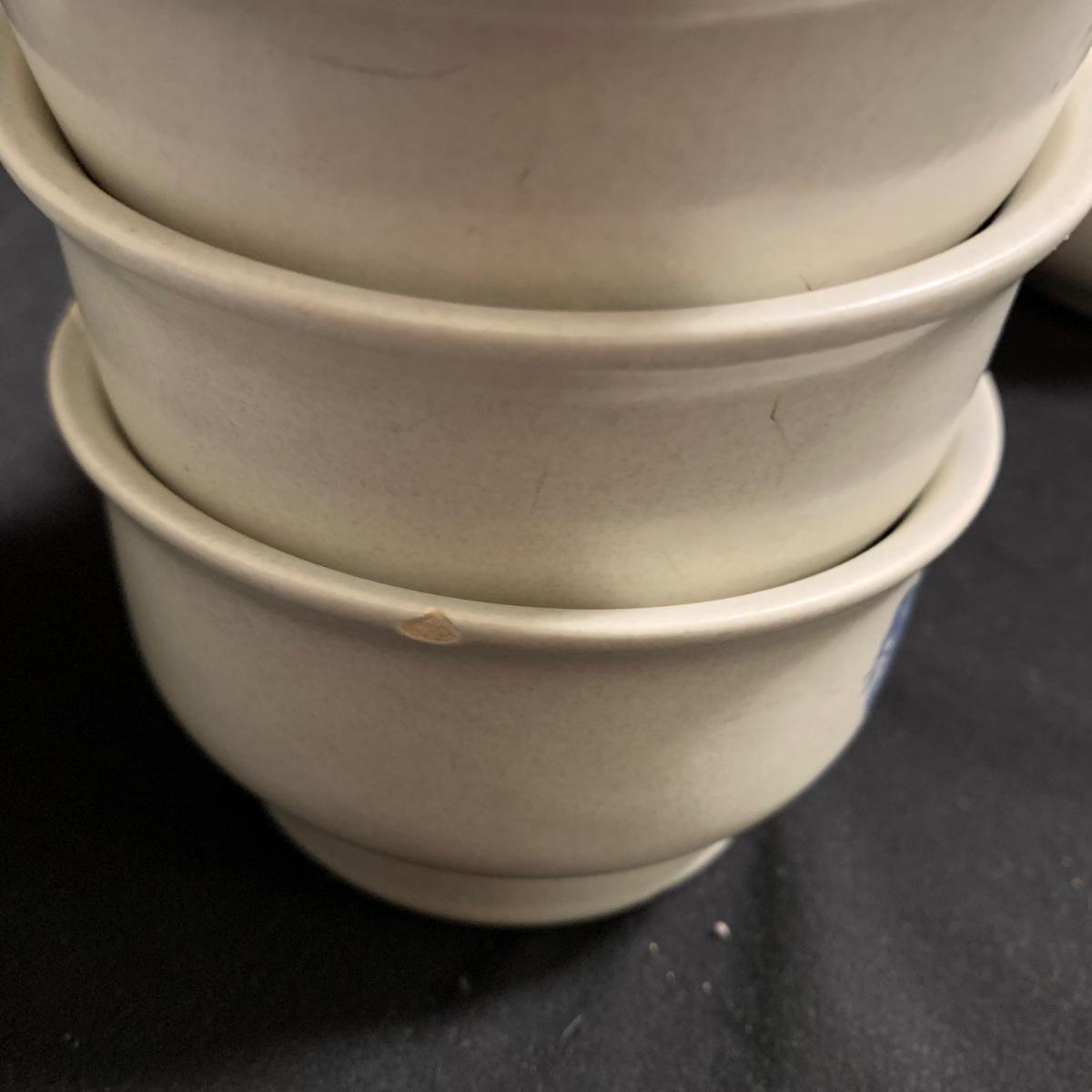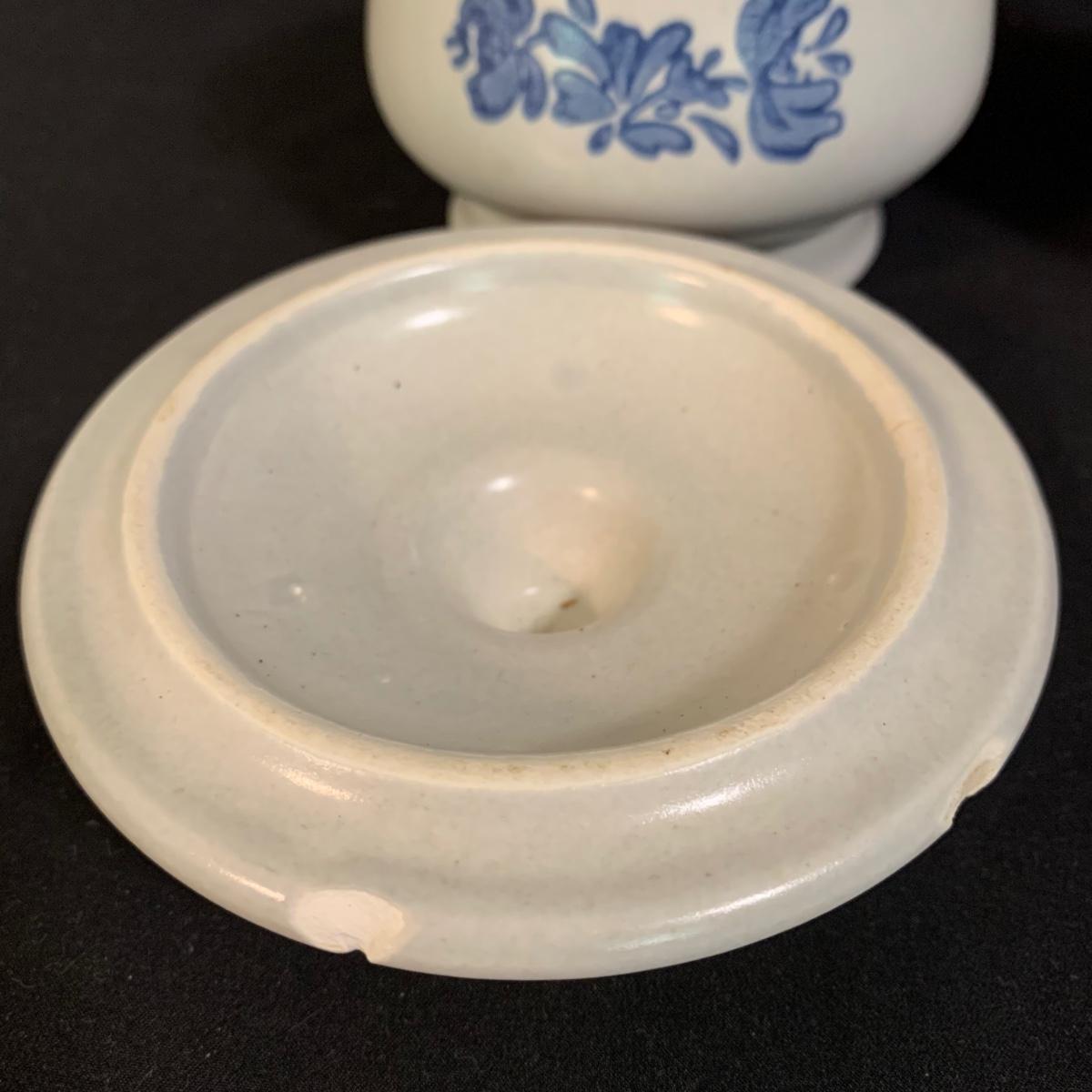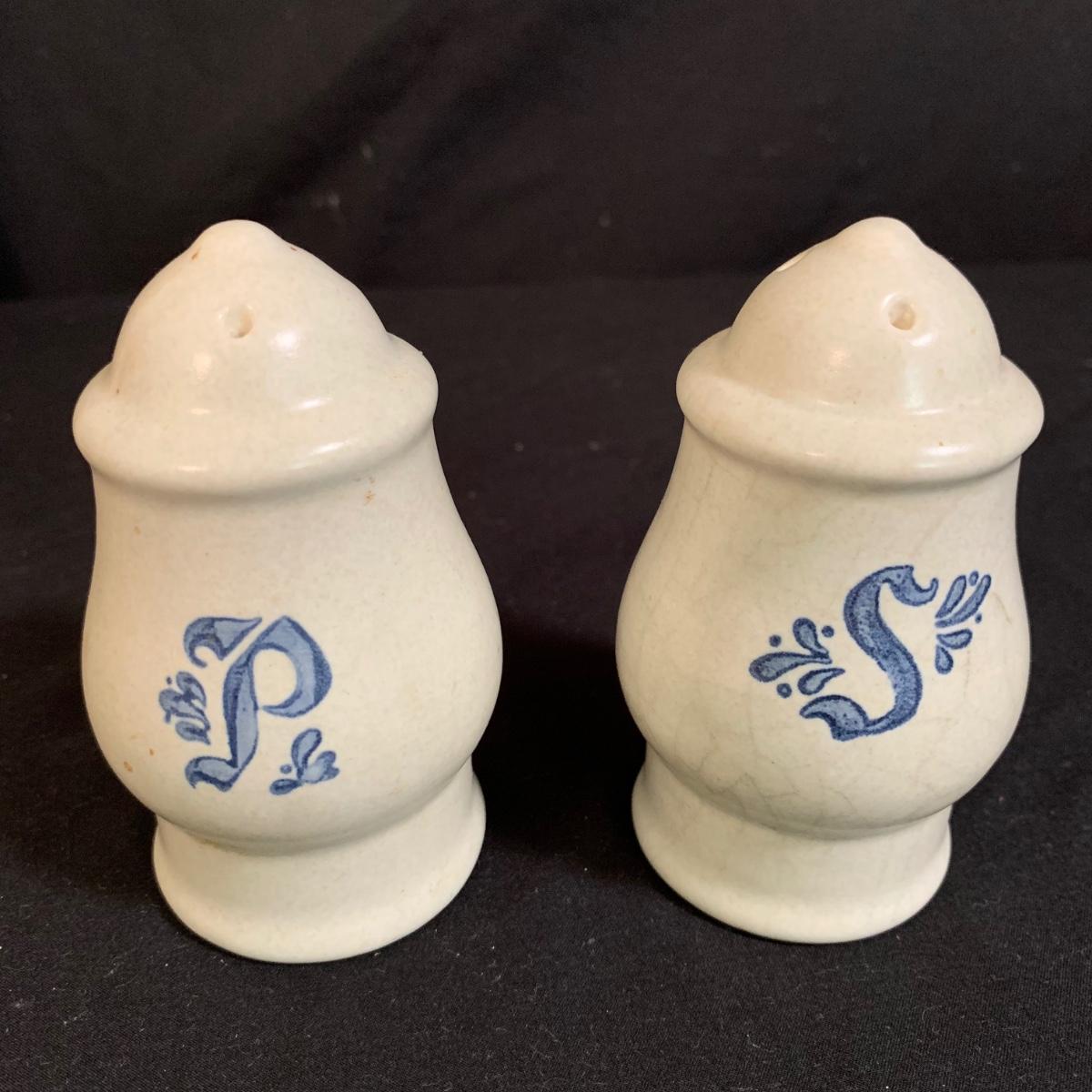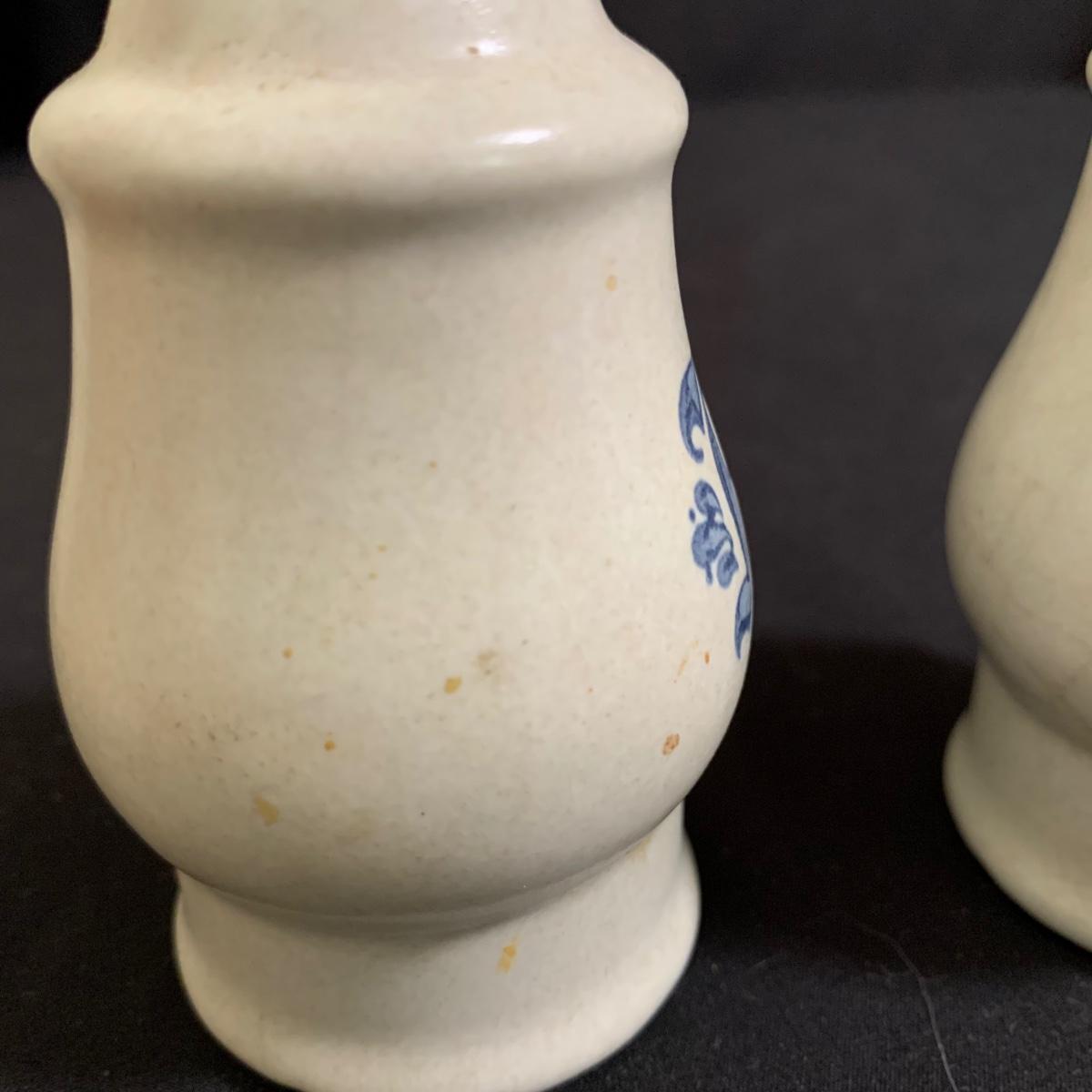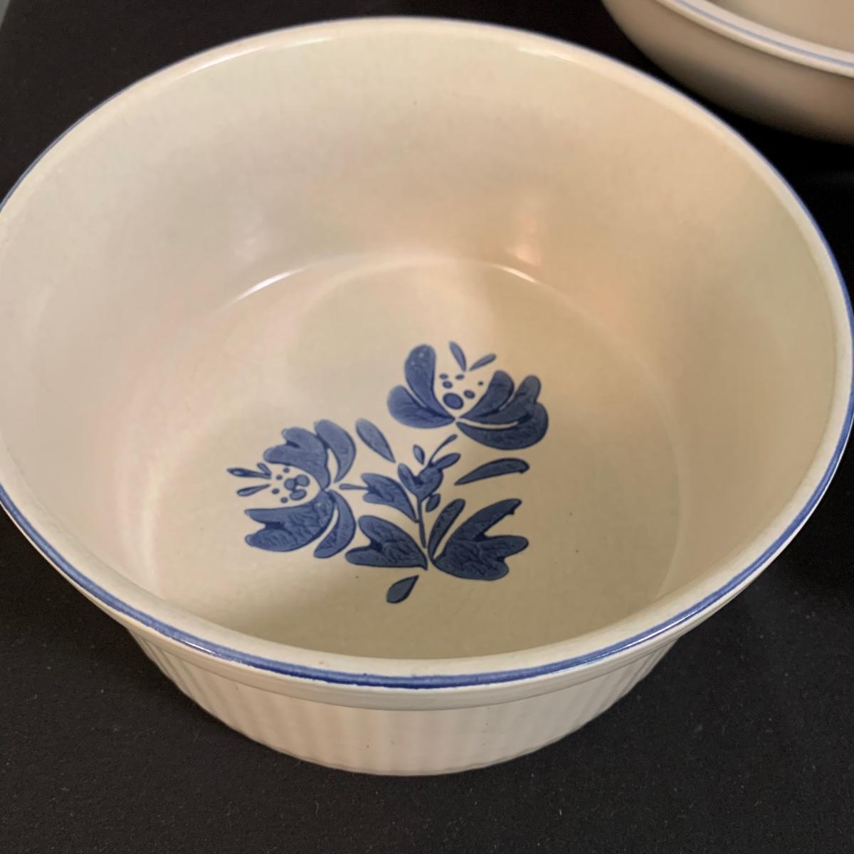 Yorktowne collection by Pfaltzgraff, stoneware dinnerware set. This large set includes: six 10.5” dinner plates, five 7” salad plates, six 6” soup/cereal bowls, four 12 oz. onion soup bowls, 9 saucers, 6 teacups, 3 oval serving dishes, one round baking dish, a pitcher and bowl set, a sugar crock and milk pitcher, a small round gravy boat, a salt and pepper set, and 8 napkin rings. There are also some printouts that list the different Yorktowne stoneware pieces as well as care instructions. The set is in very good condition structurally, with the exception of some chips on the sugar crock lid and two teacups with small chips. There are some scratches seen on some of the plate surfaces, likely from knives, as well as some crazing and blemishes on the salt and pepper shakers. Local pickup only.