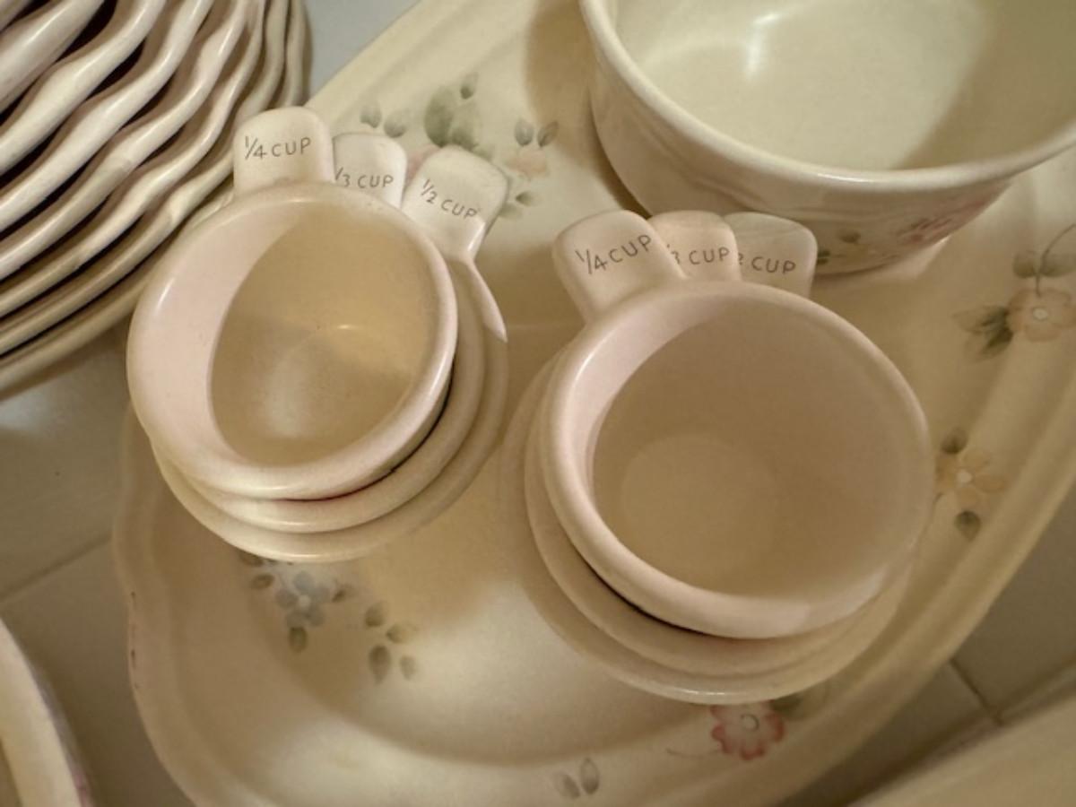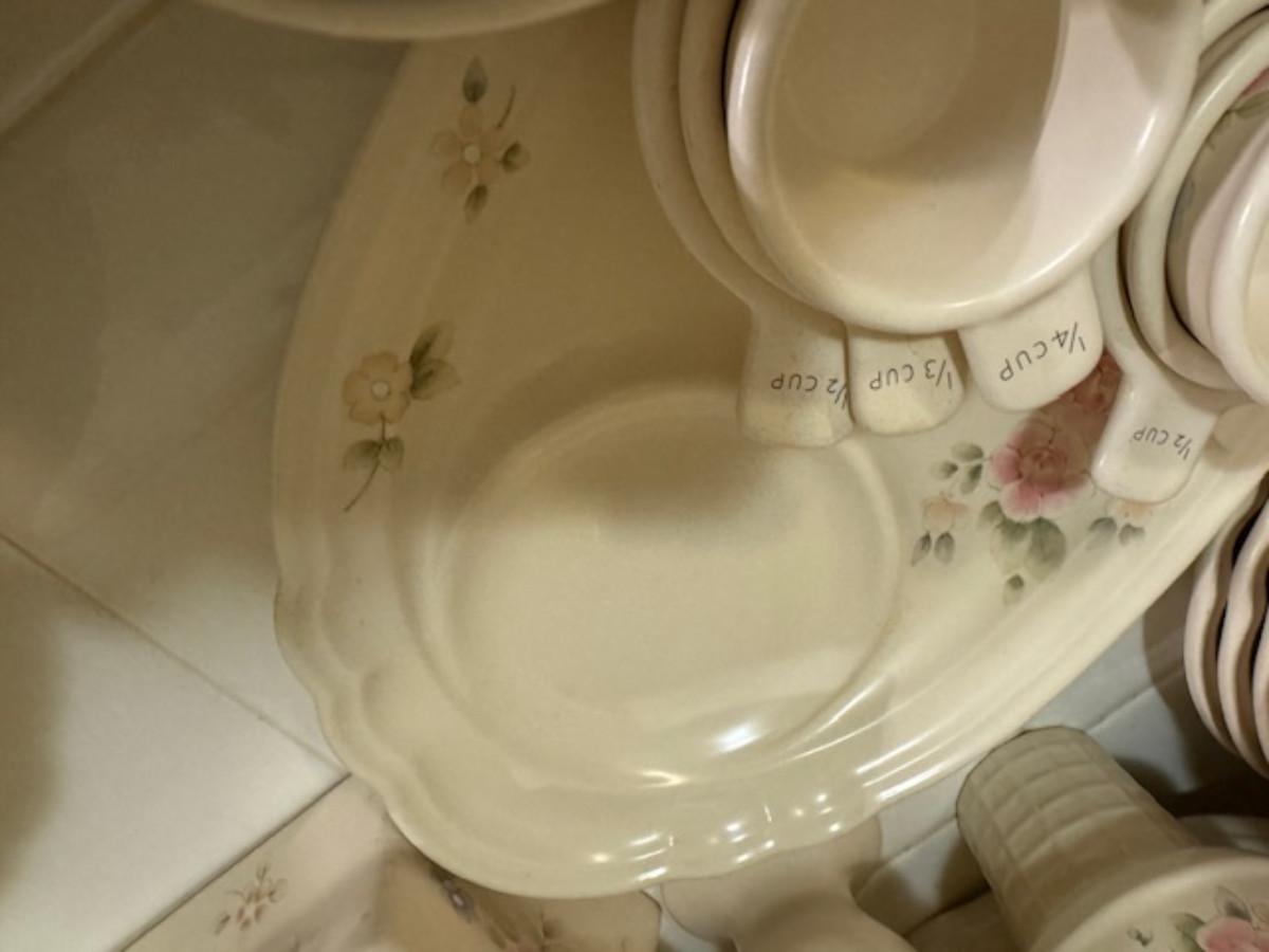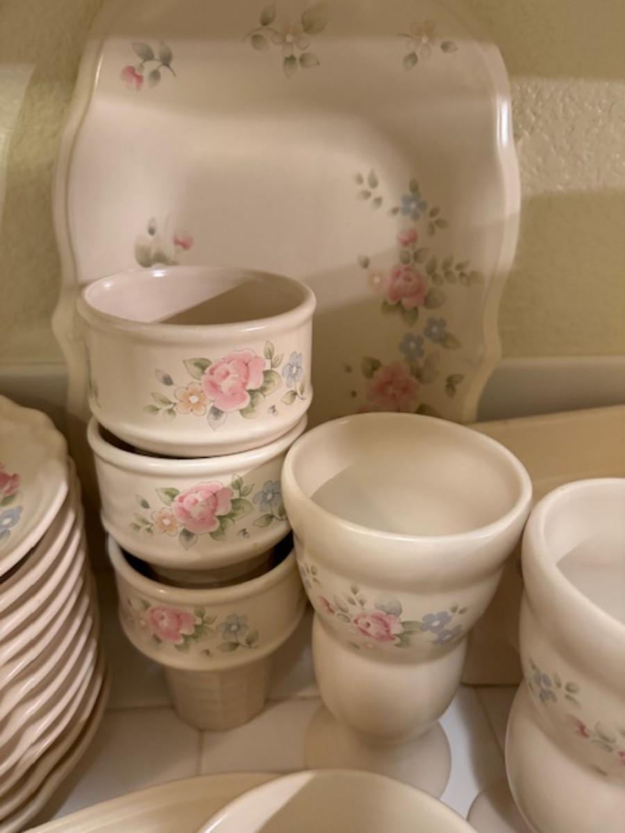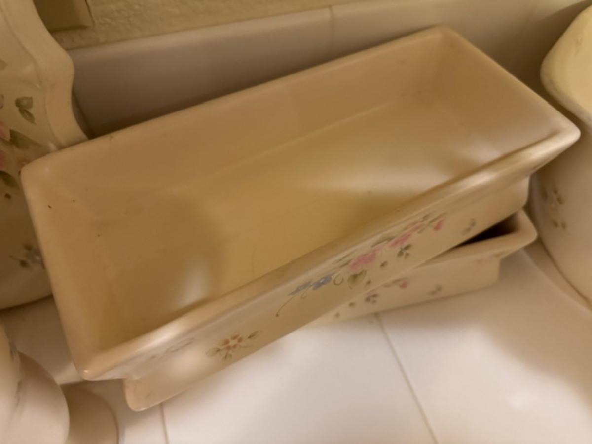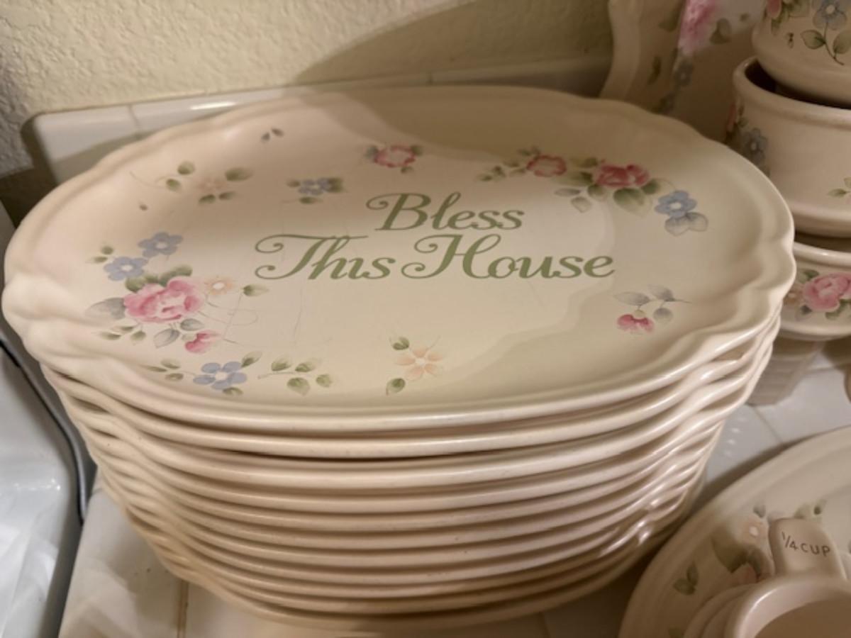 11 platters - "Bless this house", loaf pan, 3 heart dishes, 3 x ice cream cone glasses, 2 x sunday cups, 1 large platter, 2 condiment looking trays, 1 large mixing bowl, 1 luncheon plate with soup cup, 2 measuring cups: 1/4 cup, 1/3 cup, 1/2 cup, rectangle and square casserole, 6 ruffled edge bowls, 2 other sized ruffled edge bowls, 1 caraff and cup, 1 divided oval serving dish, 1 not divided serving dish, 2 large round serving bowls, 2 serving spoons, 50 pcs total