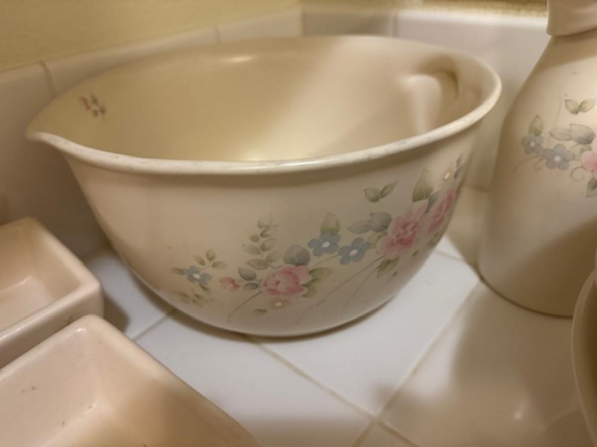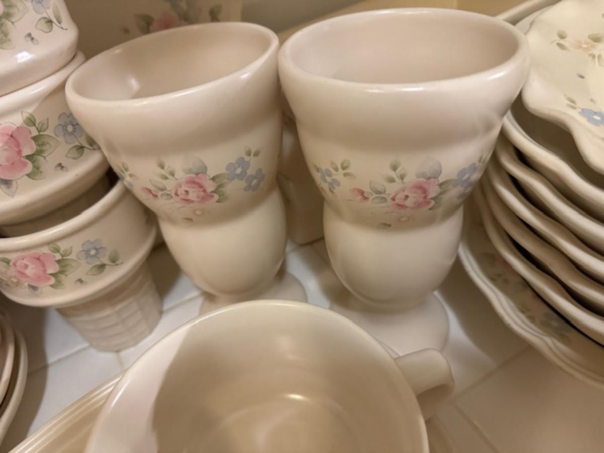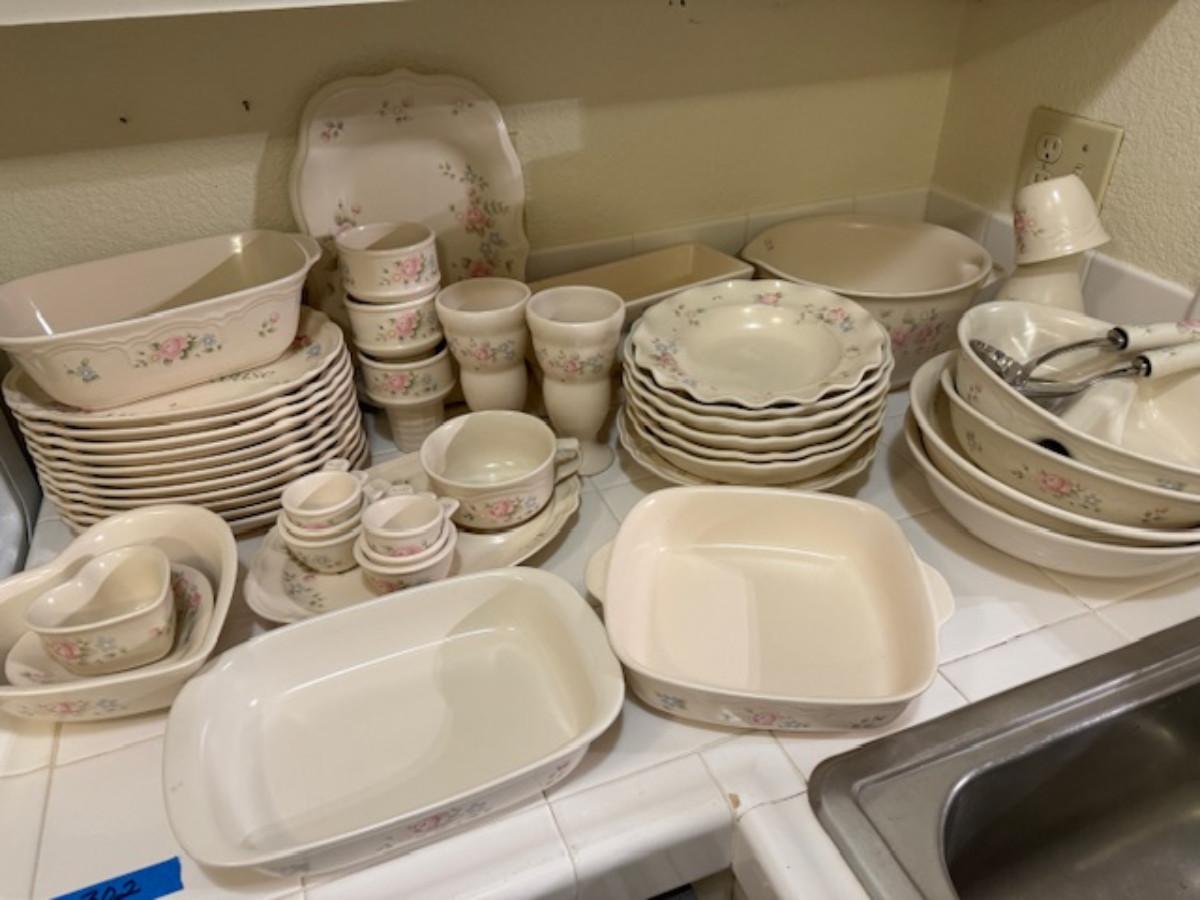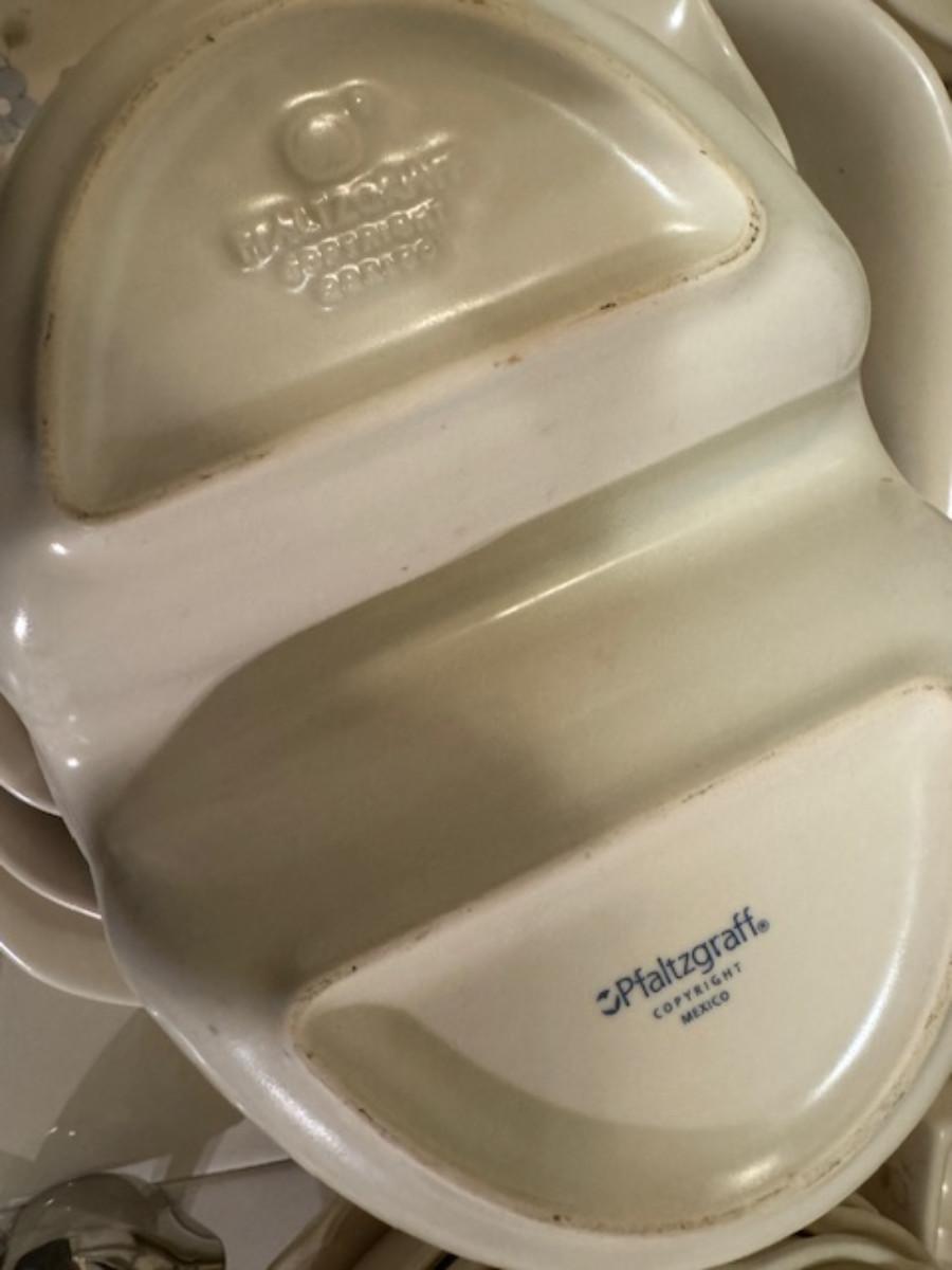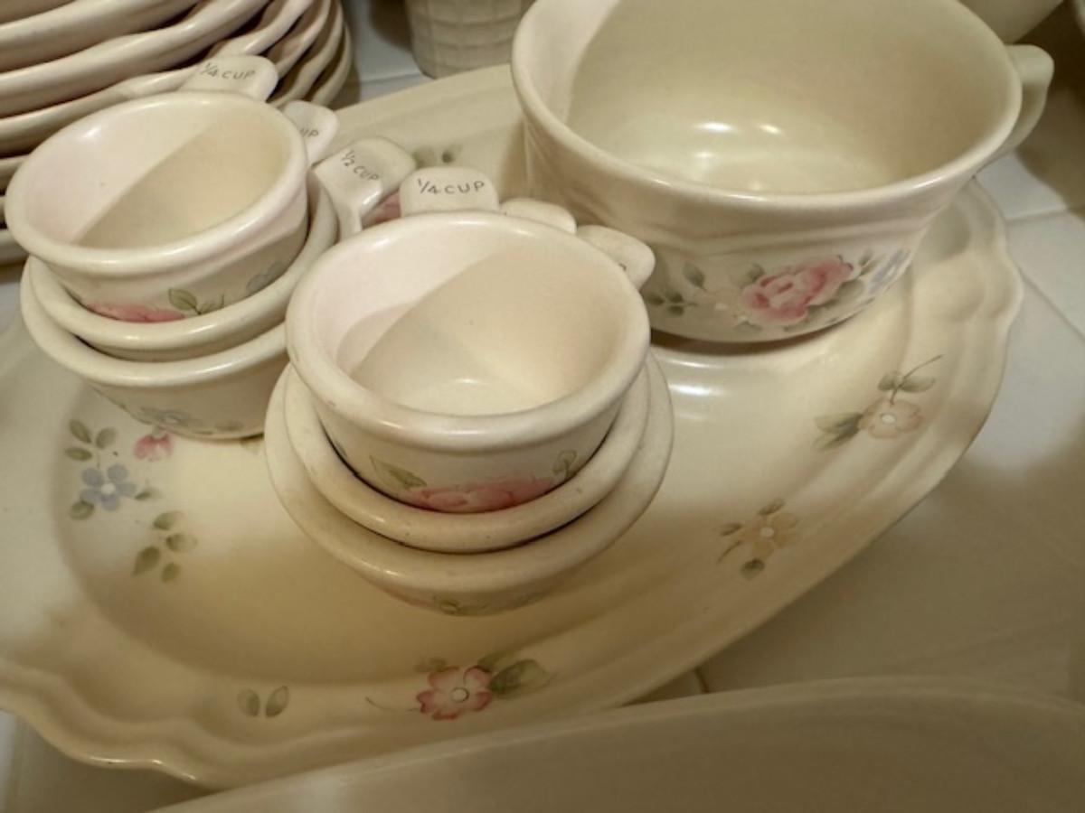 11 platters - "Bless this house", loaf pan, 3 heart dishes, 3 x ice cream cone glasses, 2 x sunday cups, 1 large platter, 2 condiment looking trays, 1 large mixing bowl, 1 luncheon plate with soup cup, 2 measuring cups: 1/4 cup, 1/3 cup, 1/2 cup, rectangle and square casserole, 6 ruffled edge bowls, 2 other sized ruffled edge bowls, 1 caraff and cup, 1 divided oval serving dish, 1 not divided serving dish, 2 large round serving bowls, 2 serving spoons, 50 pcs total