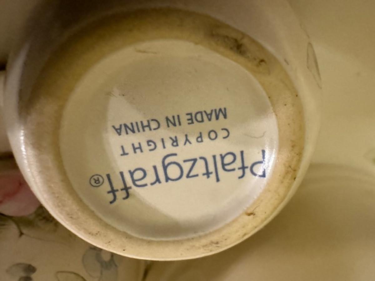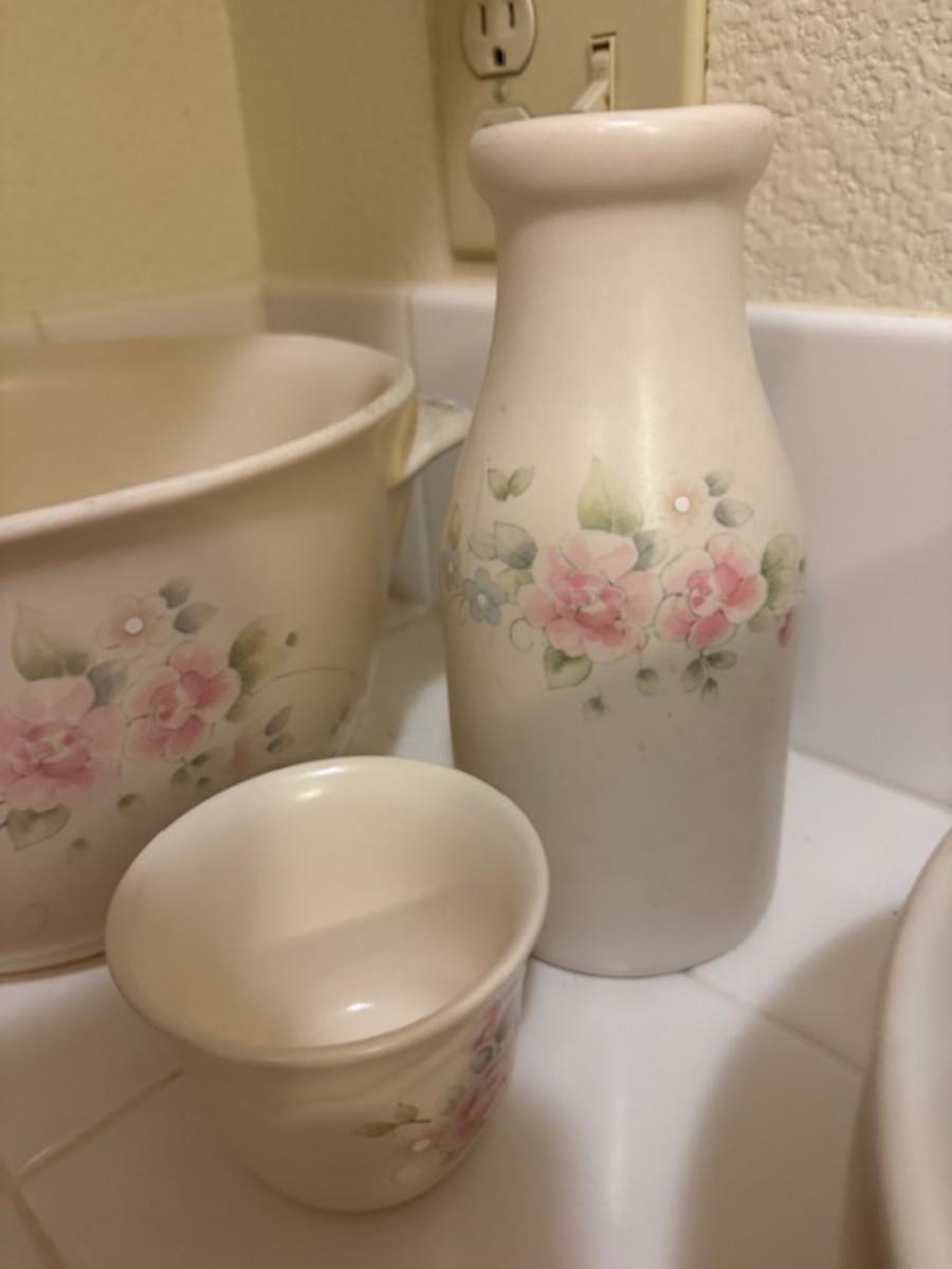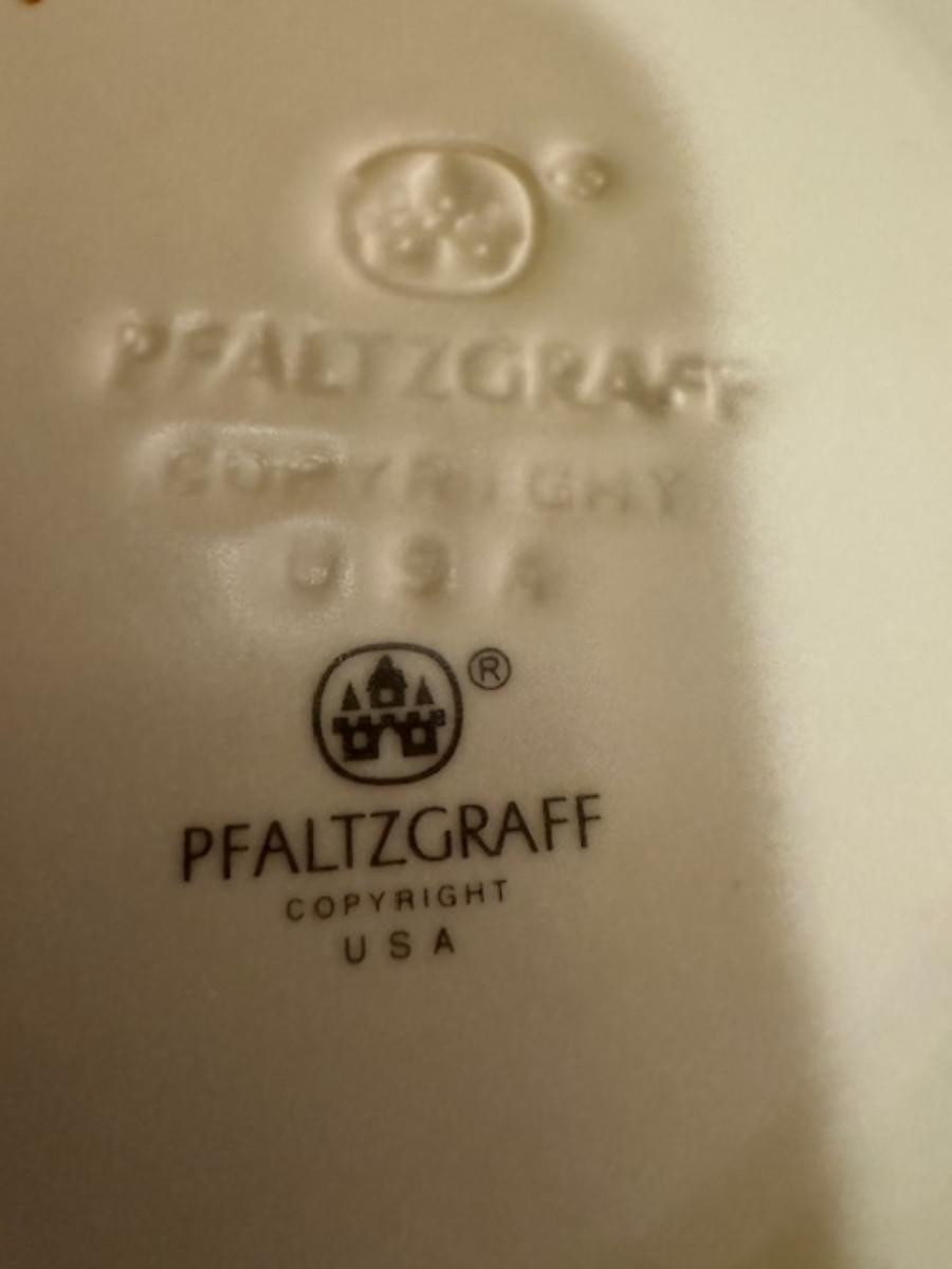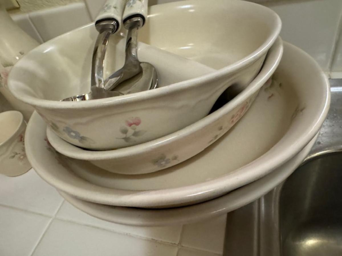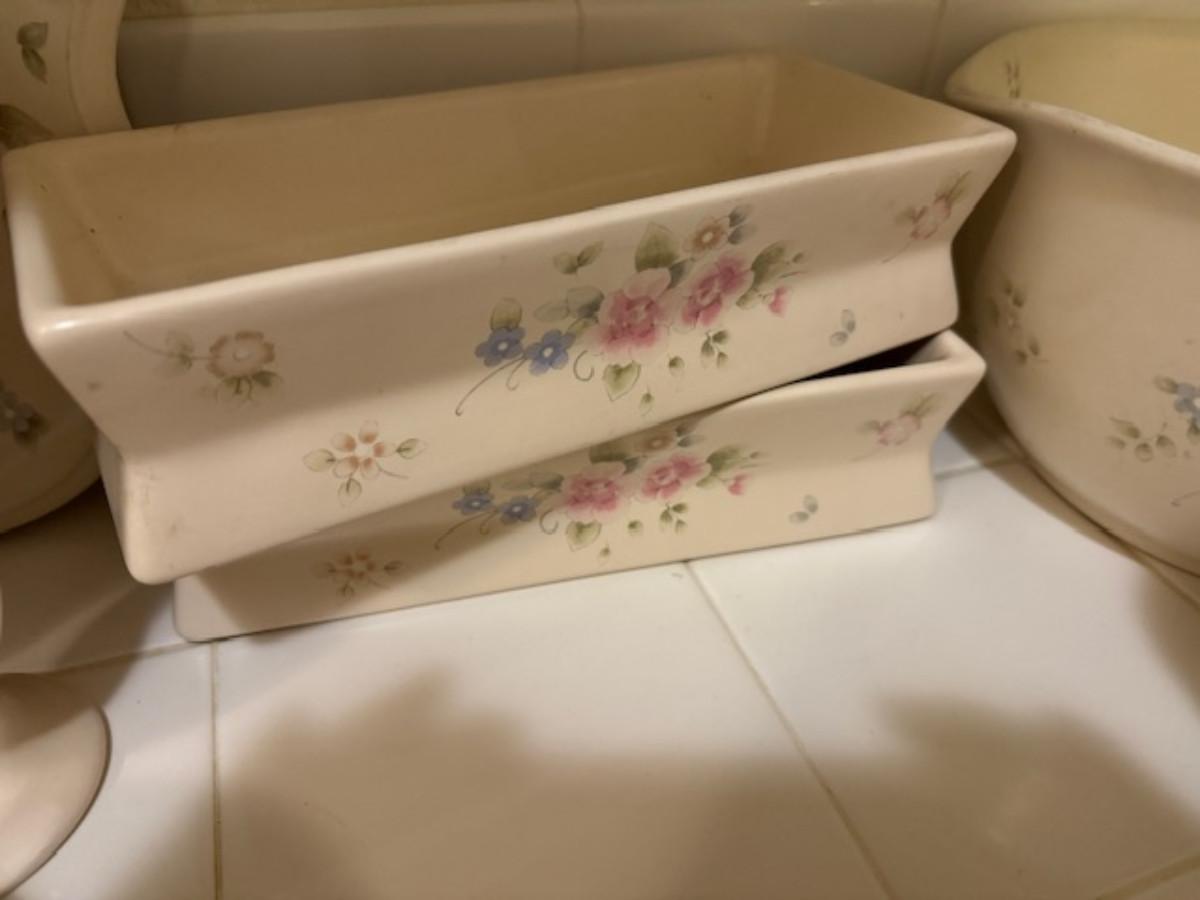 11 platters - "Bless this house", loaf pan, 3 heart dishes, 3 x ice cream cone glasses, 2 x sunday cups, 1 large platter, 2 condiment looking trays, 1 large mixing bowl, 1 luncheon plate with soup cup, 2 measuring cups: 1/4 cup, 1/3 cup, 1/2 cup, rectangle and square casserole, 6 ruffled edge bowls, 2 other sized ruffled edge bowls, 1 caraff and cup, 1 divided oval serving dish, 1 not divided serving dish, 2 large round serving bowls, 2 serving spoons, 50 pcs total