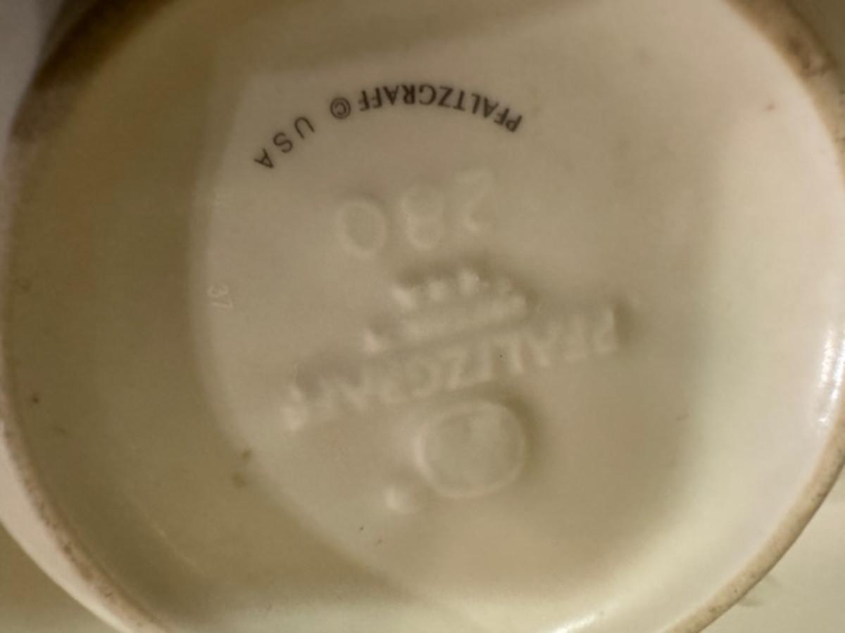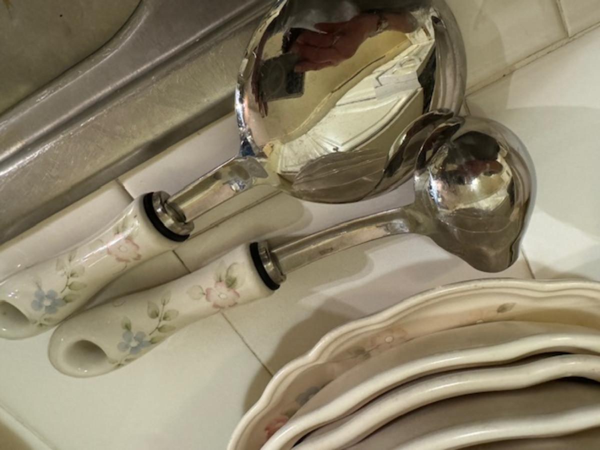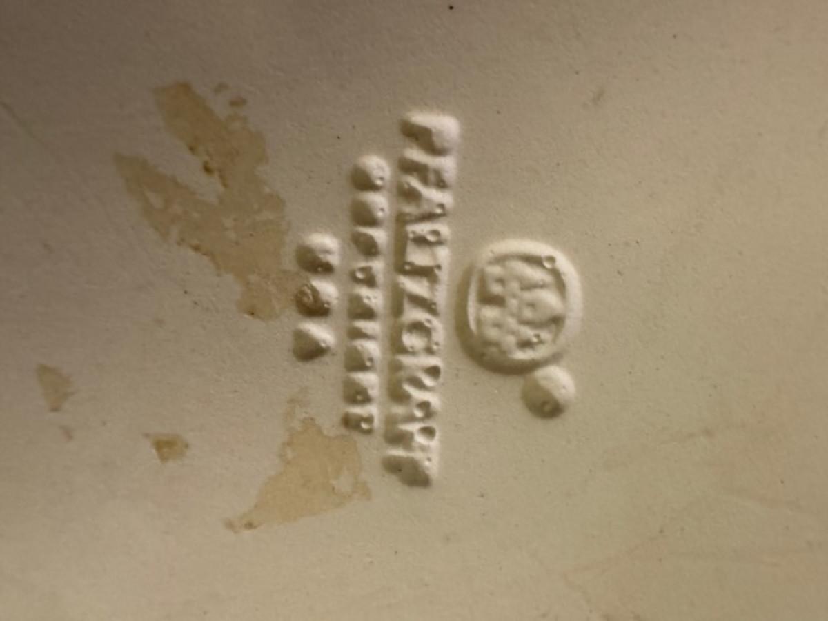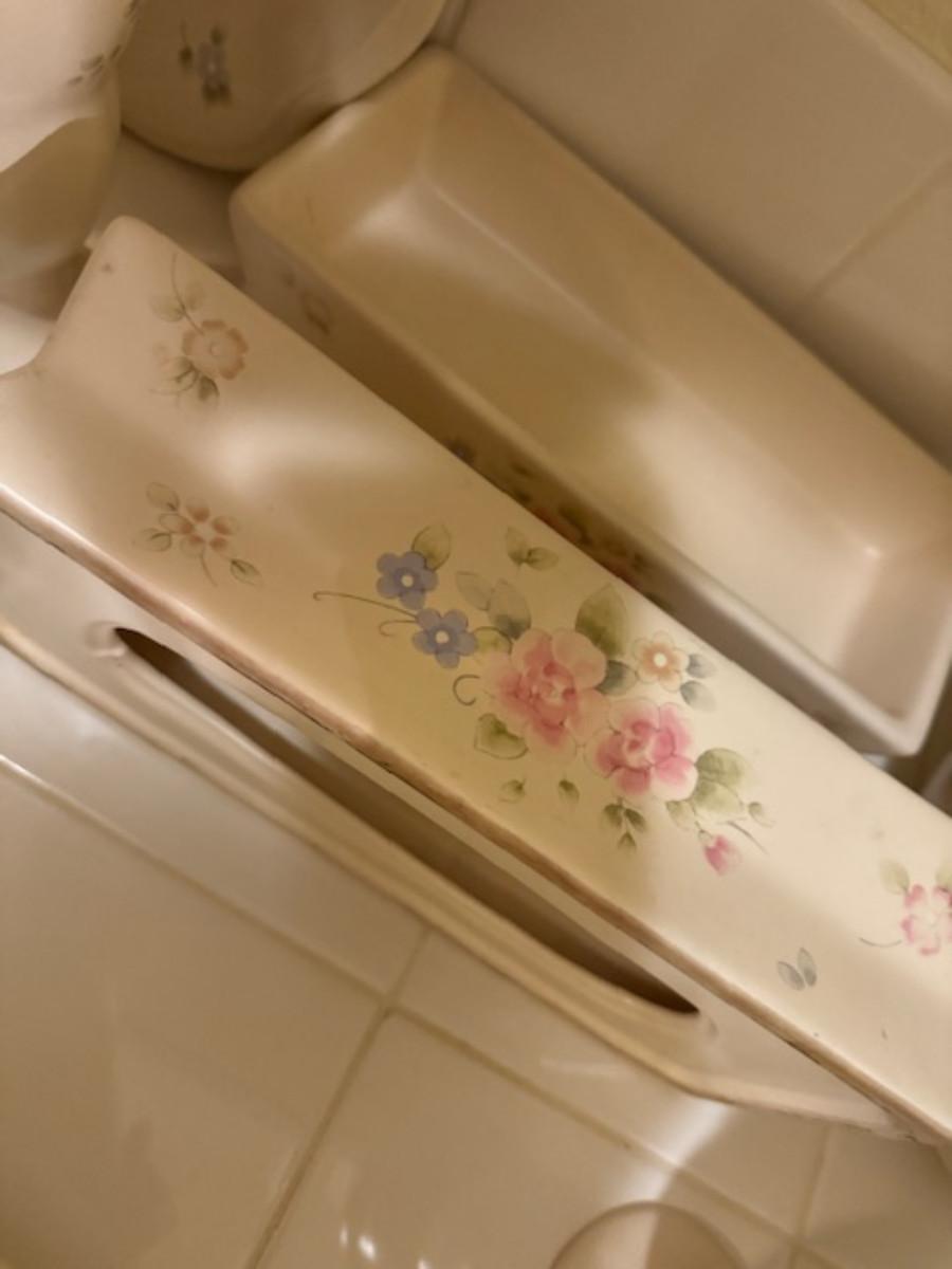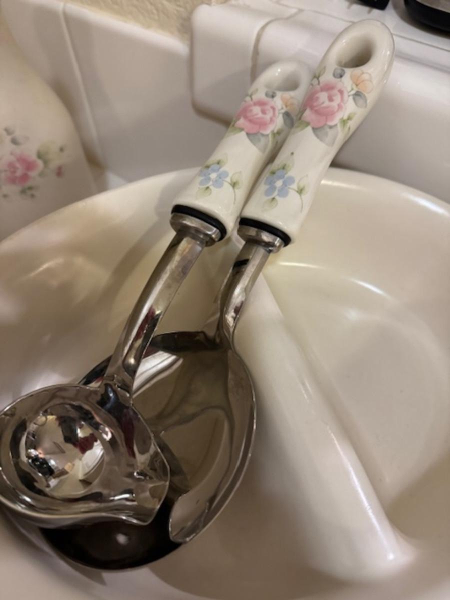 11 platters - "Bless this house", loaf pan, 3 heart dishes, 3 x ice cream cone glasses, 2 x sunday cups, 1 large platter, 2 condiment looking trays, 1 large mixing bowl, 1 luncheon plate with soup cup, 2 measuring cups: 1/4 cup, 1/3 cup, 1/2 cup, rectangle and square casserole, 6 ruffled edge bowls, 2 other sized ruffled edge bowls, 1 caraff and cup, 1 divided oval serving dish, 1 not divided serving dish, 2 large round serving bowls, 2 serving spoons, 50 pcs total