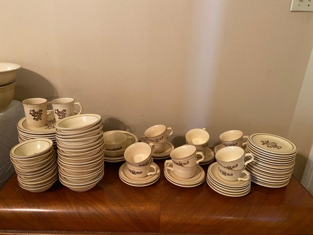 Pfalztgraff Lot #1: ten full place settings of dinnerware with several additional pieces. A few of the EXTRA pieces have chips. Everything pictured here. We have 3 other Pfaltzgraff lots listed