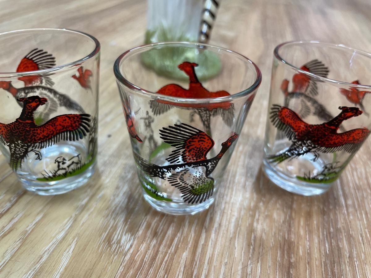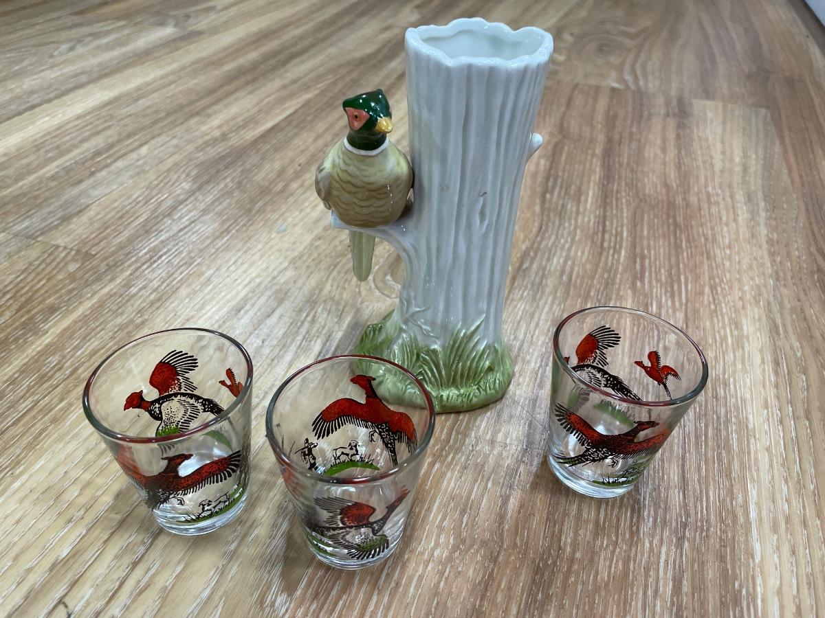 Pheasant vase and shot glasses