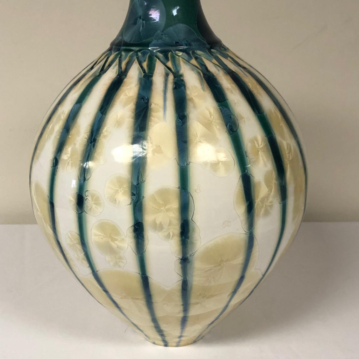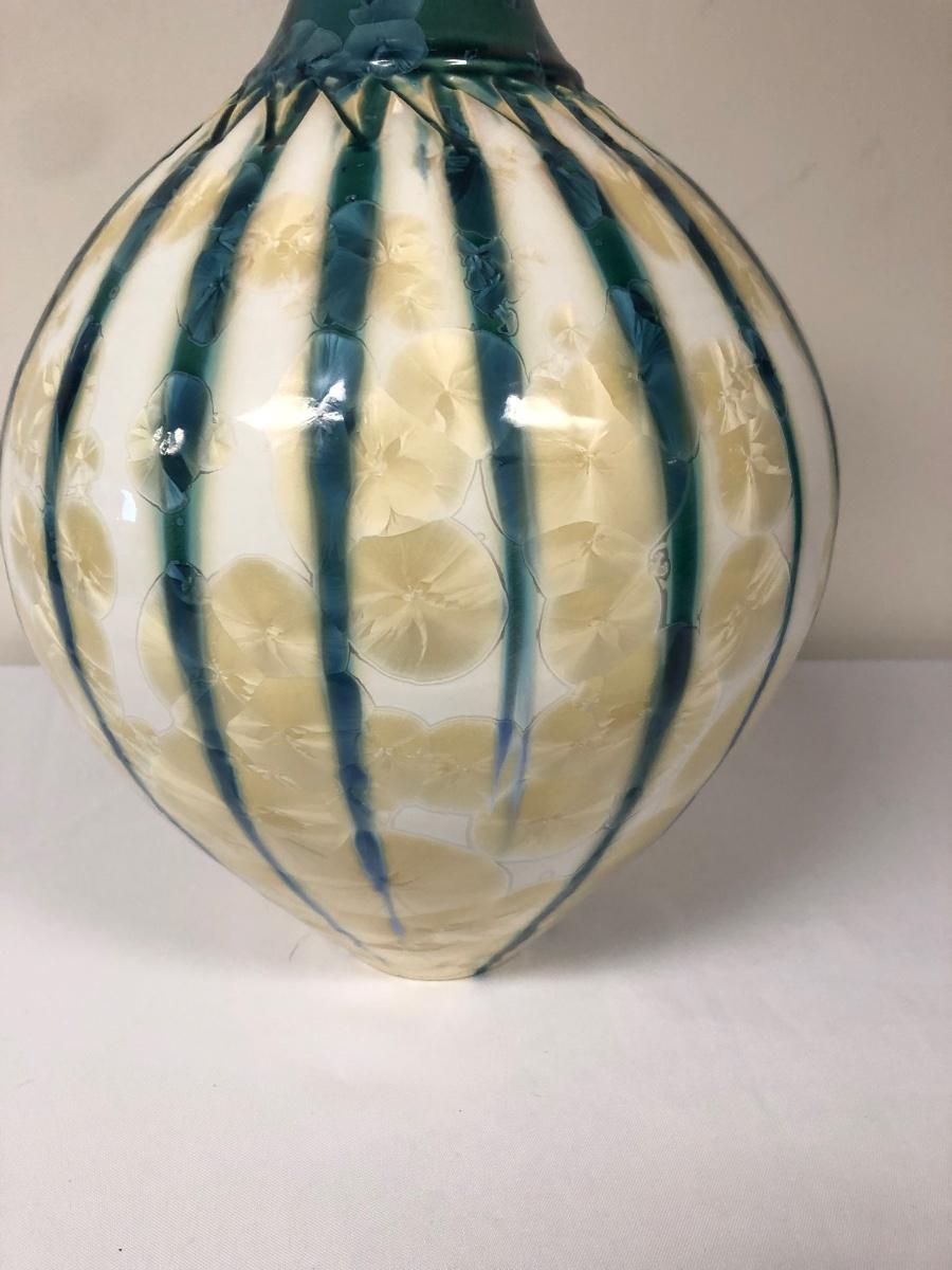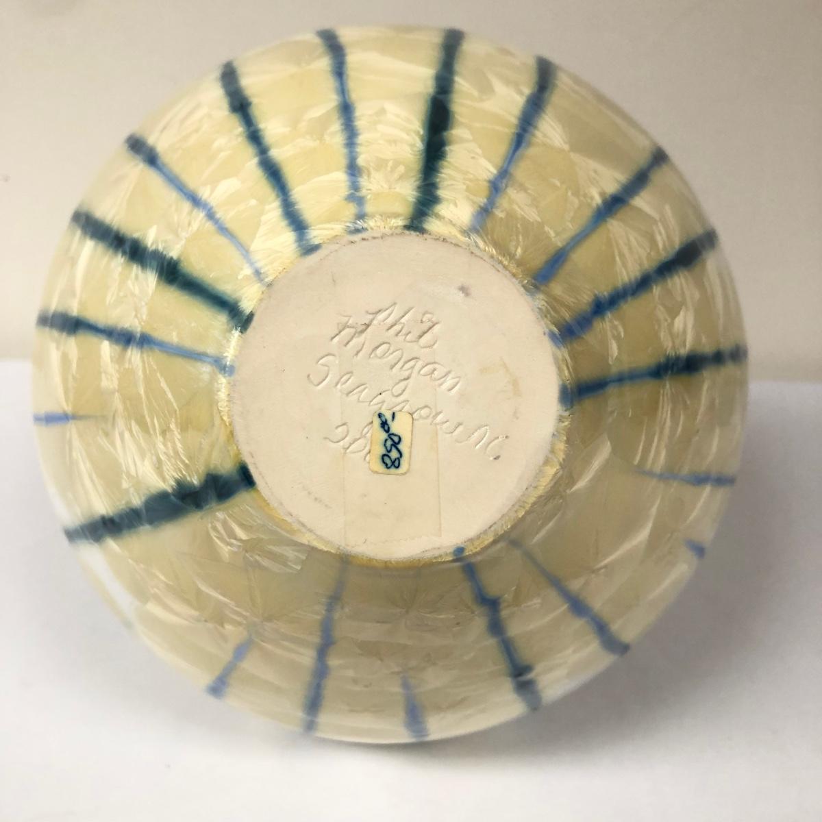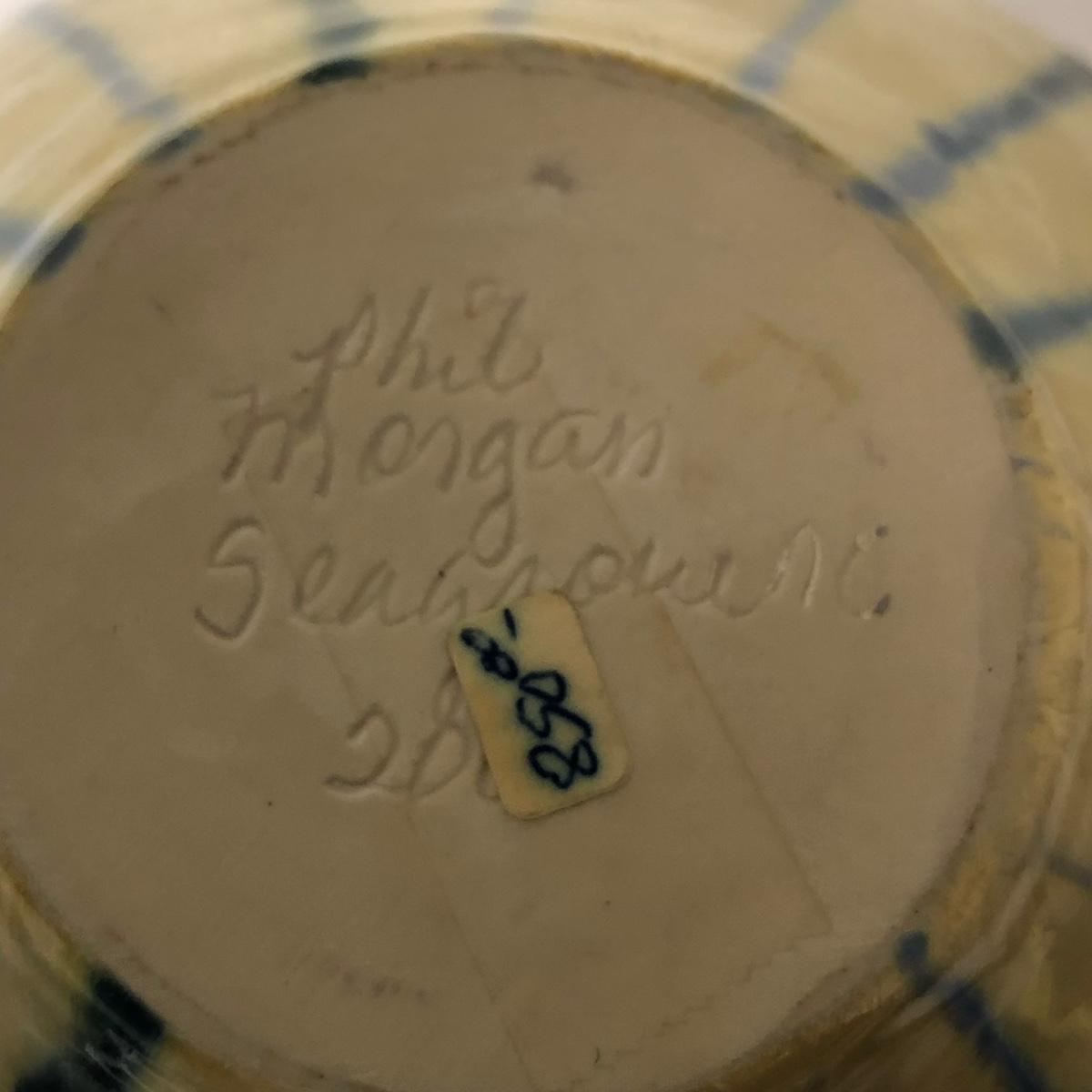 This Phil Morgan Seagrove NC Crystalline Pottery Vase measures 9.5” at the widest part of the base and is almost 15” tall. The bottom of the vase is signed with “Phil Morgan Seagrove NC” and has a price tag of $850. This exquisite vase has what appears to be pearl like flower petals in the design. Shipping Available.