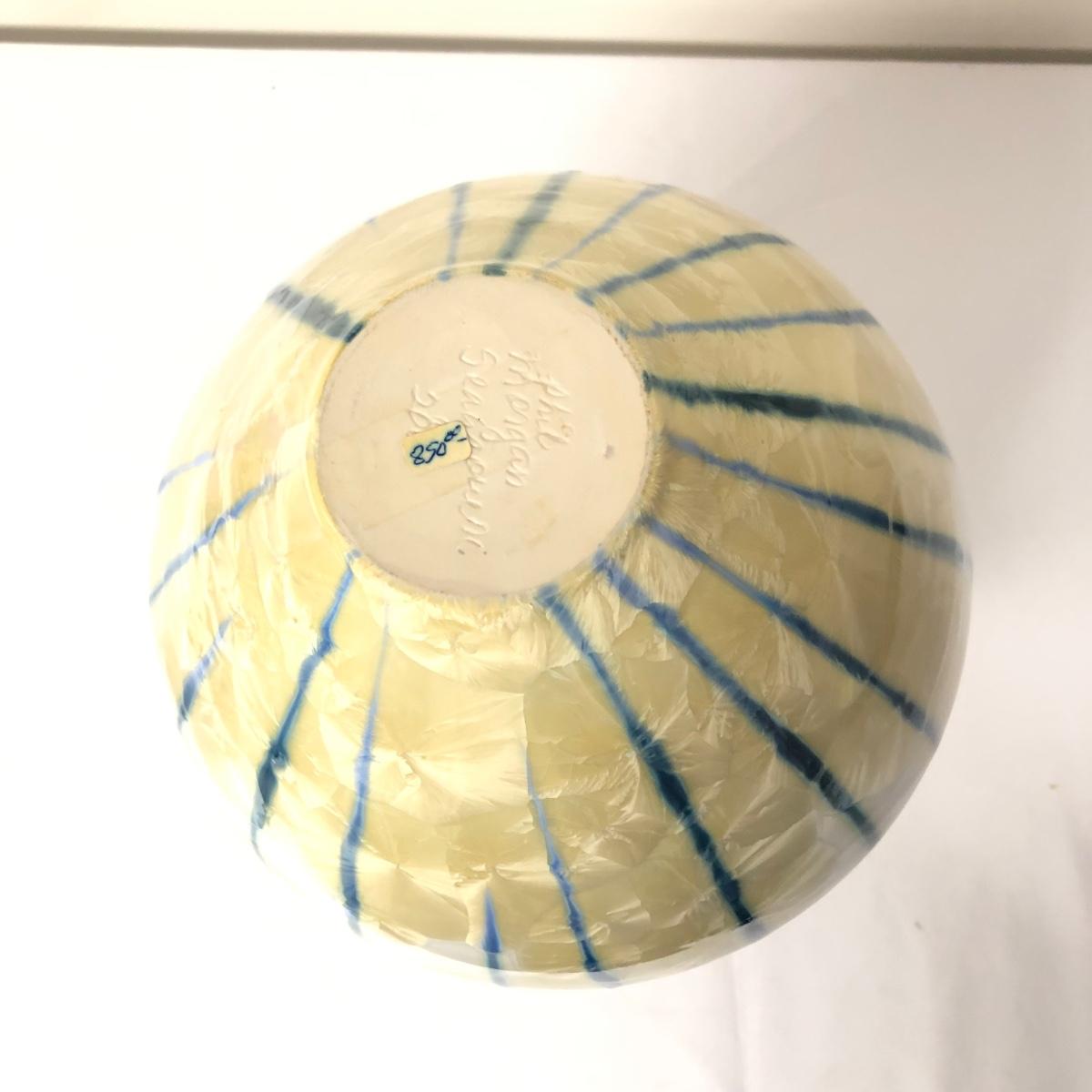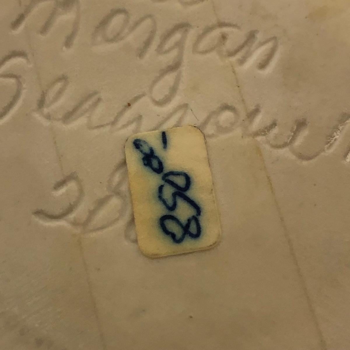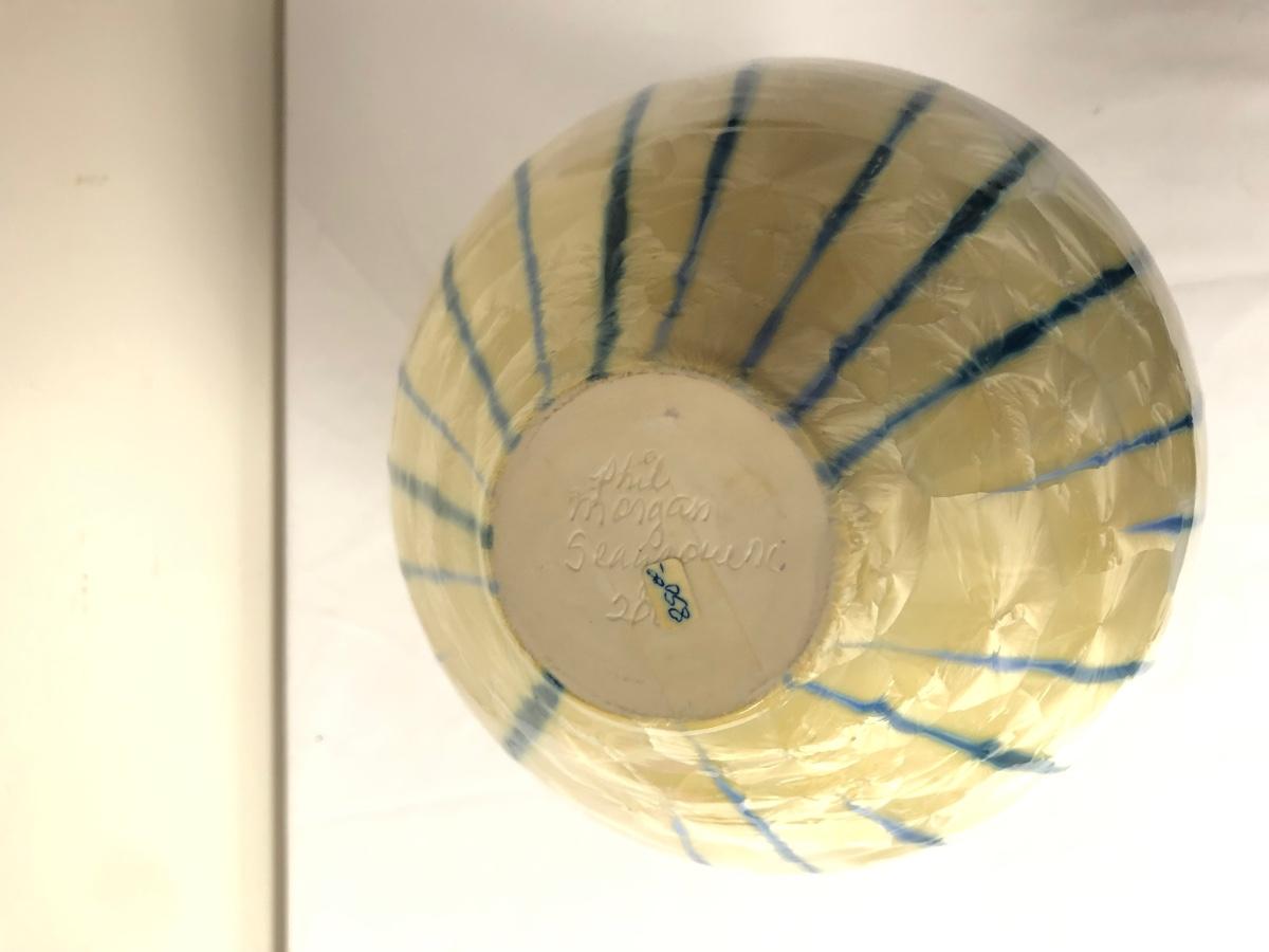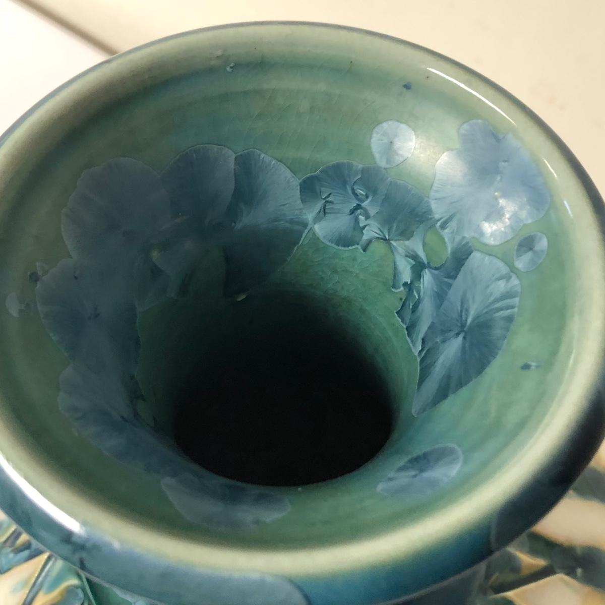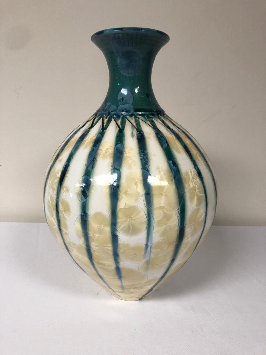 This Phil Morgan Seagrove NC Crystalline Pottery Vase measures 9.5” at the widest part of the base and is almost 15” tall. The bottom of the vase is signed with “Phil Morgan Seagrove NC” and has a price tag of $850. This exquisite vase has what appears to be pearl like flower petals in the design. Shipping Available.