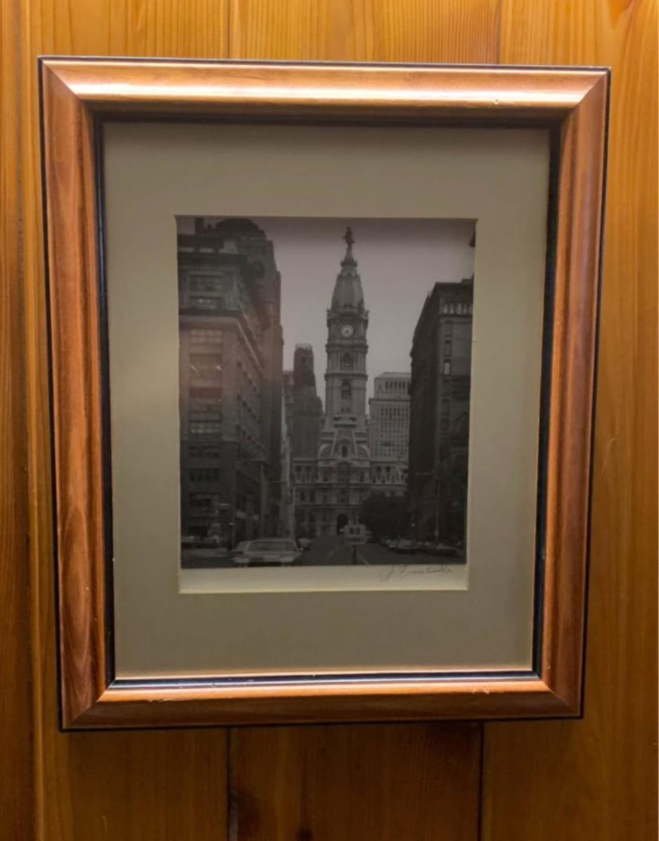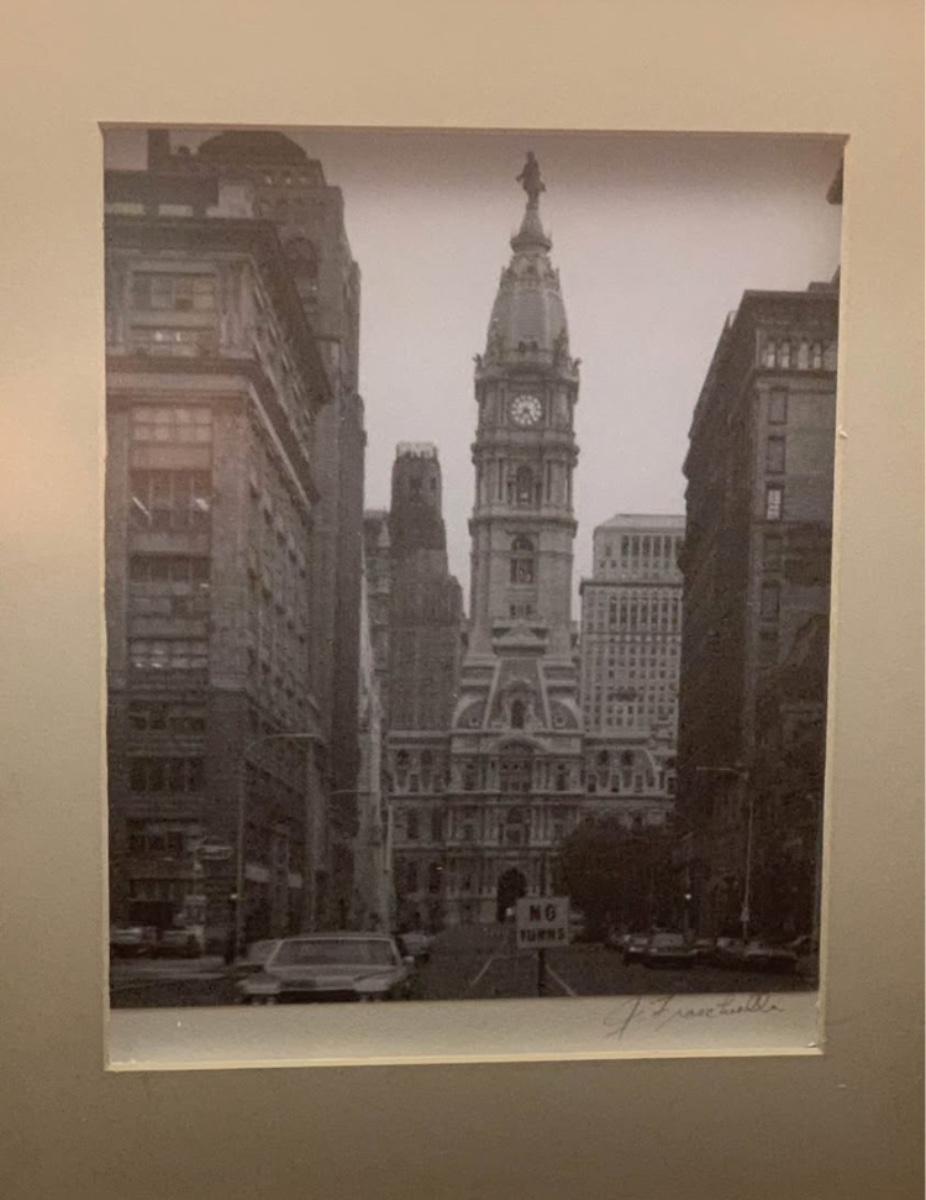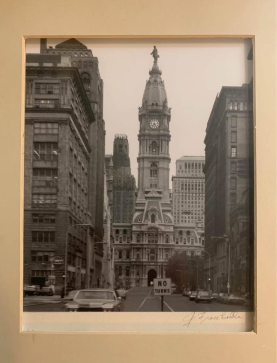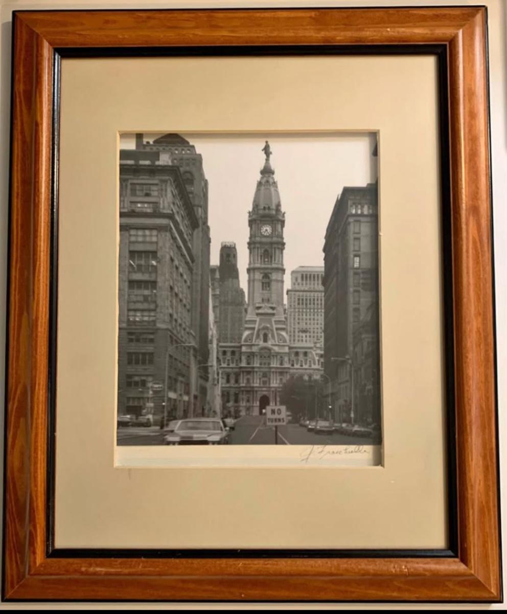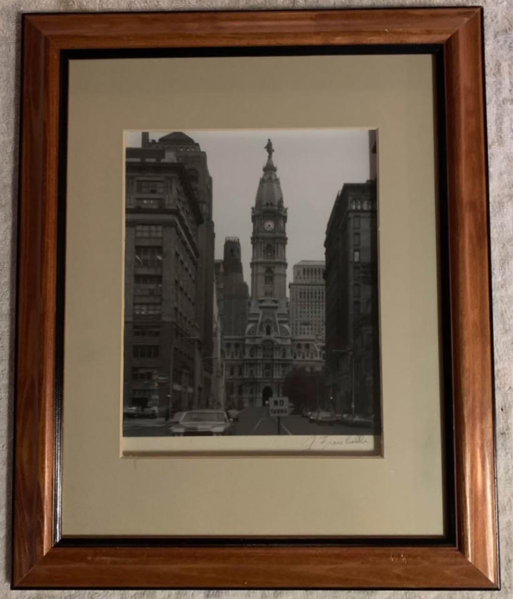 Beautifully framed black-and-white photograph of Philadelphia City Hall, taken by local photographer J. Fracchiolla.