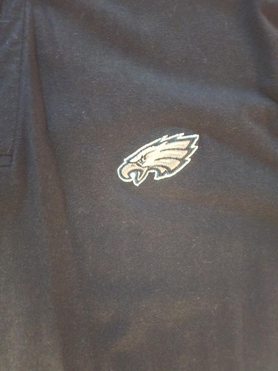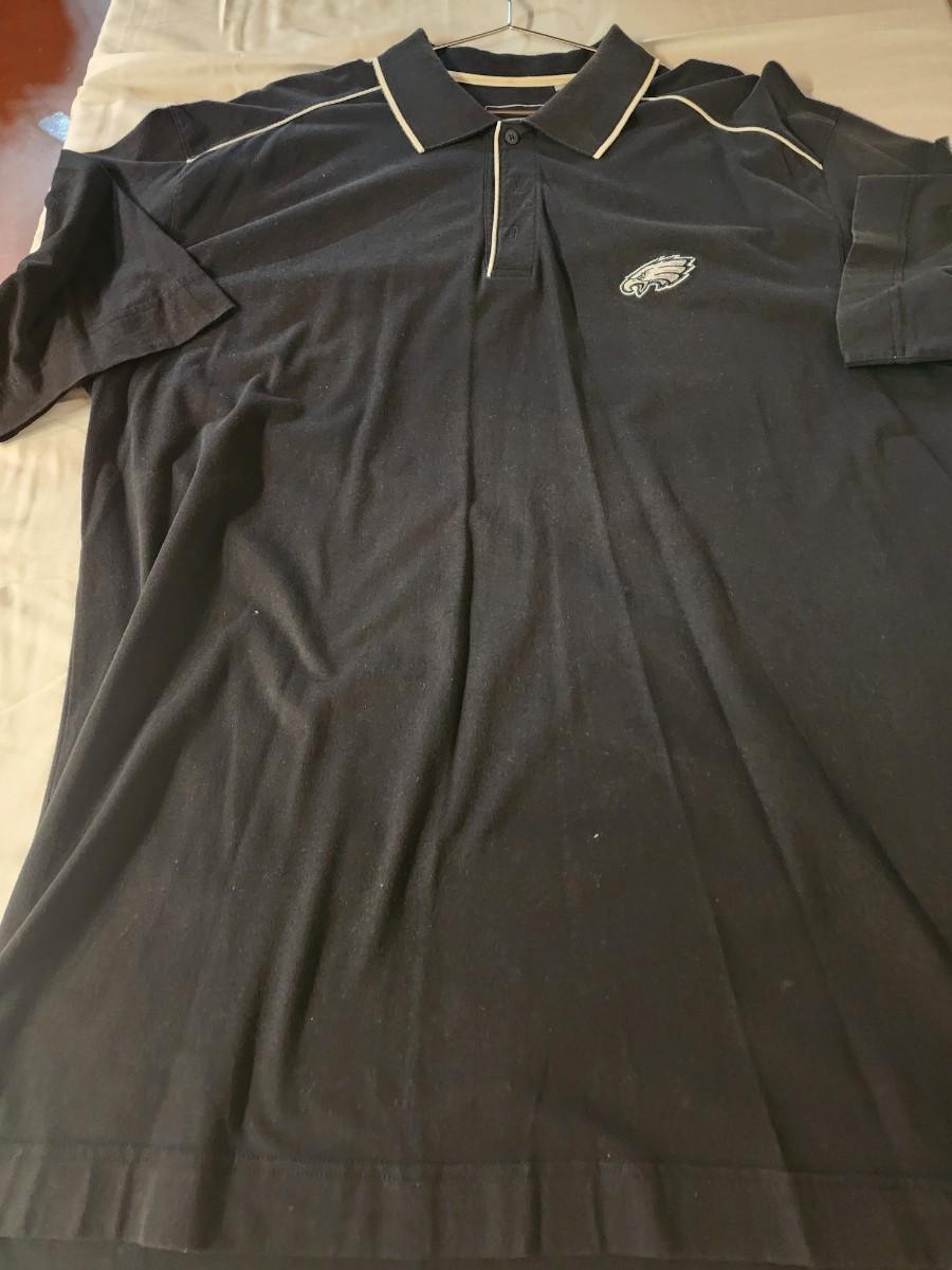 The product is a XXL Cutter & Buck polo shirt featuring the Philadelphia Eagles logo, designed for male fans of the National Football League (NFL) team. The black polo is officially licensed and perfect for showing support for the Eagles during football season. Made by a reputable brand known for quality sports apparel, this shirt is a must-have for any fan looking to represent their favorite team in style.